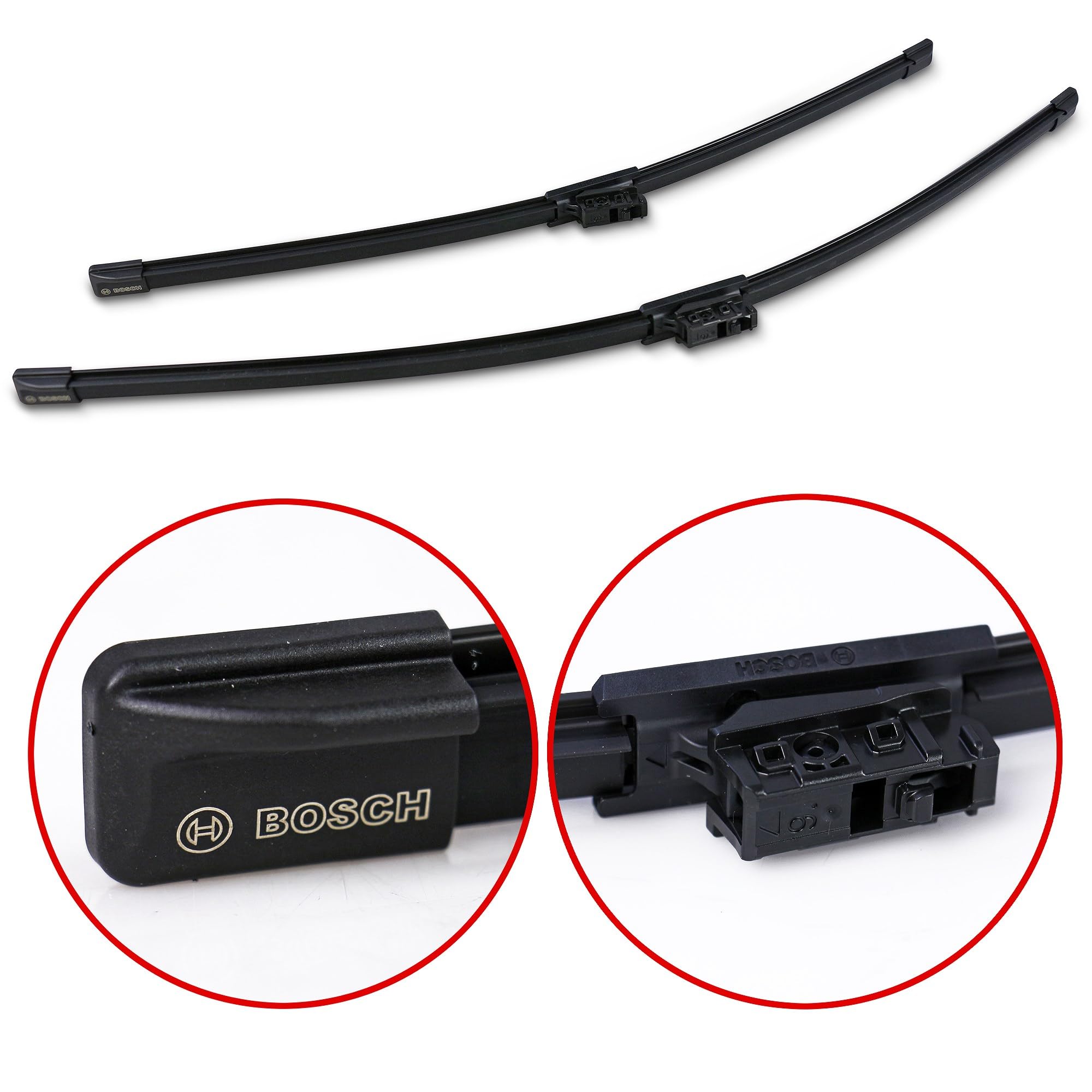 Bosch AeroTwin's patented beam design contains no metal or plastic brackets, joints or hinges, offering an ideal technology upgrade for vehicles originally fitted with conventional wiper blades. The specially blended dual rubber compound with graphite coating removes even the smallest traces of water for exceptional all-weather visibility and smooth, quiet operation. Specific beam curvature for OE specialty wiper arm types, coupled with dual precision-tensioned steel springs, ensures uniform pressure along the entire blade length for crystal clear visibility. Built-in asymmetrical wind spoiler uses air flow to increase blade-to-windshield contact - for consistent performance at highway speeds. Wind spoiler also serves to protect the tension springs from damage by severe weather elements for increased durability and long life. Pre-assembled OE style adapter provides OE fit and function for simple, easy installation on specific vehicles. Set of 2. Note: AeroTwin wiper blades are designed to fit vehicles with specific wiper arm connnection types - they are not universal fit wiper blades. Please verify specific vehicle fitment details with fit checker above.