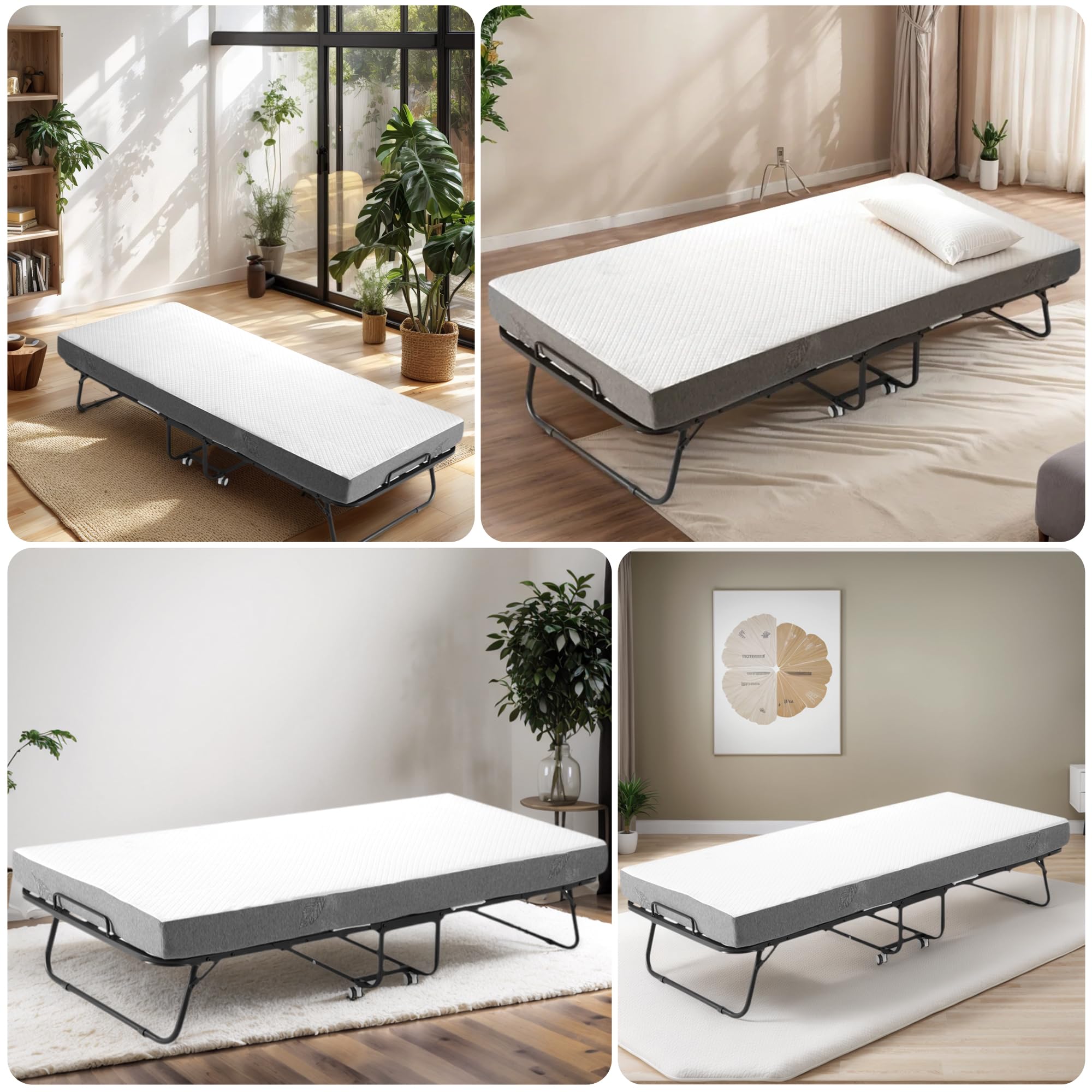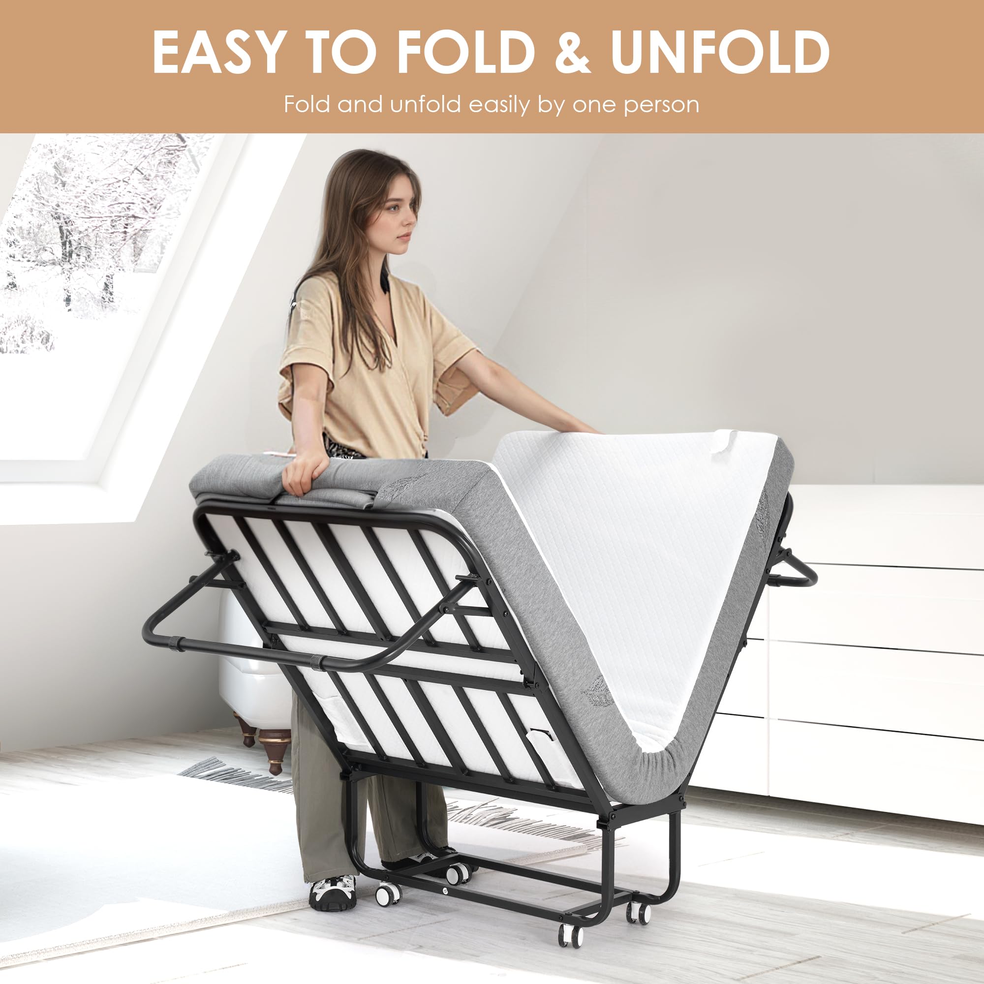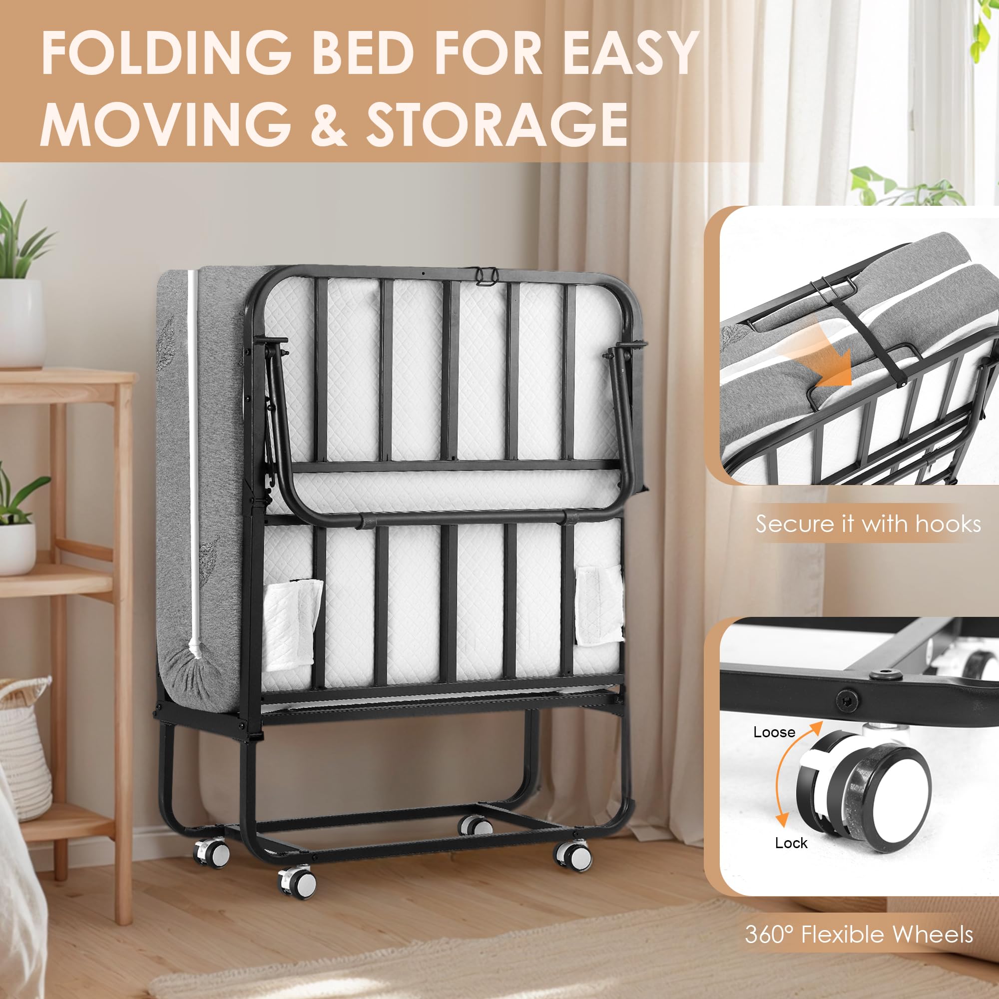 Space-Saving & Ready in a Flash: Measuring a compact 75" x 31", the Decofy folding bed is a genius solution for tight spaces;. Its clever design and smooth-rolling, lockable wheels mean you can easily move and store it in a closet, under a bed, or in any corner; Easy to fold and unfold; Perfect for impromptu overnight guests, dorm rooms, or small apartments where every inch counts