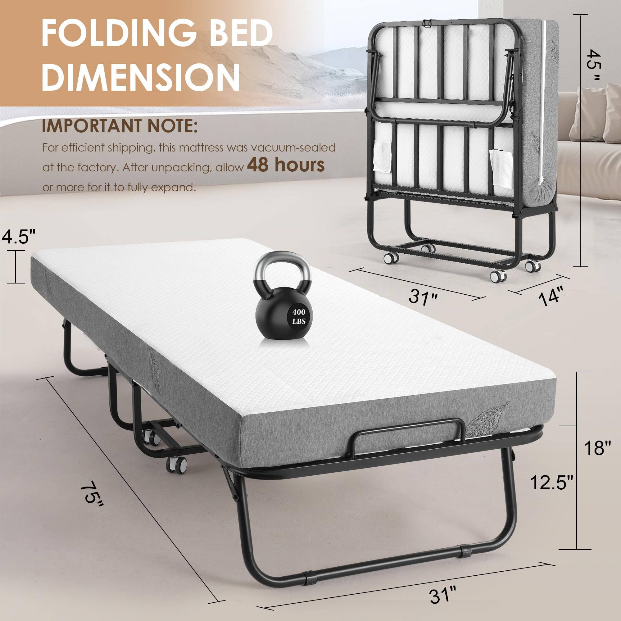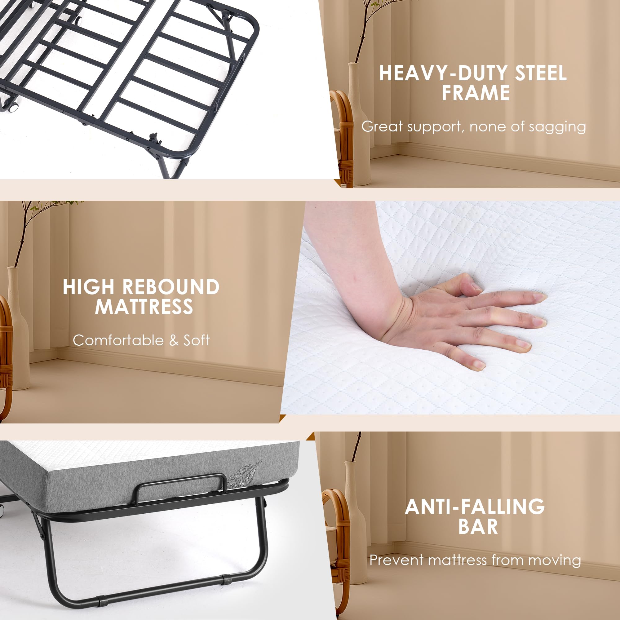 Built to Last: Rest easy knowing our rollaway bed is constructed with a heavy-duty, high-strength metal frame designed for exceptional durability; Capable of supporting up to 450 pounds, this folding bed delivers rock-solid stability, ensuring a safe and sound sleeping experience for any guest
