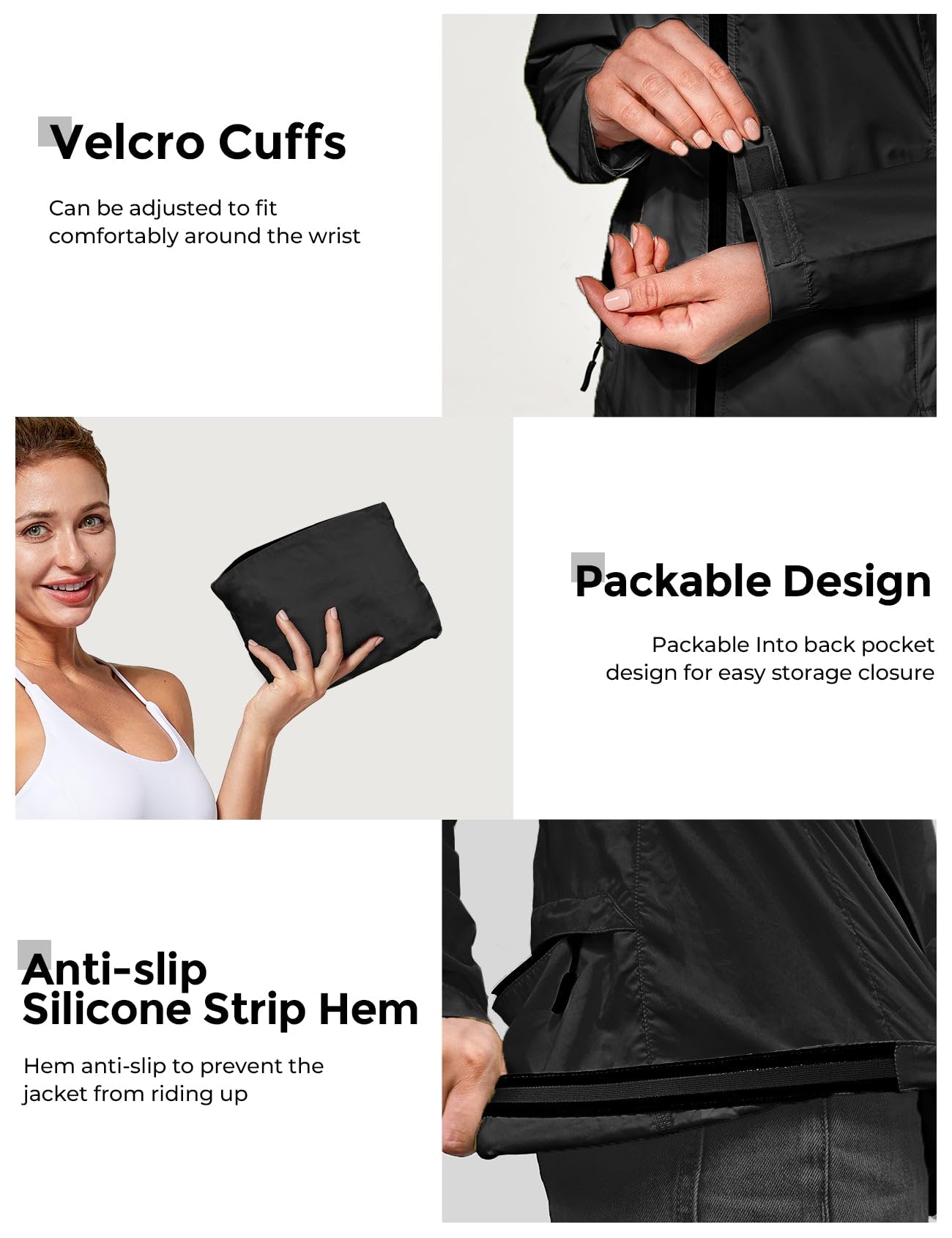 【Practical Designs】Hem anti-skid prevent jacket rides up; Packable Into back pocket design for easy storage closure and the wrist elastic band had a velcro adjustment on it to have the option of having to wear it loose or tight;Adjustable drawstring on waist to adjust the style of this running jackets which could naturally brings out your feminine curves