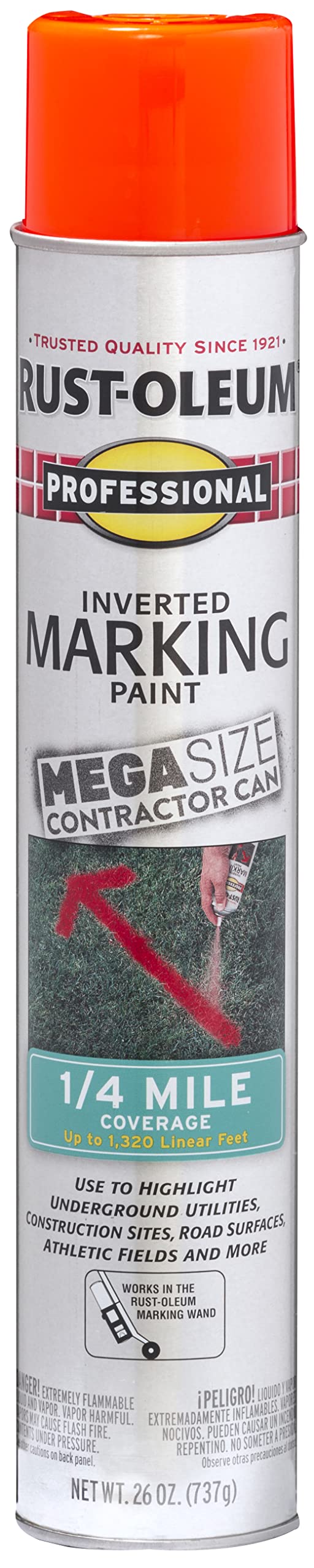 Rust-Oleum Professional Mega Marking Paint Quarter Mile Distance Fluorescent Red-Orange Spray is designed to mark surfaces including grass, dirt, gravel, wood, concrete and blacktop. Bright, vivid color offers high visibility and temporary resistance against general weathering. Indoor/outdoor coating is excellent for sports fields, parking lots and more. Mega contractor can size works with the Rust-Oleum Marking Wand for up to a quarter mile of coverage.
