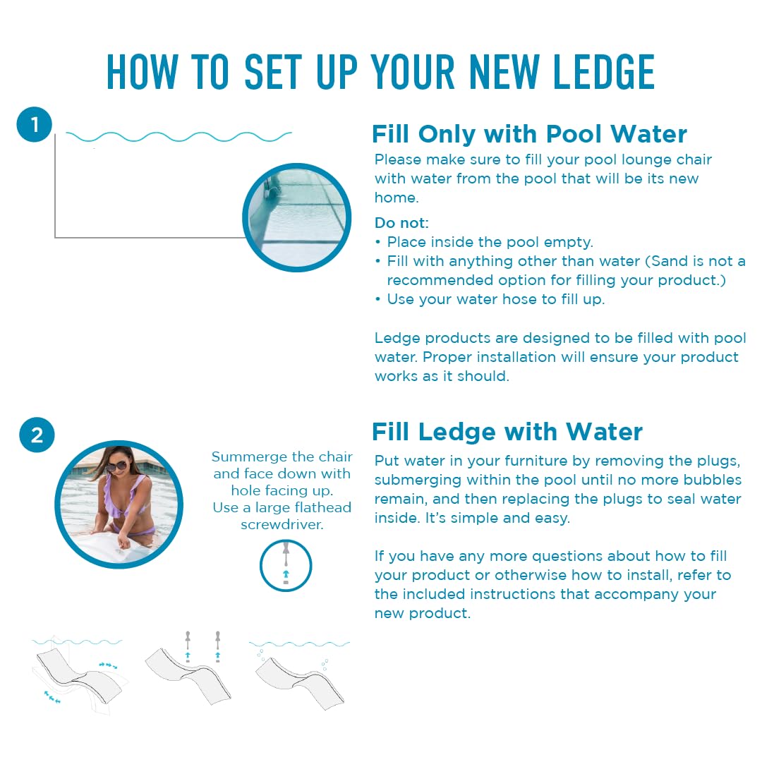 MINIMAL ASSEMBLY - Fill completely with water to avoid buoyancy in your pool by fully submerging and rotating in the water. Tilt the chaise as you place on your ledge to remove any bubbles or pockets of air away from the feet. Lay back and enjoy your own personal oasis.