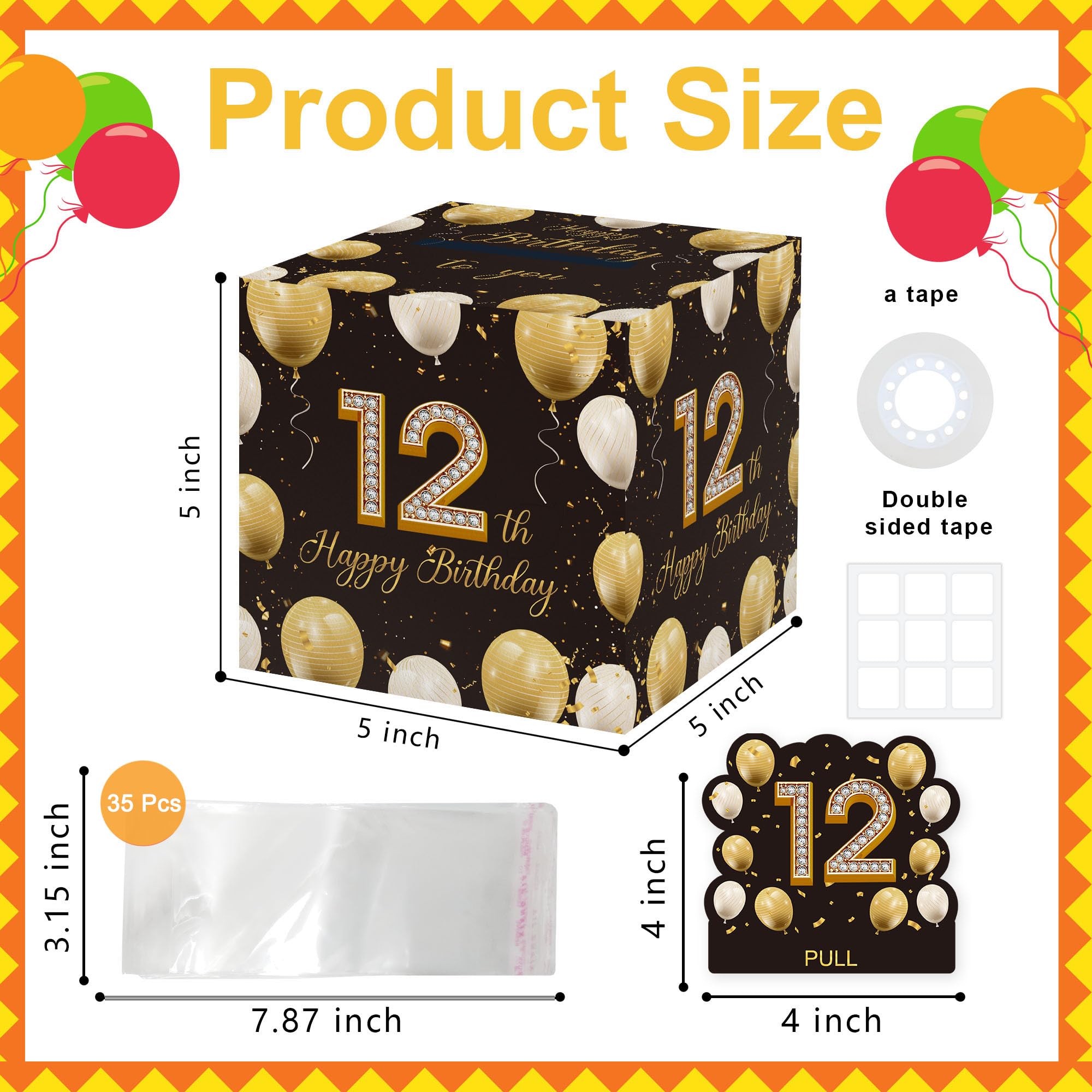 Surprise Gift Box: this gift box measures 5x5 inches, is made of durable cardboard. It also includes 2 theme-related shaped card(with adhere glue dots), 1 roll of transparent tape and 35 plastic pouches similar to the size of U.S. currency for easy placement of bills.
