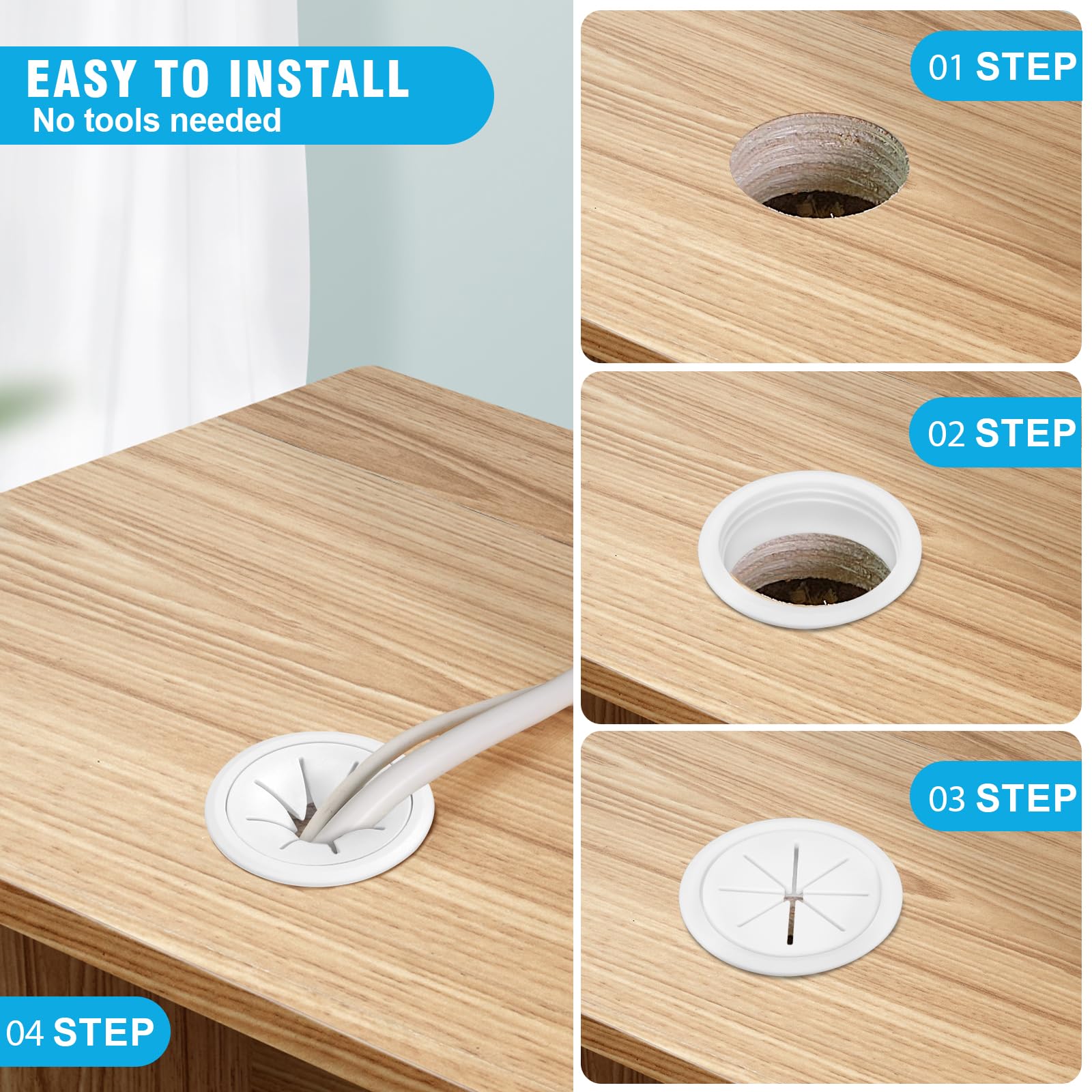 DELIGHTS PACKAGE -- Your package includes 6 x 2" desk grommets, 1 x 2" hole saw. Useful Tips: ① Start by vertically and slowly cutting a slot, ② Maintain even pressure while cutting, and keep your pace slow to avoid damaging the surface, ③ Periodically clean the desk grommet area to prevent accumulation of debris.