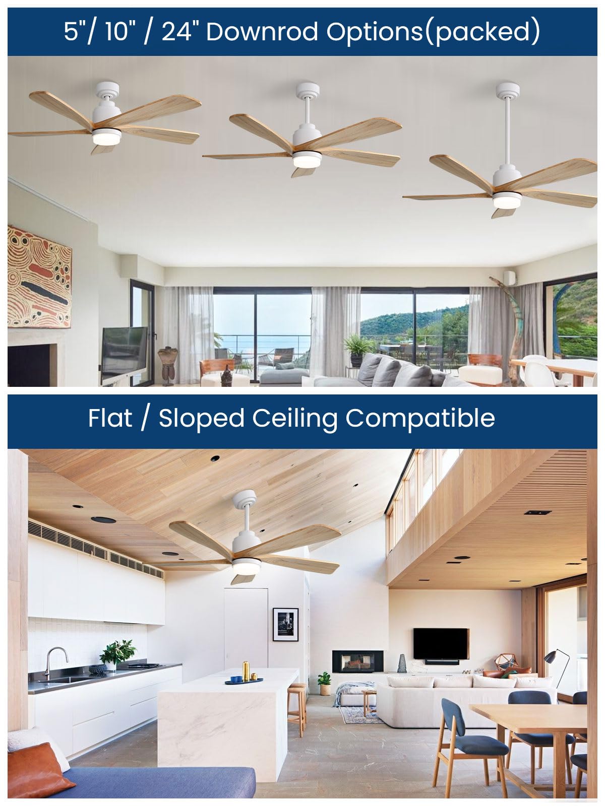 3 Downrods & 2 Installation Options: The 52 inch modern ceiling fan with light comes with 3 downrods of different lengths (5"/10"/24") and supports two installation methods: flat ceiling and sloped ceiling. Whether it’s a regular roof or attic structure, it can handle easily—offering more free installation options and a more coordinated space.