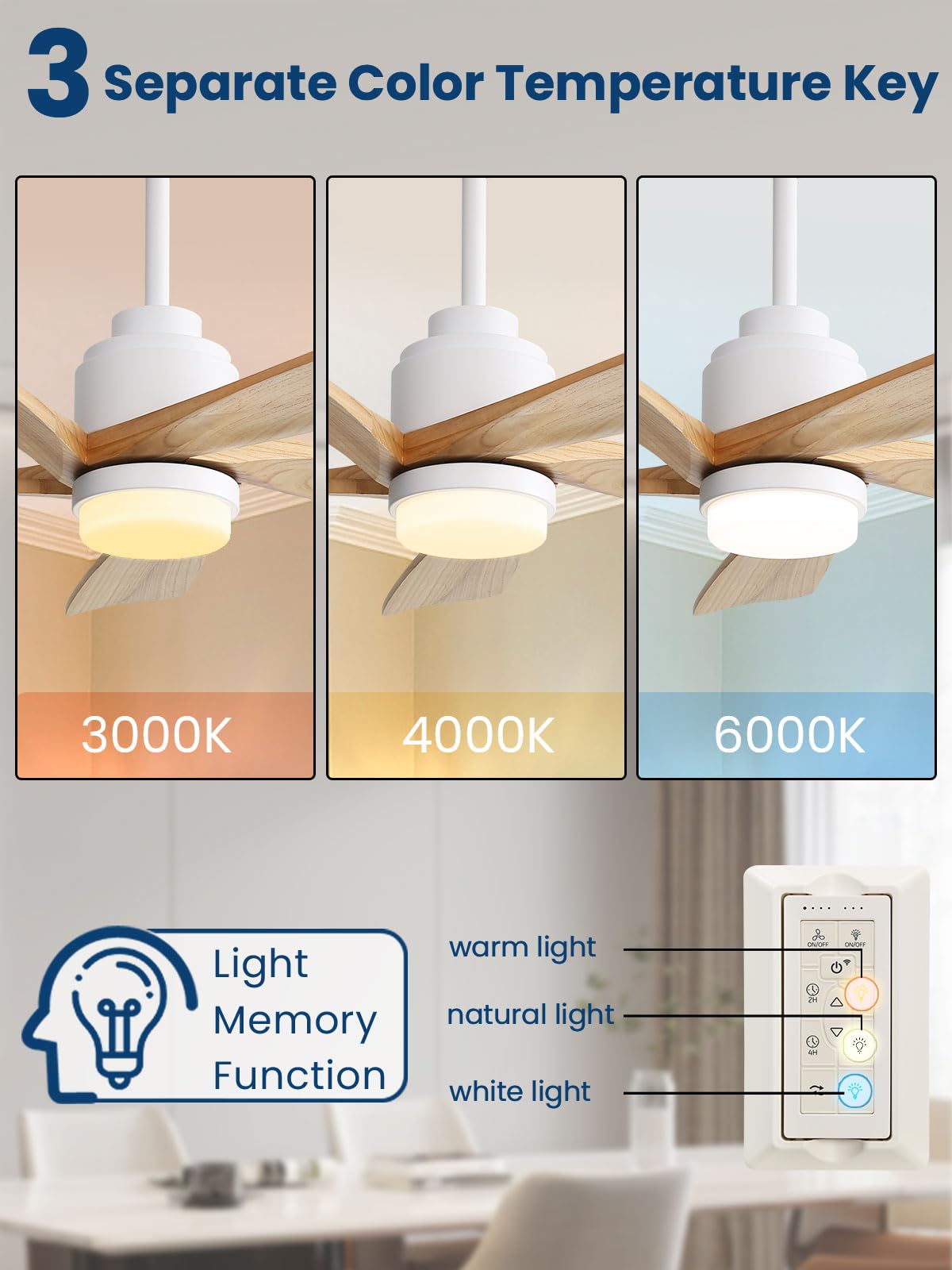 5 Blades & 6-Speed Wind: The 52 inch ceiling fans with lights adopts 5 streamlined solid wood blades, boasting a simple and modern look that blends perfectly with various home decor styles. It supports 6 speed settings and 2/4-hour timer shutdown function, meeting your needs at different times—accompanying you to sleep peacefully or stay awake comfortably.
