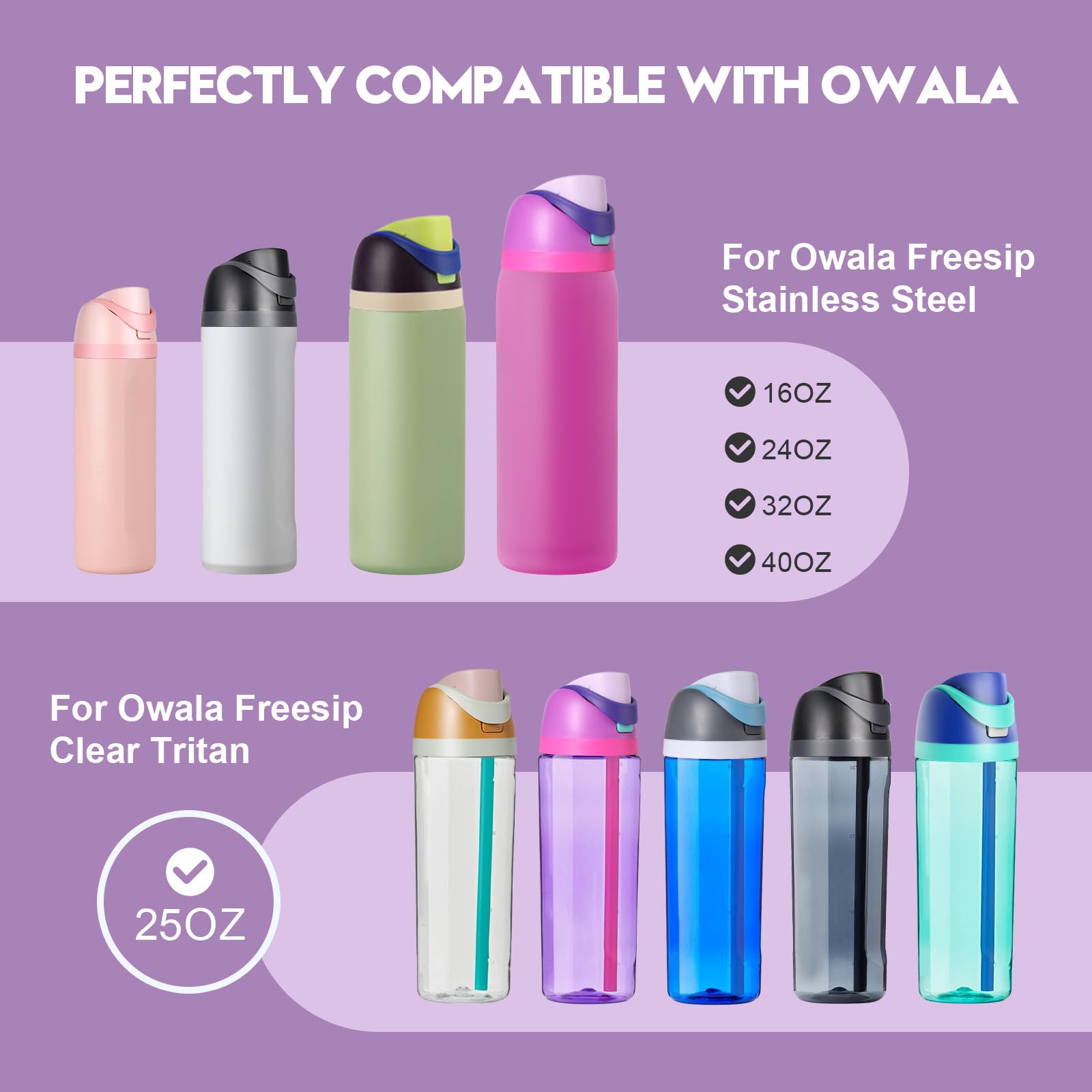 【Precise Compatibility】Specifically designed to fit Owala FreeSip Stainless Steel bottles (16oz/24oz/32oz/40oz) and 25oz Clear Tritan Plastic bottles. Always confirm your bottle model prior to purchase to ensure perfect fitment and performance.