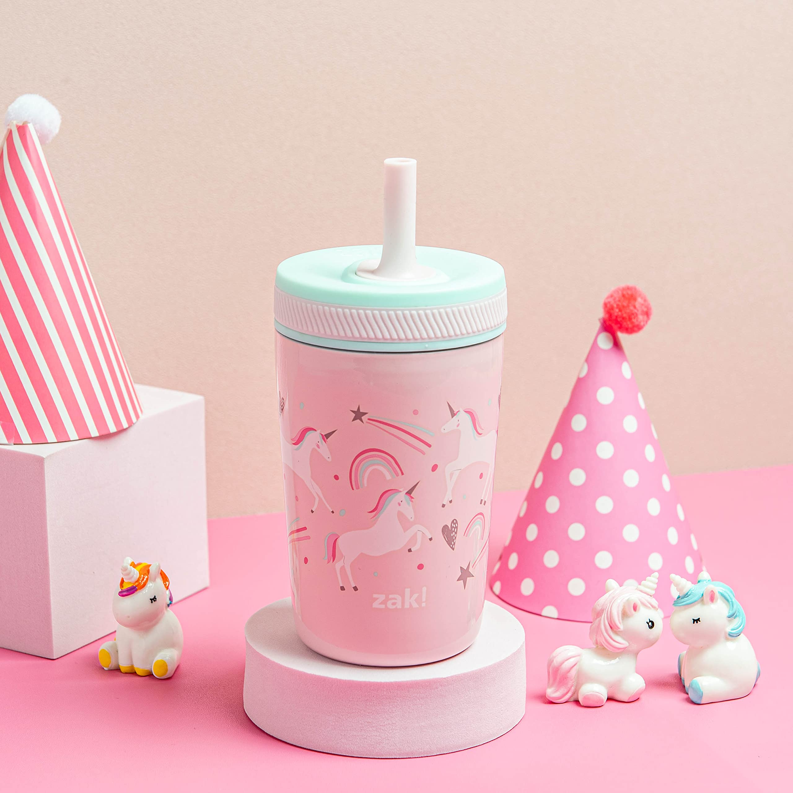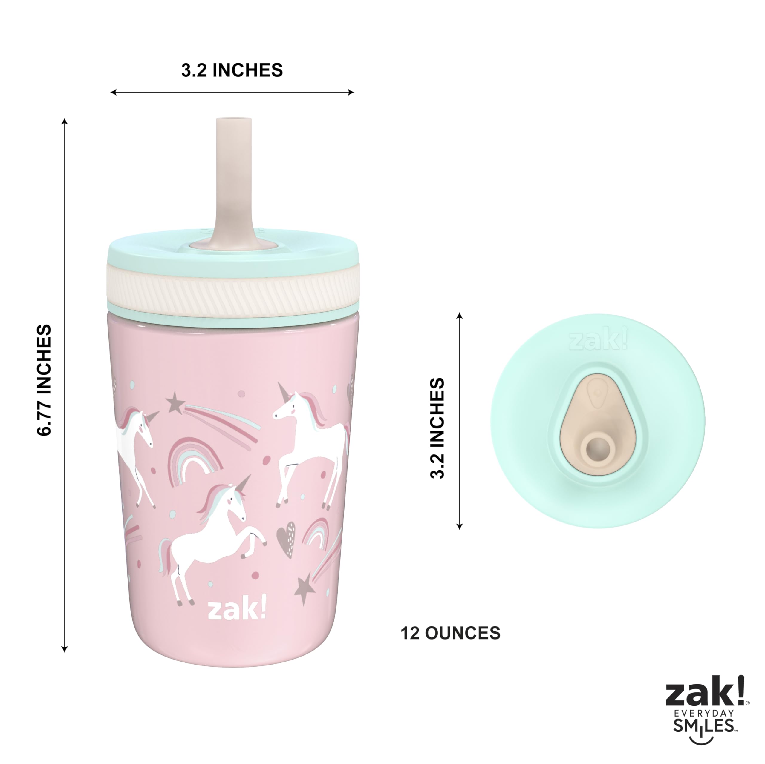 This leak-proof tumbler from Zak Designs makes hydration fun for kids! Durable Materials: The tumbler is made from food-grade, 18/8 stainless steel, and the comfortable straw is made from silicone. Everything is completely BPA free, and the lid can be disassembled for easy cleaning. Leak-Proof Straw: The straw spout has a built-in valve that allows liquid to flow when drinking and prevents spills when the tumbler is tipped over. It's perfect for travel or for young children graduating from sippy cups. Vacuum Insulation: The stainless steel tumbler has vacuum insulation that keeps drinks cold for up to 10 hours, so your water is always refreshingly chilled. The double-wall construction also prevents condensation from forming on the outer walls, eliminating messy water rings.Hydrate Anywhere: The tumbler won't splash or leak and fits in car cup holders, making it ideal to take on the go. At home, you don't have to worry about spills or stains around fabrics or electronics, and drinks stay easily accessible through the straw. Specifications: 12 oz capacity. Vacuum insulated. Made of durable stainless steel and silicone. BPA-Free - Zak is committed to safety. Hand wash tumbler, top rack washer safe, do not microwave. Length: 3.2-inch, Width: 3.2-inch, Height: 6.77-inch. Design: Fanciful Unicorn.