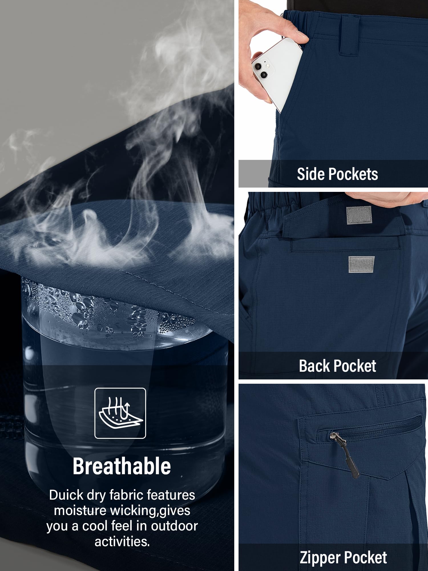 5 Zipper Pockets Hiking Shorts: Including 2 slash pockets, 2 flat pockets, and a back pocket. All the deep zipper pockets allows for secure storage of valuables like wallets cell phone and keys.