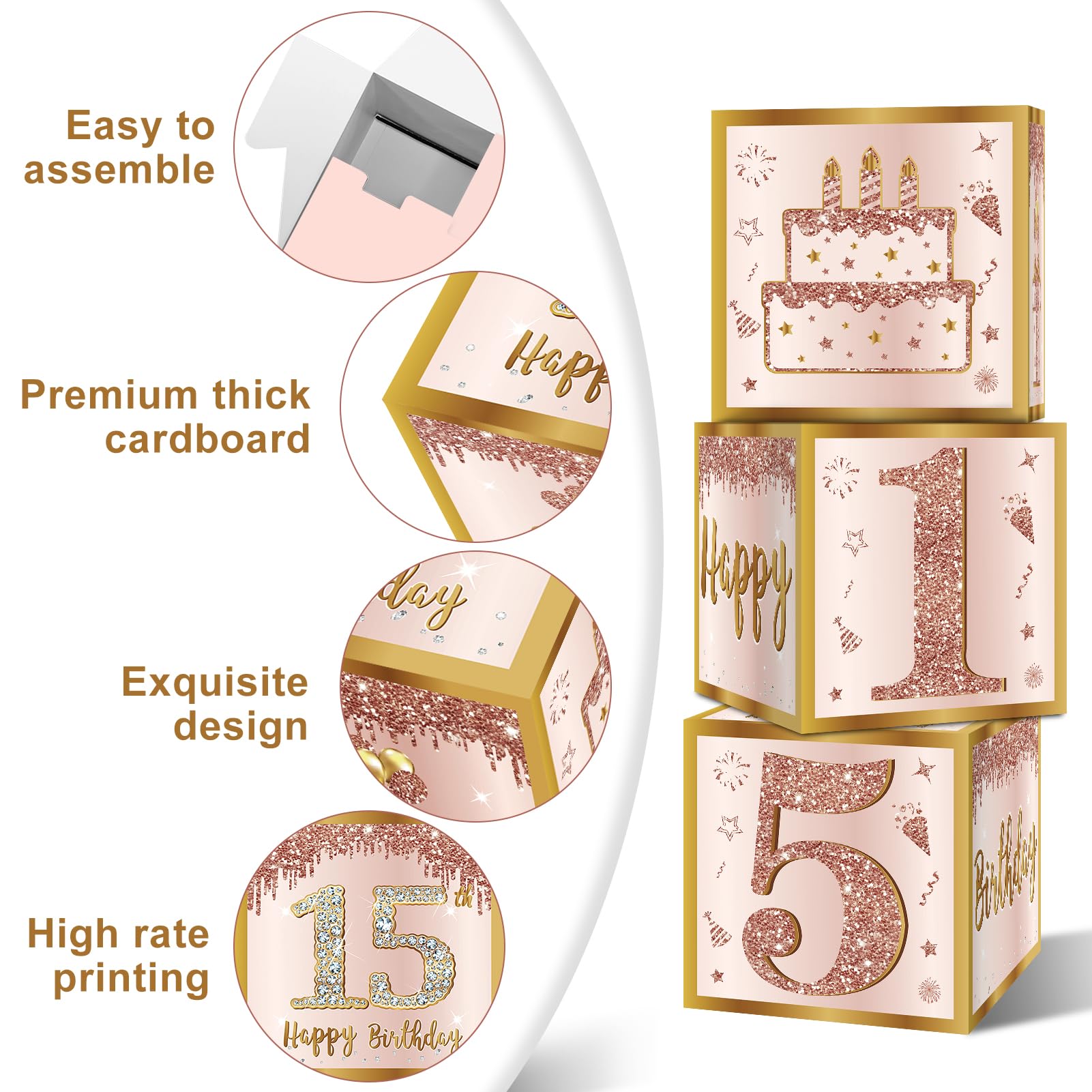 [Easy to Assemble] -These boxes are pre-folded and packed, you just assemble the box into a cube according to the current crease, and in a few minutes you will have 3pcs 15th birthday boxes!(Note: Color changes are possible due to differences in lighting/screen display.)