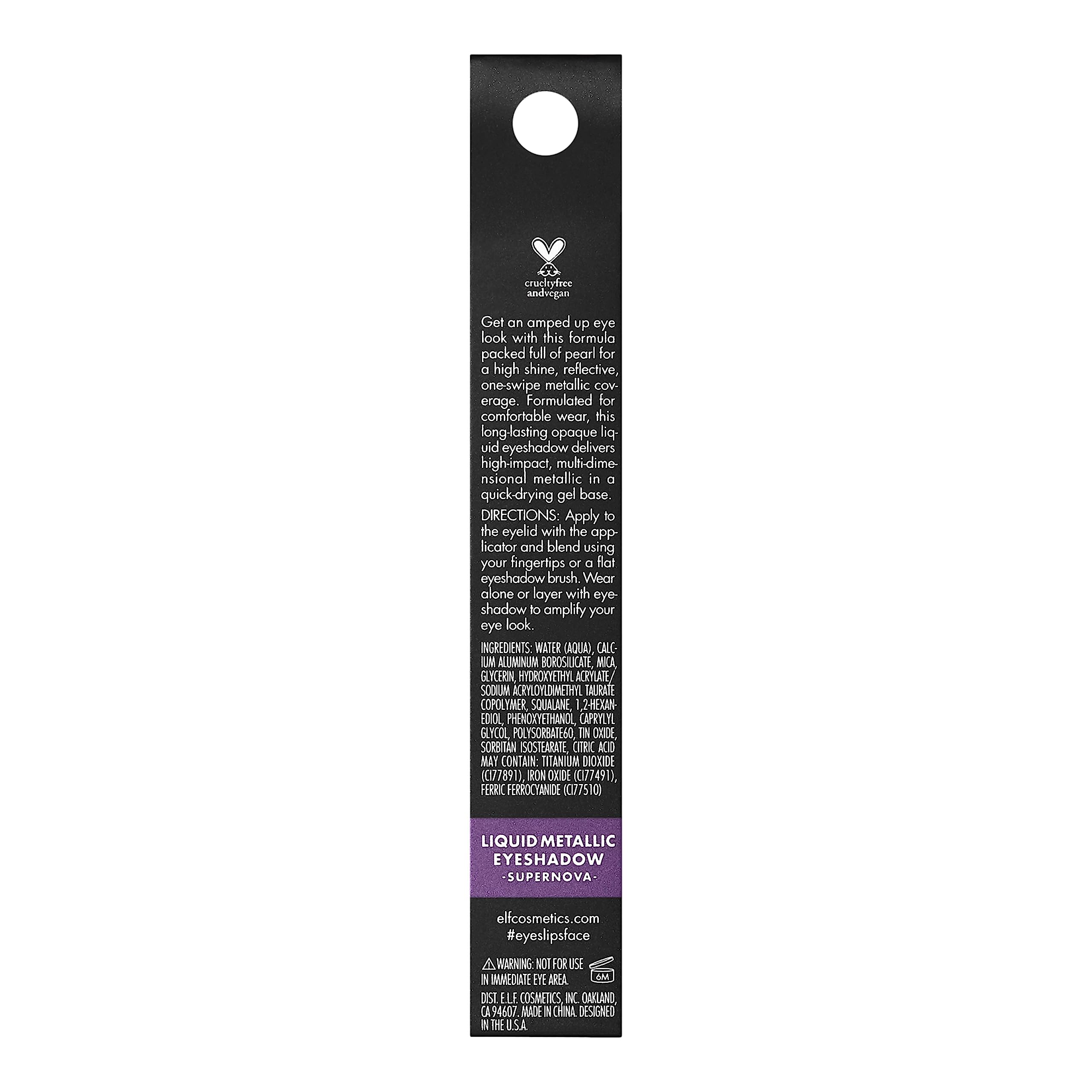 AMPED UP EYE LOOK: Get an amped up eye look with e.l.f. Liquid Metallic Eyeshadow! This liquid eyeshadow delivers a high-impact, metallic finish through multi-dimensional metallic pearls. The shade Supernova is Amethyst purple with light blue and lavender shimmer.