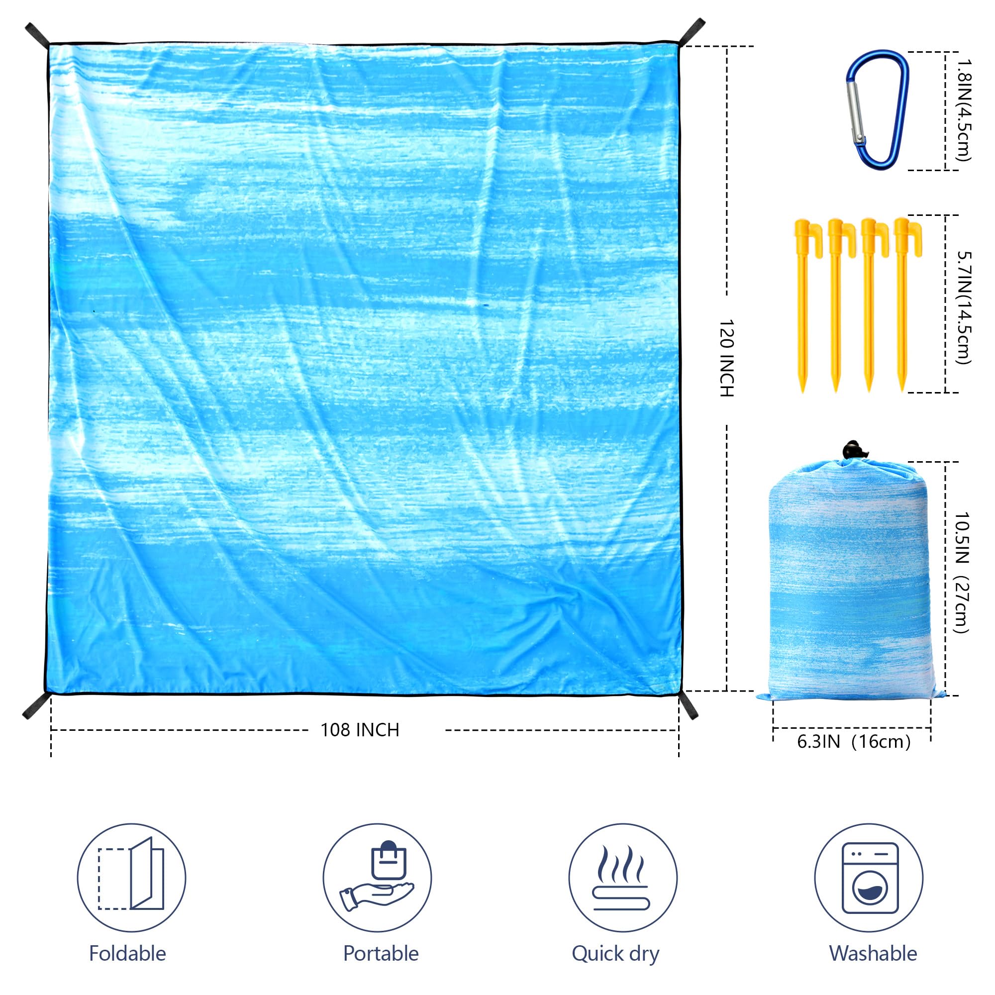 【Outside Beach Blanket】1 * Sand Proof Beach Mat;4 * Durable ABS Anchors Stakes; 1* Carabiner; 1 * Carry Bag.