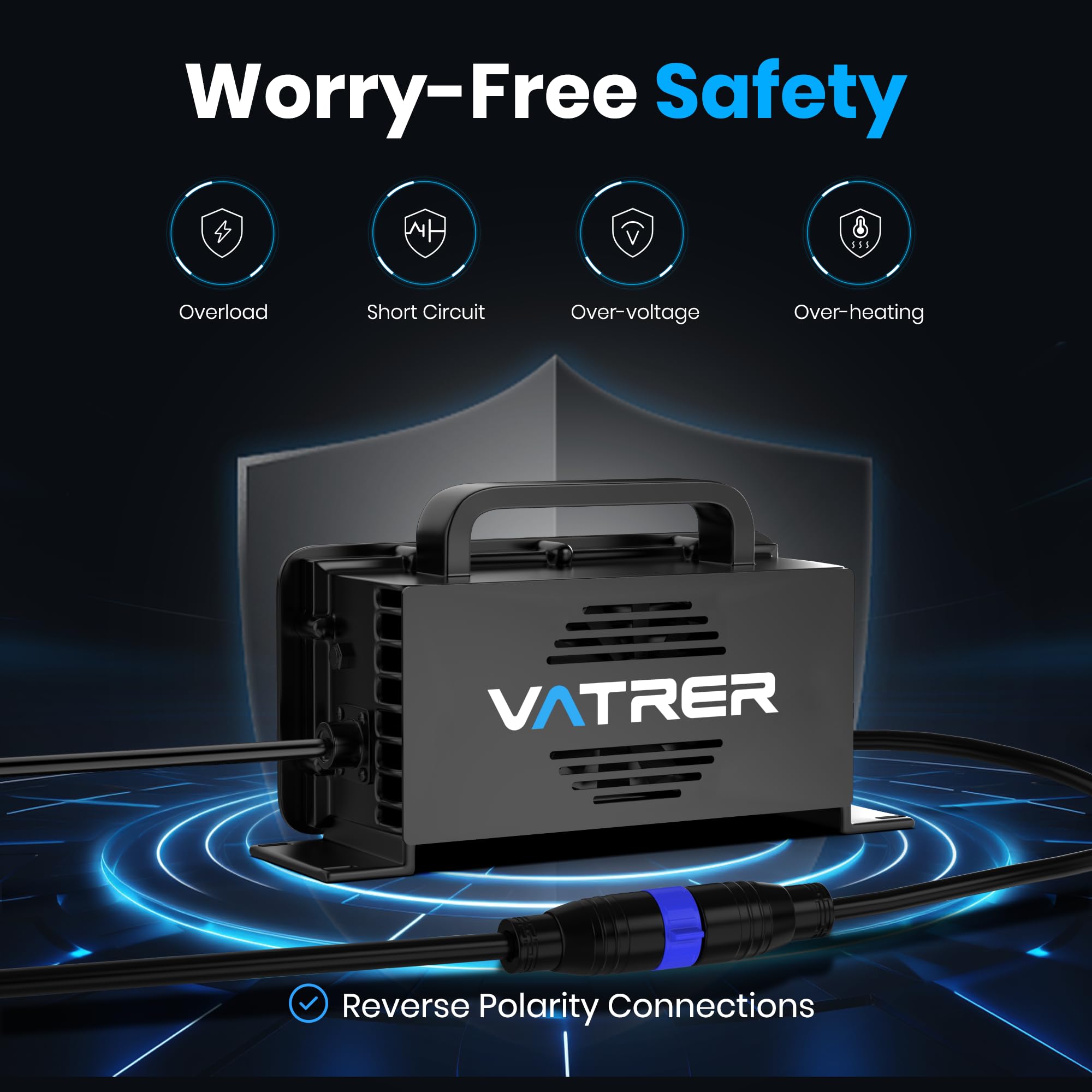 【Comprehensive Safety Protections】This advanced smart charger is engineered with multiple built-in safety mechanisms to ensure secure and reliable operation. Key protective features include: Over Voltage Protection (OVP), Over Current Protection (OCP), Short Circuit Protection (SCP), Overheat Protection (OTP), Reverse Polarity Protection (RPP).