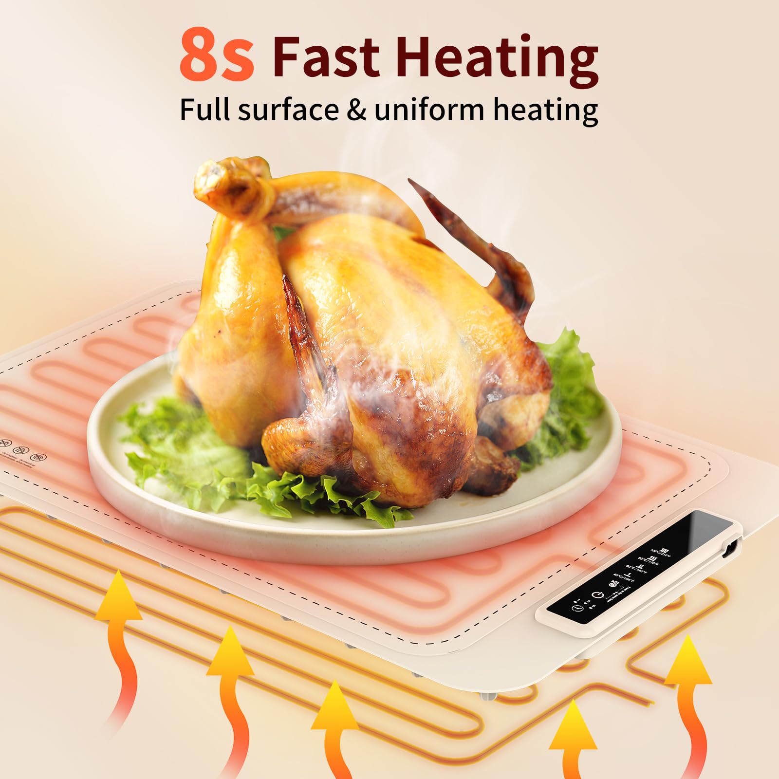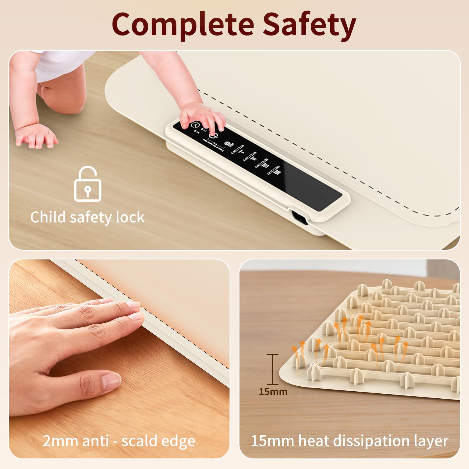 【15mm Elevated Base and Heat Protection】The 15mm high feet improve airflow for better heat dissipation and protect countertops. Built-in insulation allows safe use on heat-sensitive surfaces, ensuring your food heating pad remains stable, efficient, and worry-free.