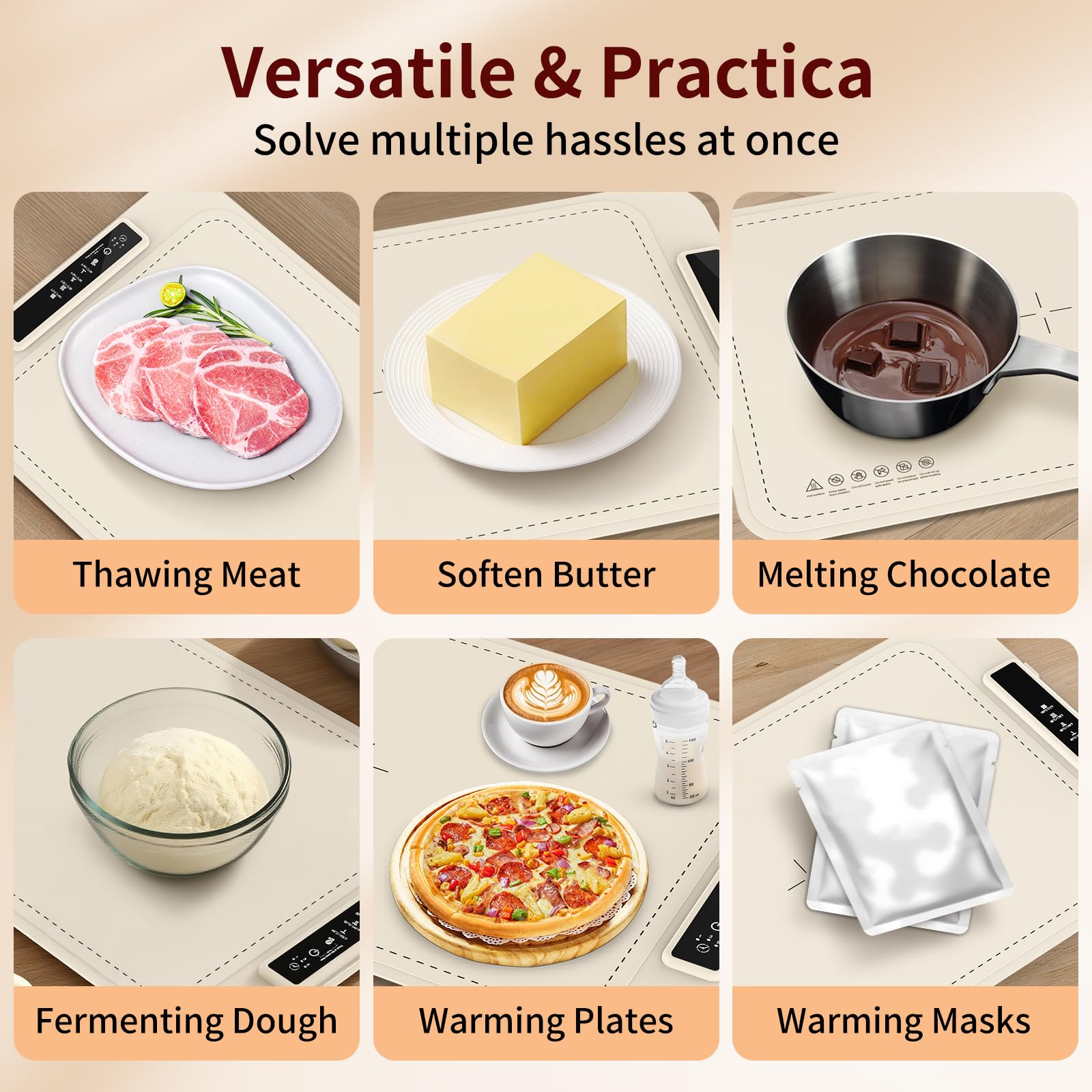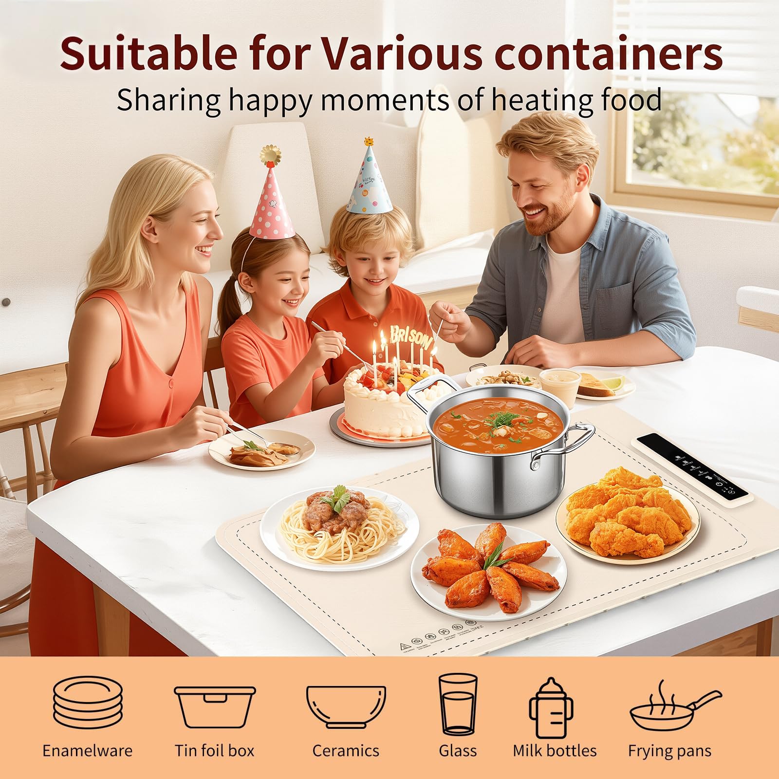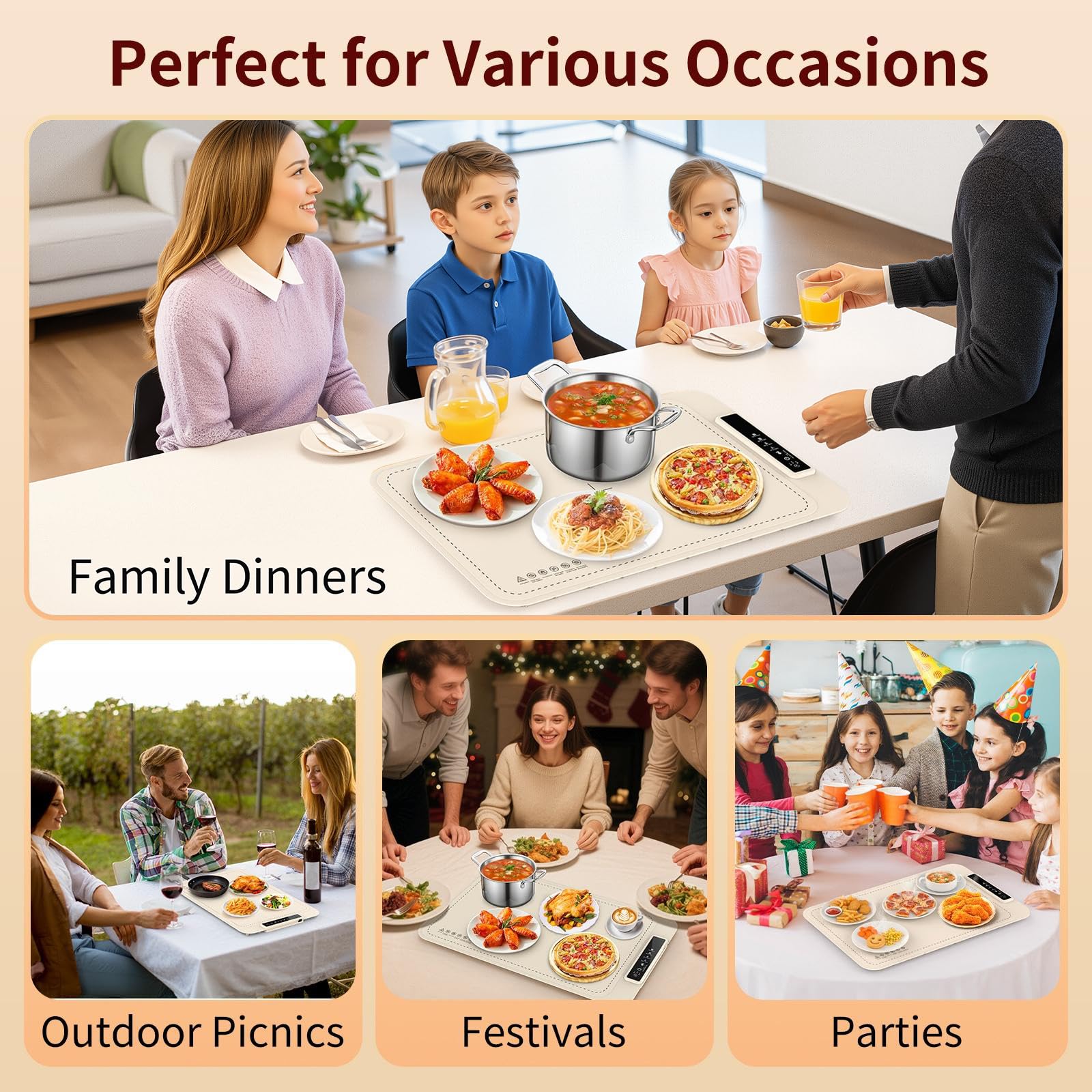 【Universal Compatibility and Multi-Functional Use】Compatible with metal, ceramic, and glass plates. Multi-functional for warming food, defrosting, dough fermentation, or heating beverages, making it a versatile electric warming mat for family dinners, holiday parties, and seasonal events.
