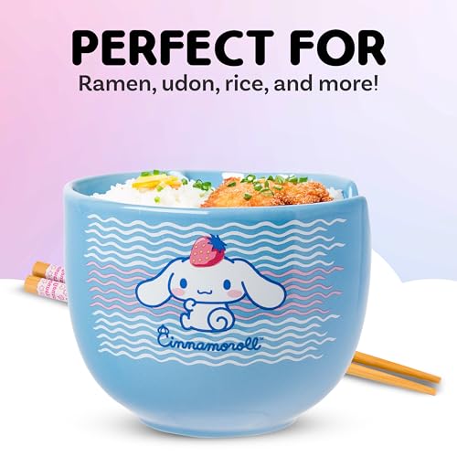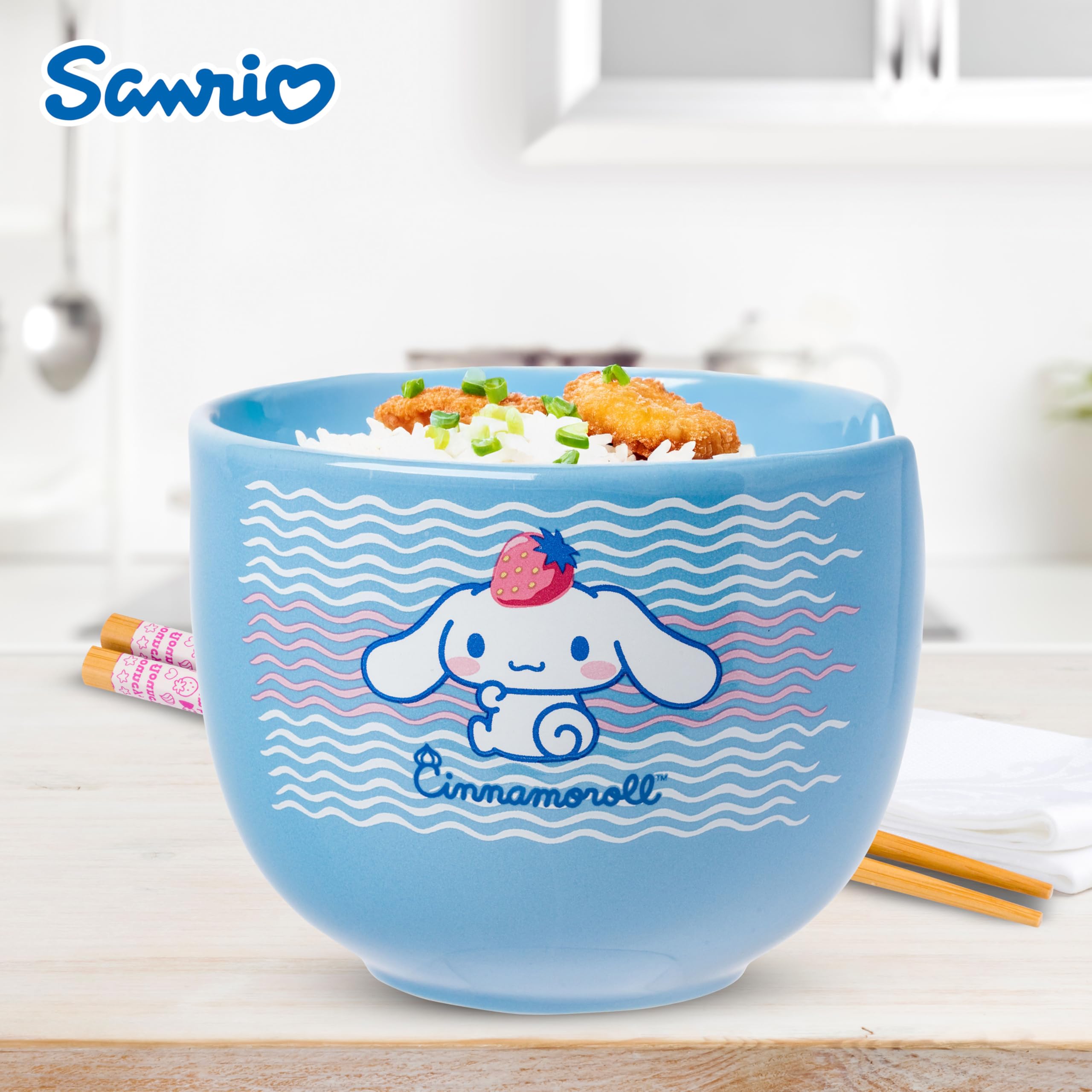 Quench your appetite for cuteness with our Silver Buffalo Sanrio Cinnamoroll Strawberry Hat Wavy Stripes Blue Ceramic Ramen Noodle Bowl with Chopsticks. Dive into the world of Cinnamoroll as you indulge in your favorite noodle dishes, soups, rice bowls and more, served in this charming 20 oz bowl. Adorned with Cinnamoroll's iconic strawberry hat and wavy stripes on a soothing blue backdrop, this bowl adds a touch of whimsy to every meal. Paired with matching Cinnamoroll chopsticks, this set is perfect for both personal use and gifting. Get ready to savor delicious meals in the company of everyone's favorite fluffy puppy, Cinnamoroll! Bowl is microwave and dishwasher TOP-RACK SAFE, chopsticks are HAND WASH ONLY. Take your fan experience to the next level with Silver Buffalo, a brand dedicated to delivering cherished official character merchandise. Through collaborative efforts, we pioneer unique, creative, and groundbreaking products, with detail and innovation. At Silver Buffalo, our pride lies in crafting extraordinary, playful items that forge a connection between fans and their beloved characters, superheroes, movies, TV series, and beyond. Celebrate your fandom!
