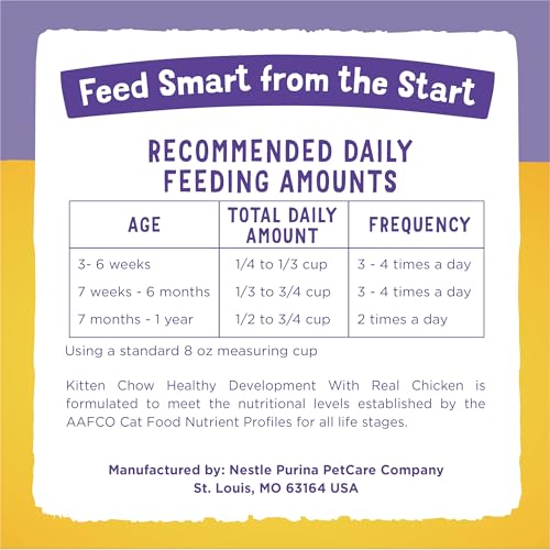 Get your kitten off to the right start with Purina Kitten Chow Nurture dry kitten food. Our high protein kitten food contains essential nutrients like those found in mother's milk to help your young cat grow healthy and strong. High-quality protein, including delicious real farm-raised chicken, helps support the development of lean muscles. Plus, DHA in Purina Kitten Chow dry cat food supports her brain and vision development. Because this Purina kitten food is made with high-quality ingredients, you can be confident knowing she's getting great nutrition. The delicious flavor in this cat dry food gives her the taste she wants along with a formula made without artificial flavors or colors. You can feel good knowing you are giving her a cat food for kittens formulated to encourage a healthy appetite. Nurture your growing kitten by giving her the 100 percent complete and balanced nutrition she needs with Purina Kitten Chow Nurture dry kitten food.