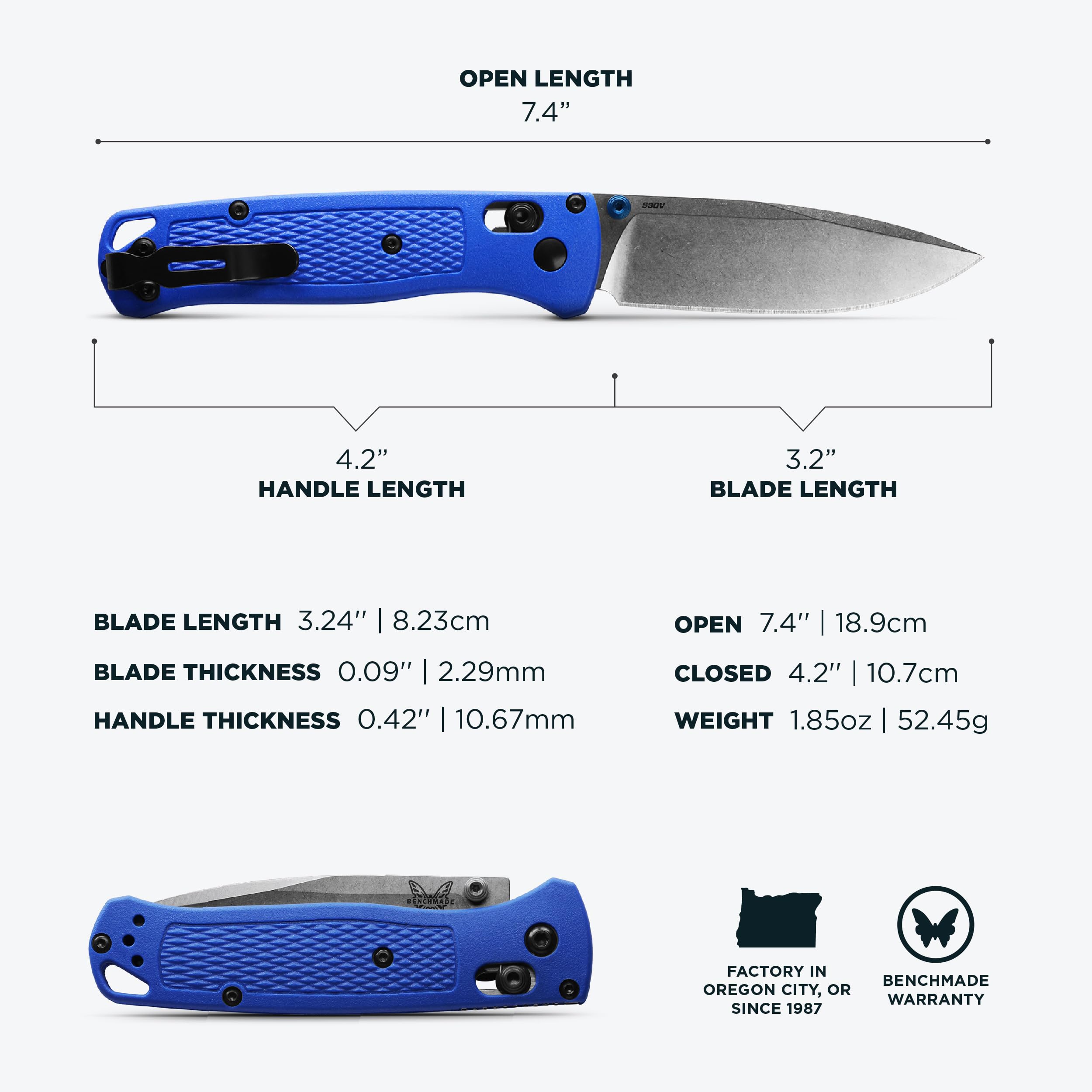 CPM-S30V STEEL: For first-rate edge retention and corrosion resistance; Precision drop-point construction for strength and versatility. Factory in Oregon City, Oregon.