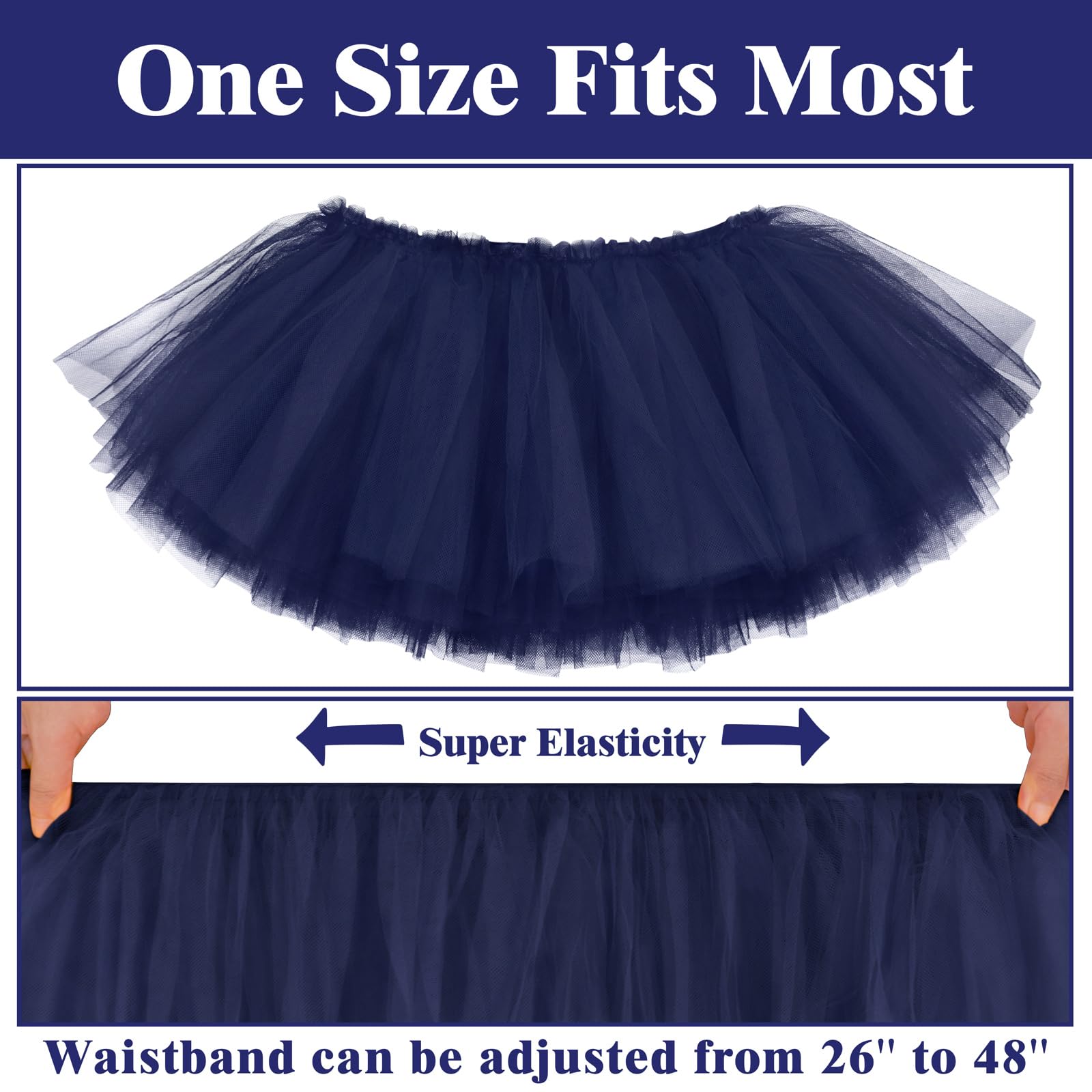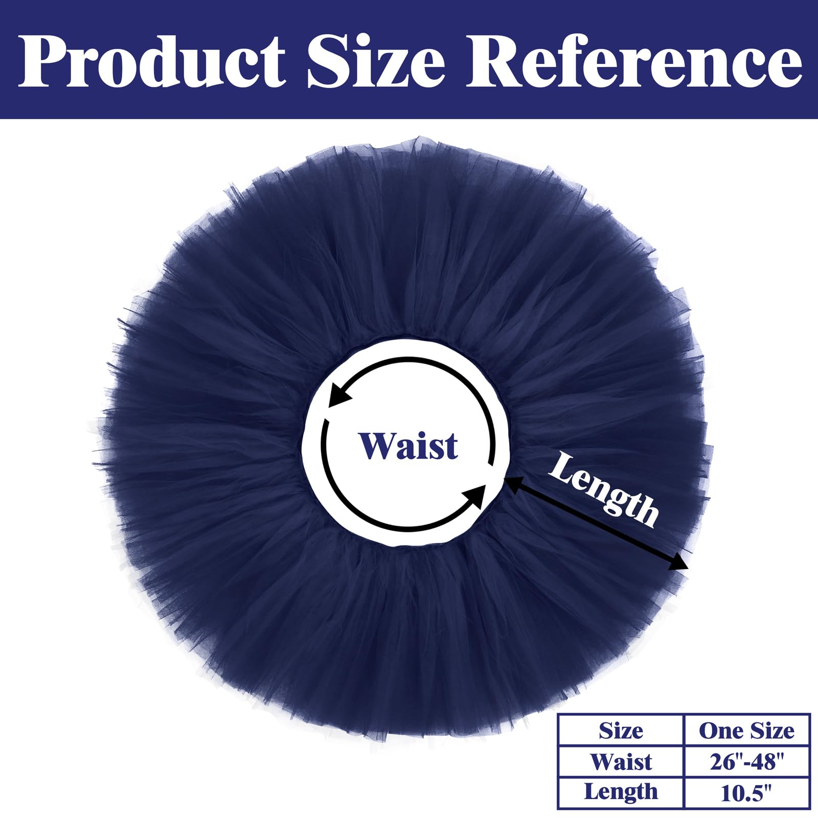 SIZE INFORMATION: One Size fits for most. The adult tutu skirts for women measure about 10 inches in length. And our tutus are designed with comfortable and stretchy waistband, which can be adjusted approximately from 26" to 48" in width. The tutu for women is not only durable, but also very easy to slip-on or off.
