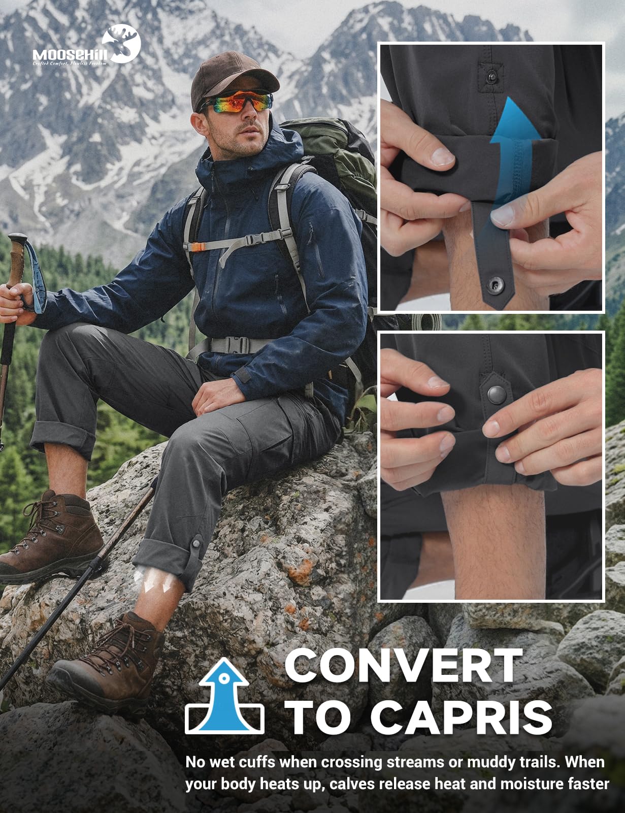 Perfect Air Vents Systems & Easily Transform to Capris Pants: Designed for outdoor enthusiasts like you, these hiking pants for men feature strategically placed breathable vents on the inner thighs, ensuring ventilation and preventing heat buildup in any environment. With the innovative button design at the hem, effortlessly transform them into 7/8 length pants, allowing for easy adaptability to tackle unexpected weather changes or muddy trails with ease.