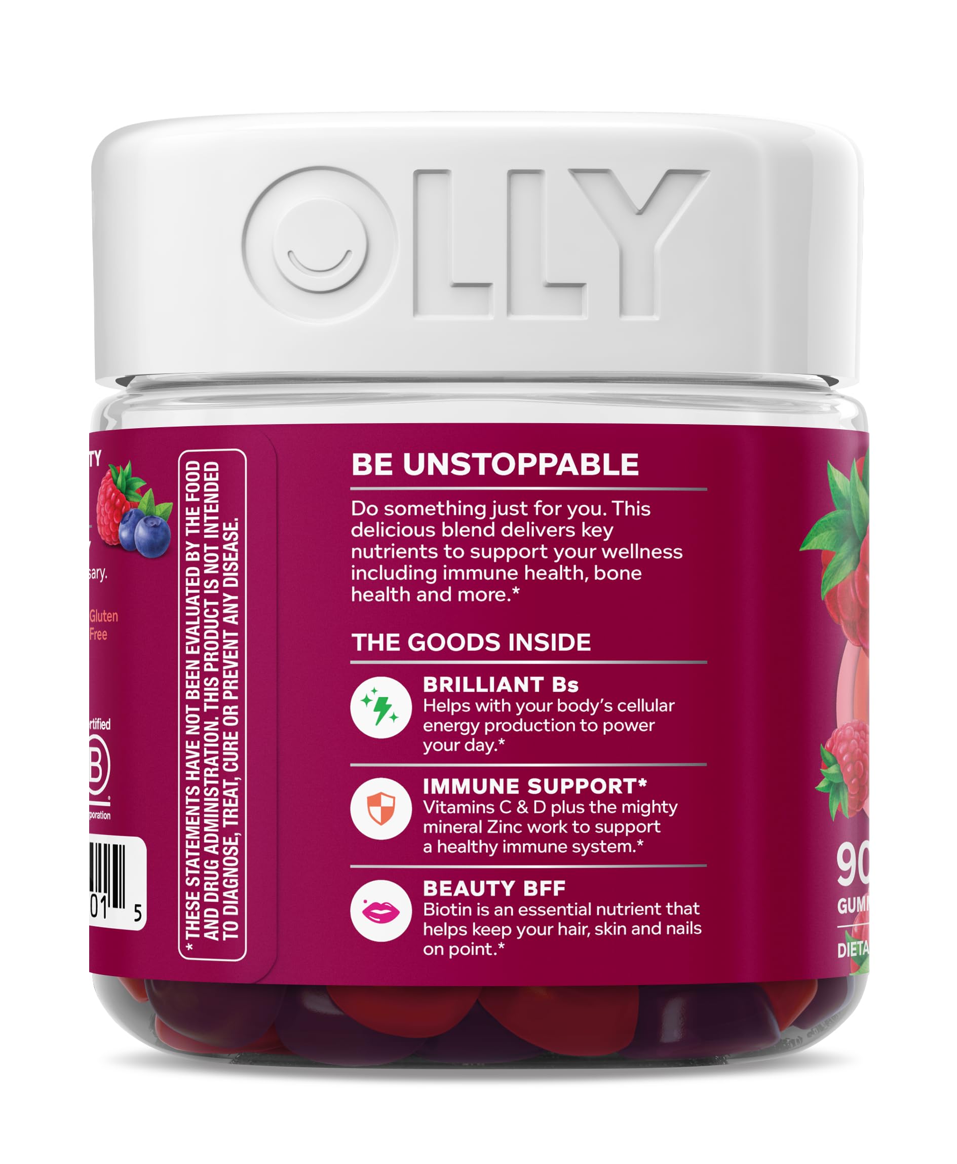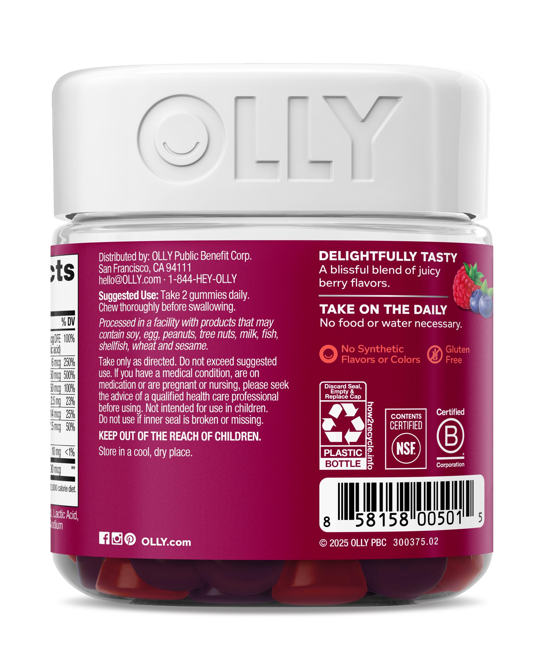 Go big with OLLY Women’s Multi gummies, a delicious, scientifically formulated, gluten free gummy vitamin for health and wellness. Our Blissful Berry flavor with other natural flavors gummy vitamins for women include nutrients to nourish you daily so you can keep doing your thing. This womens multivitamin blend features B Vitamins to support cellular energy, Vitamin D to support bone health* and Vitamins A, C & E. The chewable daily vitamins are a blend for overall wellness and to help fill the gaps when your eating habits are a little less than perfect.* We’ve made it our mission to champion better wellbeing, for all. We do it by crafting products that are as effective as they are delicious—because we know when something feels good, you’re more likely to do it.* *These statements have not been evaluated by the Food and Drug Administration. This product is not intended to diagnose, treat, cure or prevent any disease.