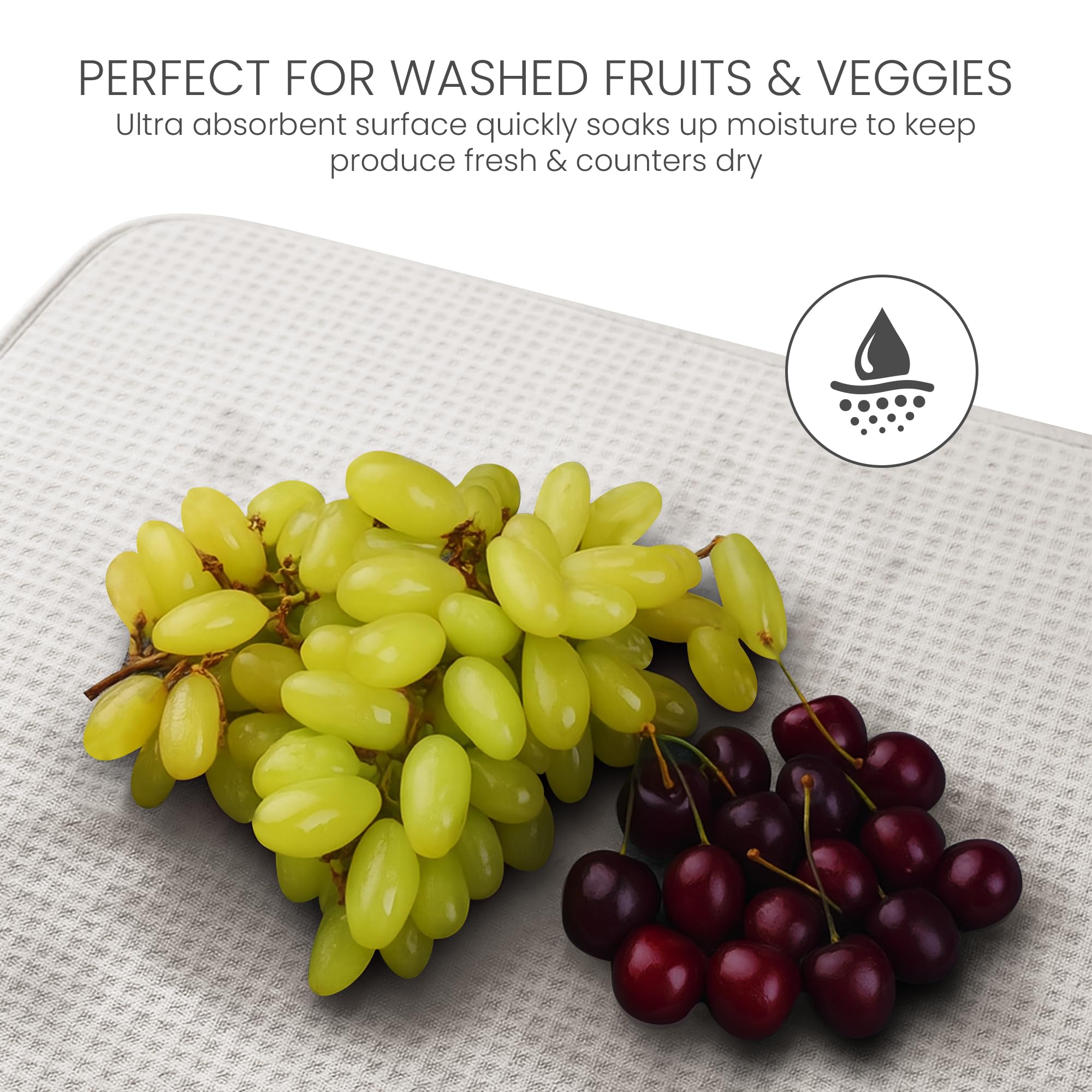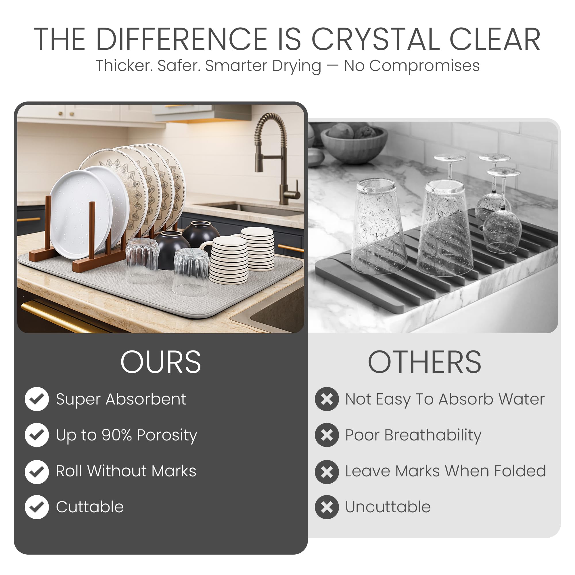 THICKEST , STYLISH MAT | INNOVATIVE HONEYCOMB WEAVE: Keep your counter spotless even while washing a sink full of kitchen dishes . Our superbly stylish drying mat is among the thickest on the market today , and its innovative honeycomb microfiber structure enhances absorption and quickens drying time . Idea kitchen accessories for countertop