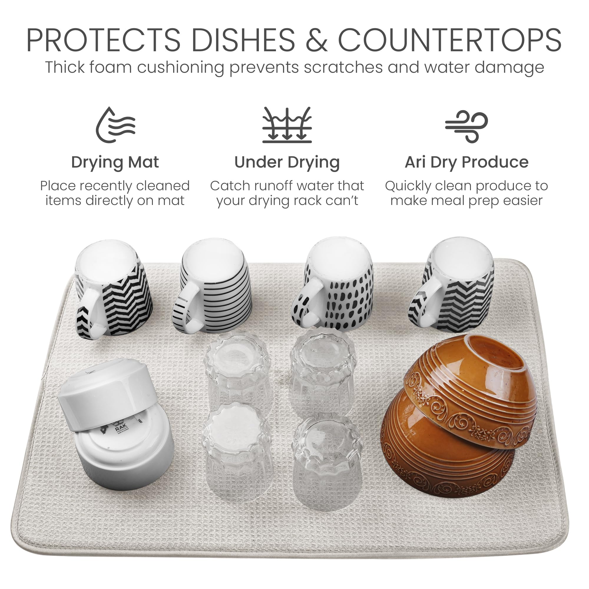 KEEP YOUR ANTIQUE GLASSWARE SAFE: Our stylish kitchen drying mat protects your counter from scuffs and scratches while also keeping your most prized kitchen essentials and glassware safe and sound . And If you ever feel like washing your dish drying mat , simply toss it in the wash with the rest of your laundry-this absorbent microfiber construction has a flexible core that does not weaken in the wash