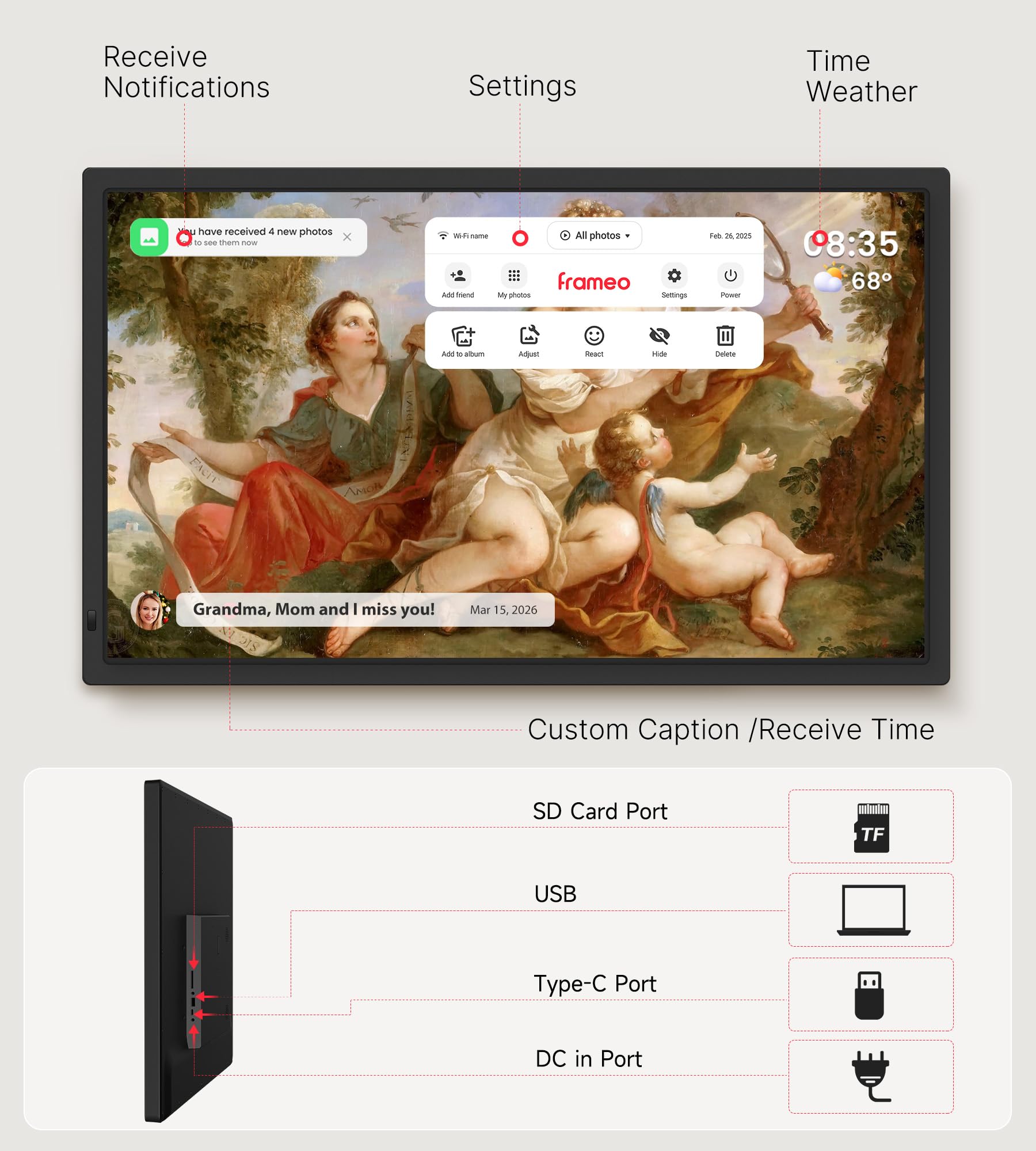【Smart Features for a Personalized Experience】Enjoy a suite of convenient smart features: receive real-time notifications when new photos arrive, display custom captions and timestamps on your images, and check the time and weather at a glance. You can also create personalized photo albums, send heartfelt digital wishes, and set up slideshows to relive your memories in a continuous, beautiful display.