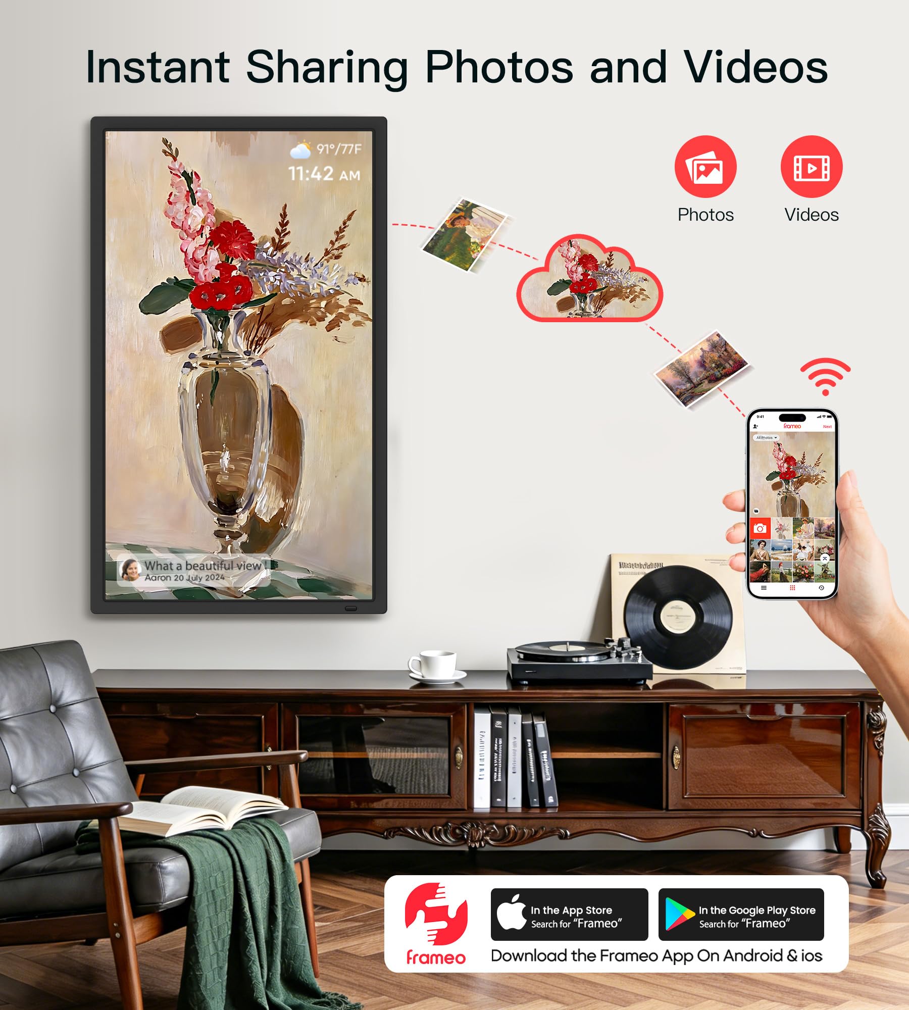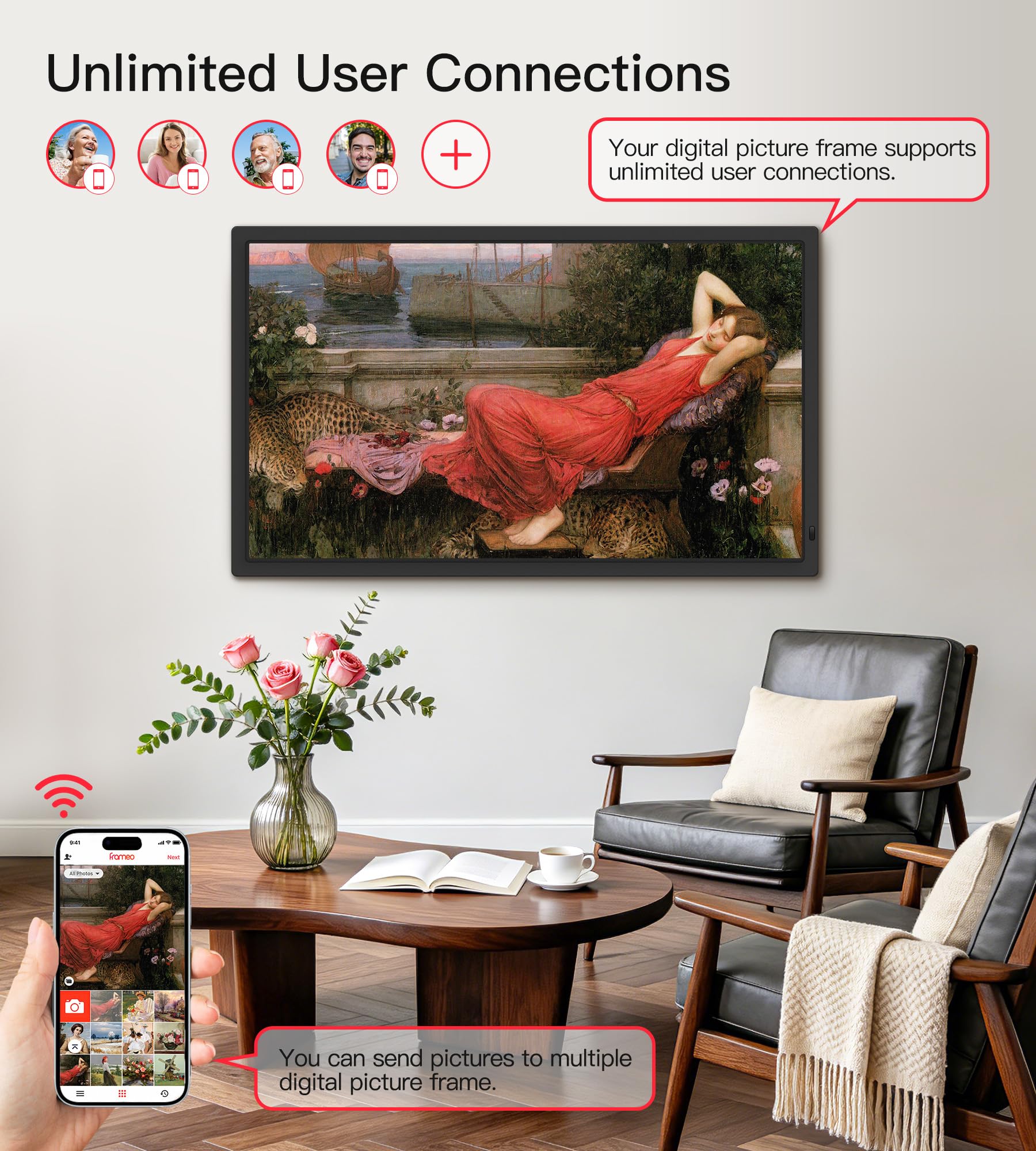 【Instant & Seamless Sharing via Frameo App】Stay connected with loved ones no matter the distance. Use the free Frameo app (available on iOS and Android) to instantly send photos and videos directly to the frame over 2.4G/5G WiFi. Share precious moments with family in real-time, and the frame supports unlimited user connections, so multiple people can send content to multiple frames, making it perfect for multi-generational families.