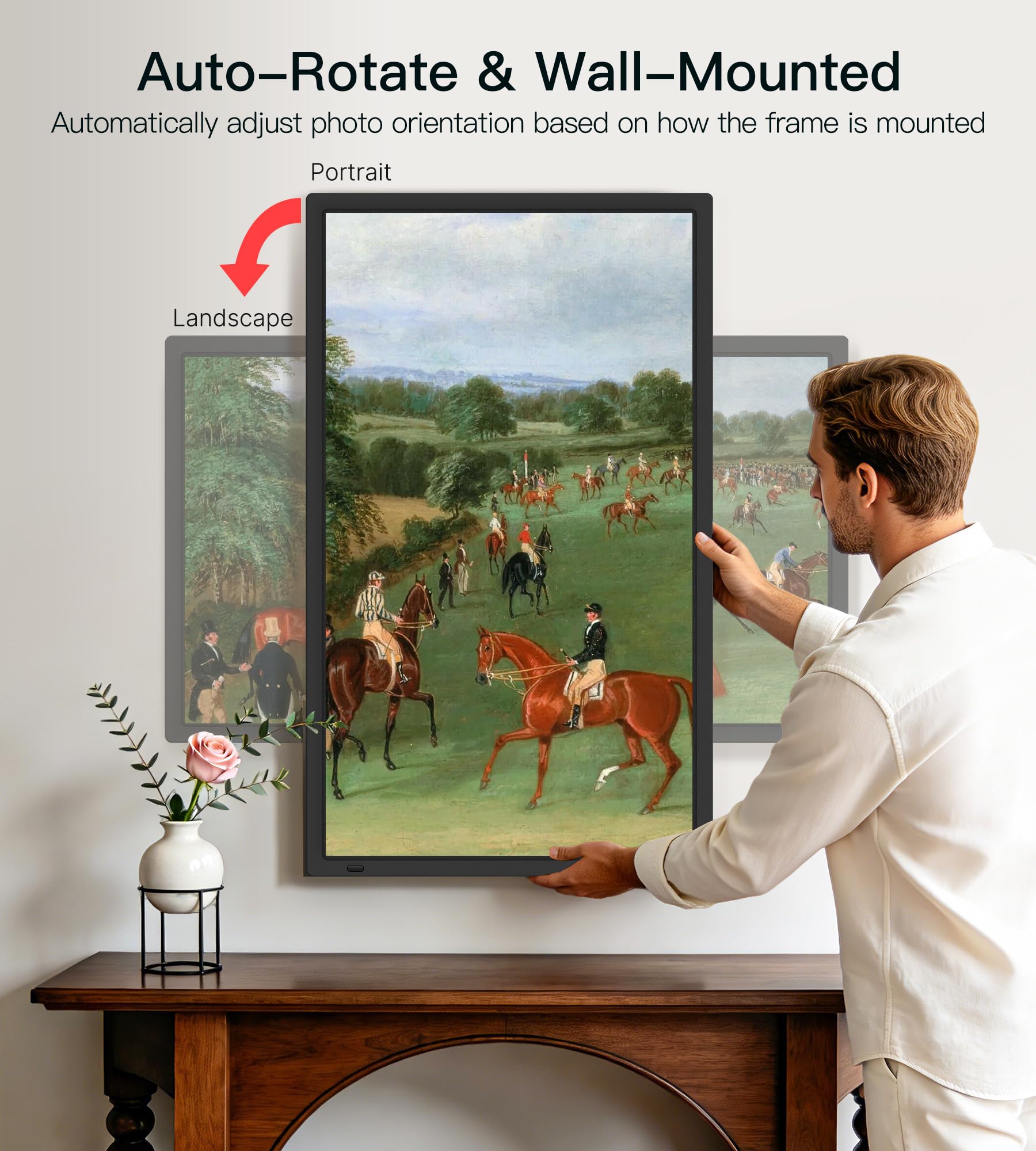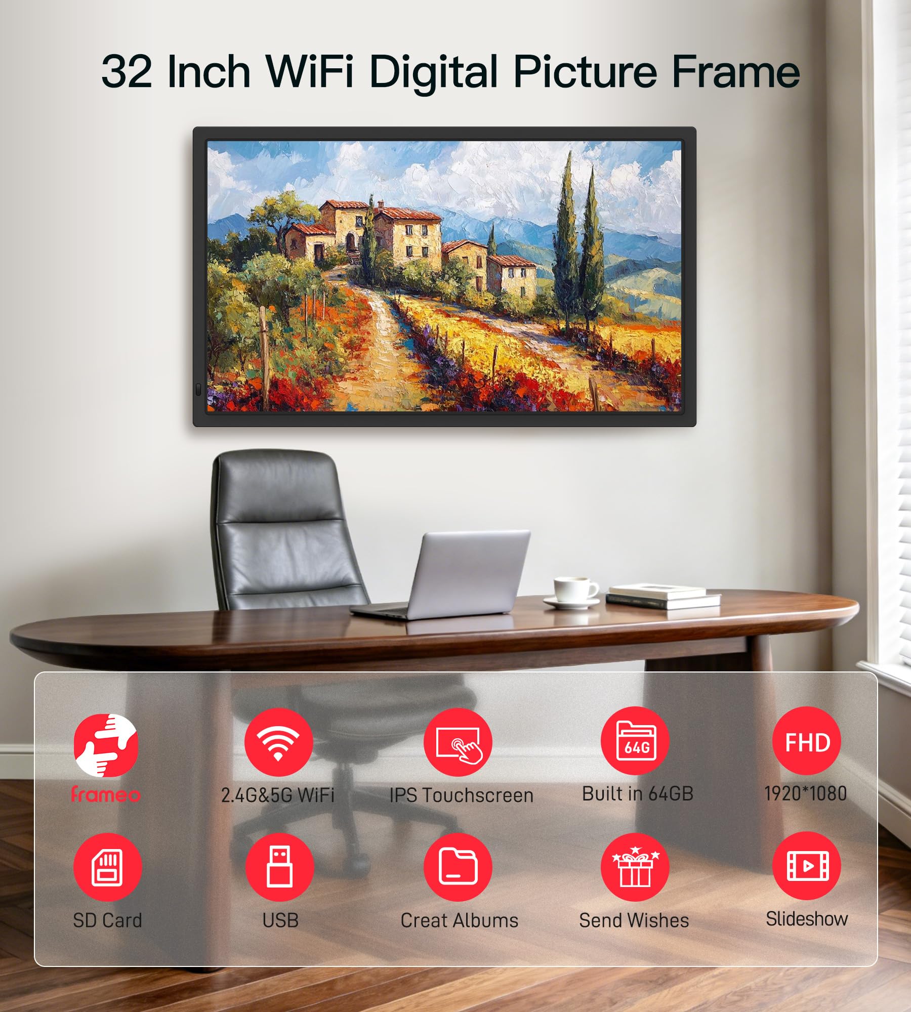 【Multi-Scene Versatility for Home & Business】This 32-inch digital frame is more than a photo display—it’s a versatile visual solution for every setting: home decor (rotating family memories and art), art galleries/exhibitions (crisp, vibrant art/photography), cinemas/theaters (movie posters, trailers and promotions), offices (professional branding and team achievements), and schools/public spaces (student work, community events and announcements).