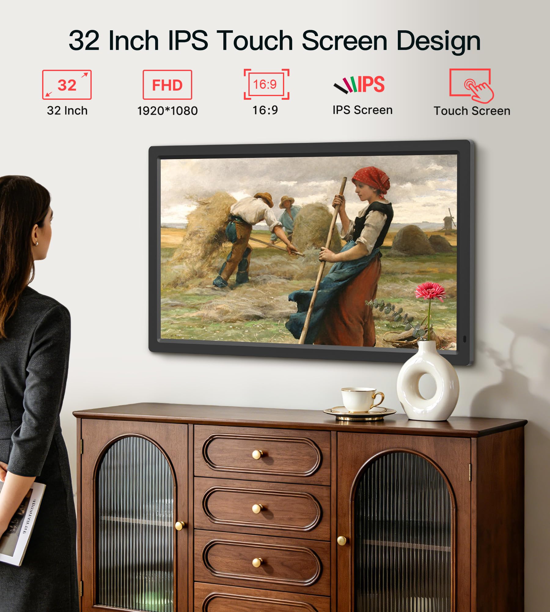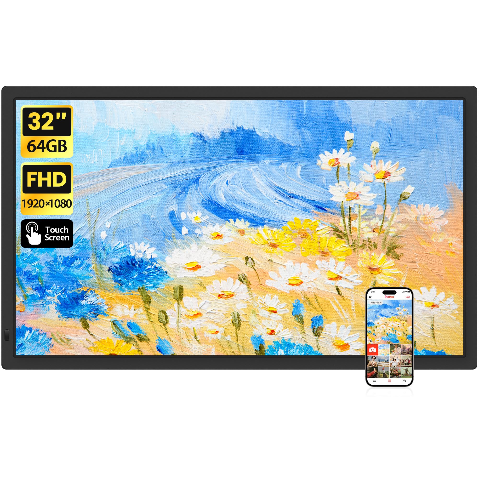 【Immersive 32 Inch IPS Touchscreen Display】Experience your photos and videos in stunning clarity with our 32-inch FHD (1920x1080) IPS touchscreen. The 16:9 aspect ratio delivers wide viewing angles, ensuring every detail is vivid and true-to-life from any position. The intuitive touchscreen interface makes navigating photos, adjusting settings, and managing albums effortless for users of all ages.