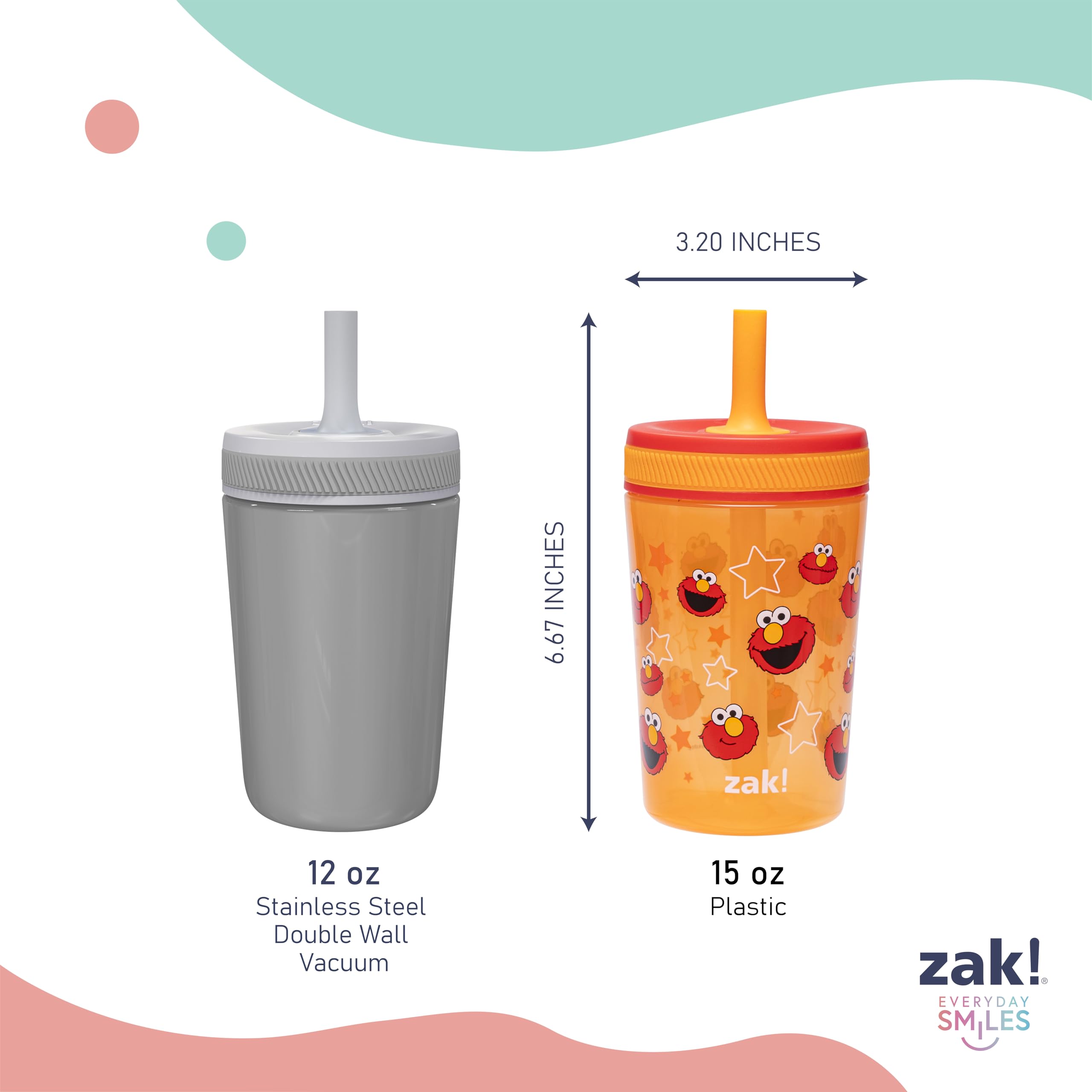 SIZE: The set contains two different Sesame Street tumblers that are 3.20 inches in diameter and 6.67 inches tall. They have a capacity of 15 ounces.