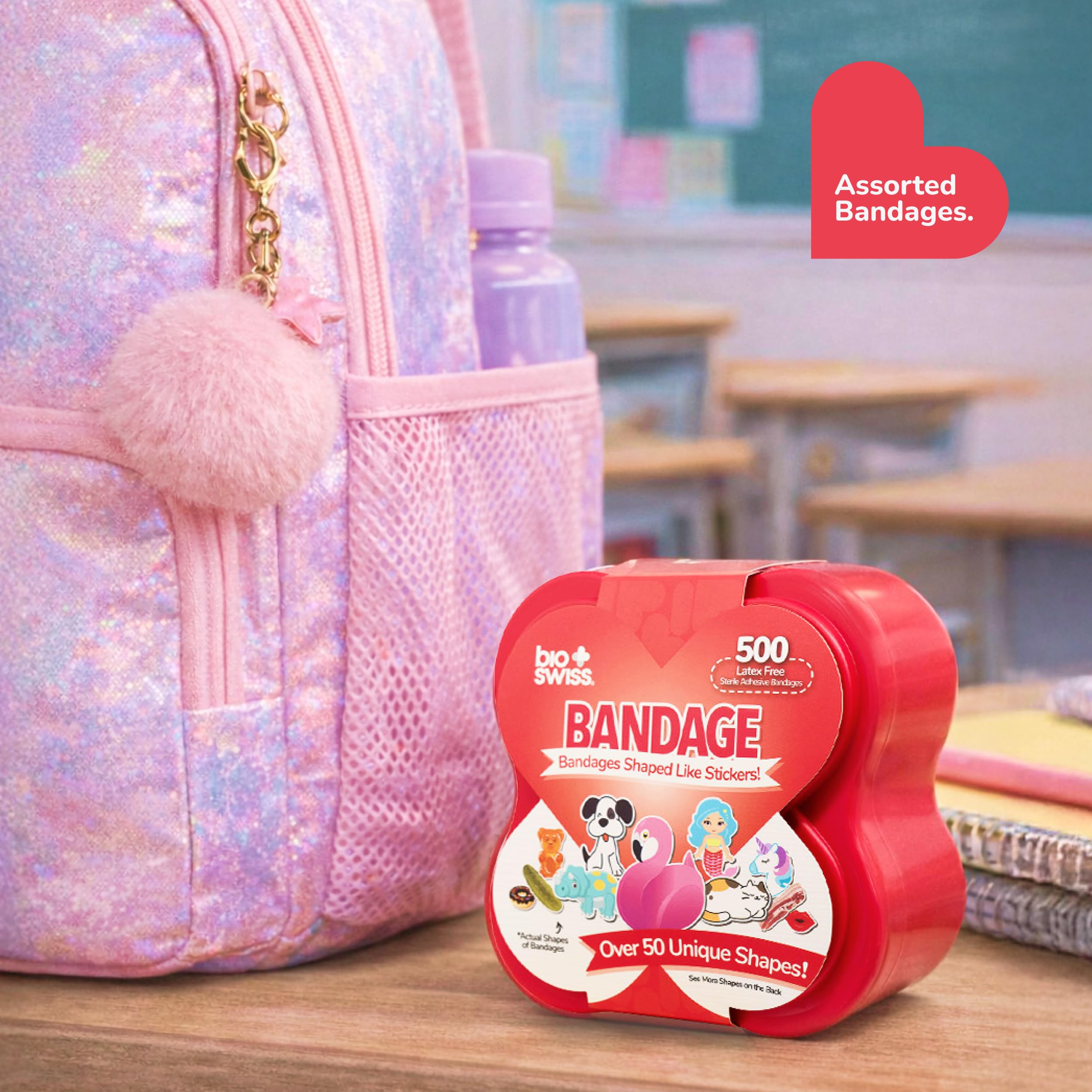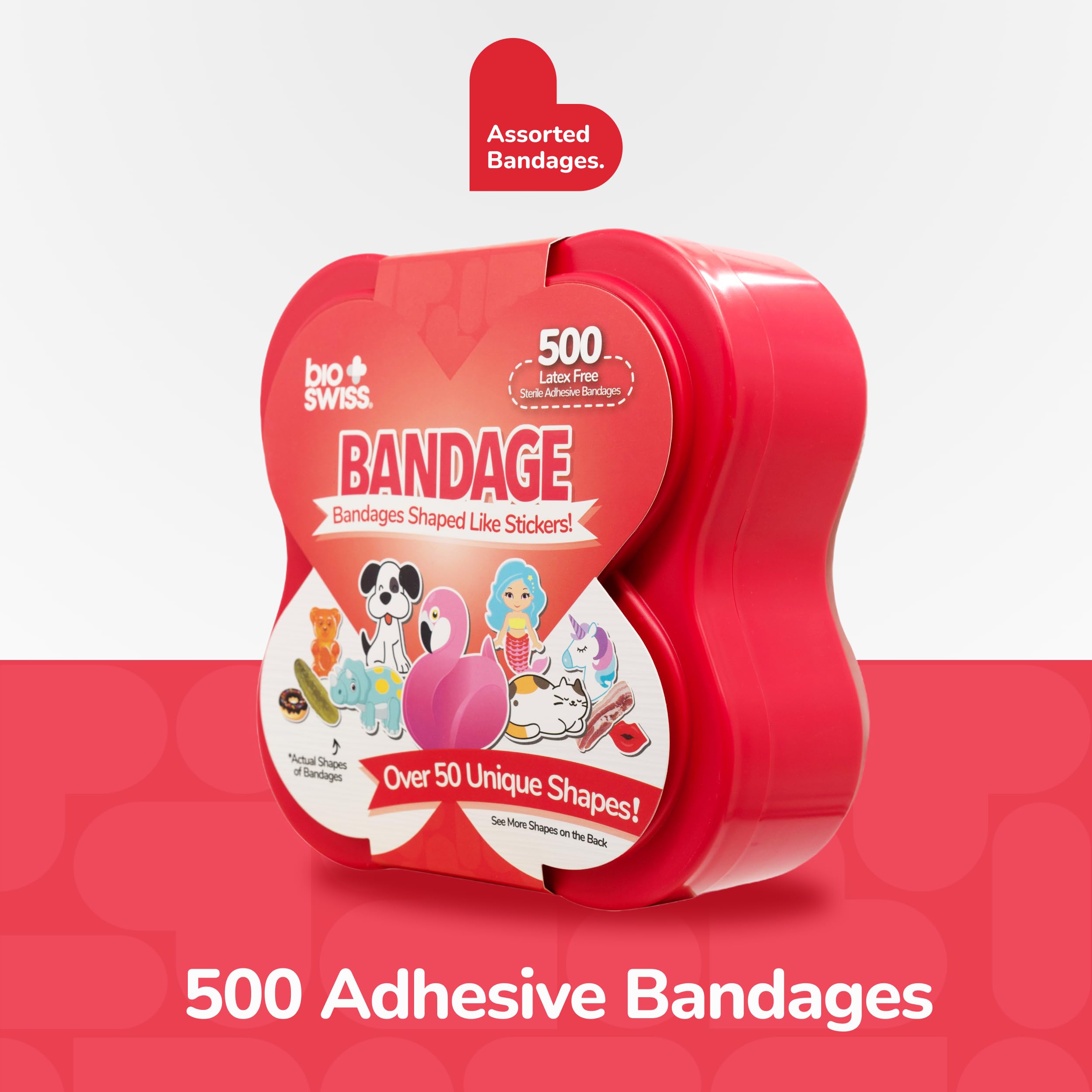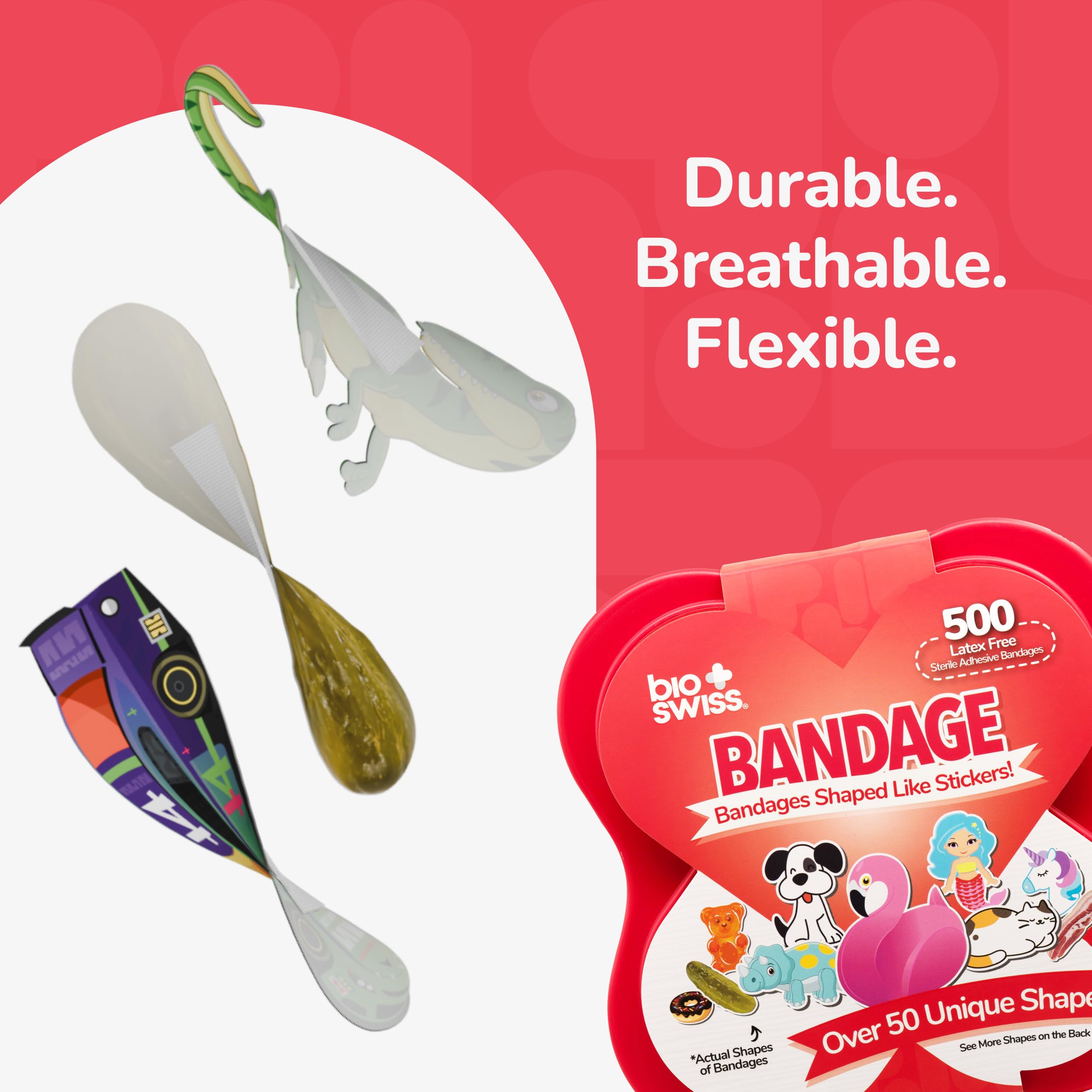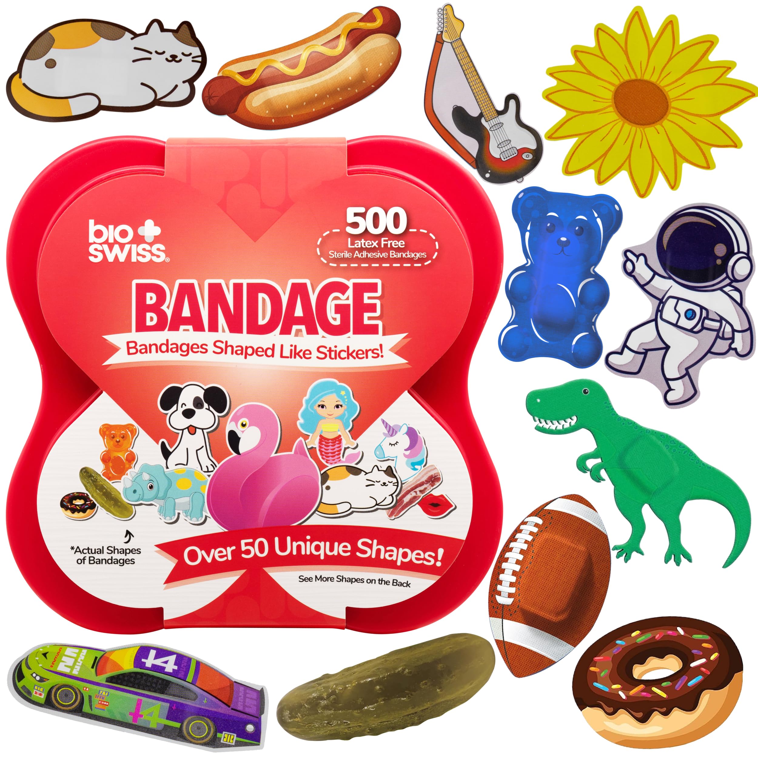 ASSORTED FUN BANDAGES: This 500 piece pack includes over 50 unique shapes and styles such as unicorns, dinosaurs, flamingos, donut,s footballs, emojis, and more designed to make kids smile while protecting minor cuts scrapes and burns