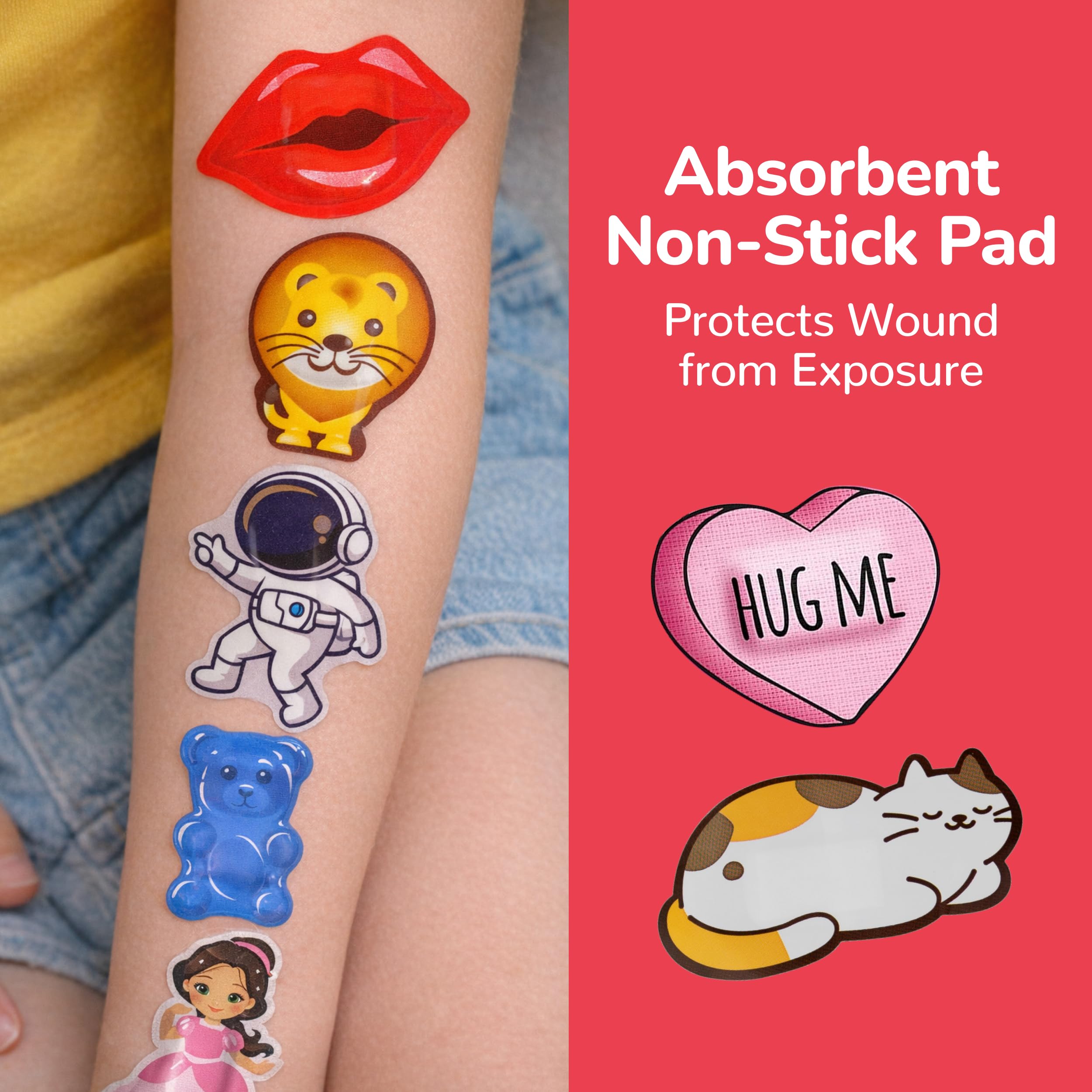 ABSORBENT AND NON STICK: Each colorful bandage features an absorbent non stick pad cushion that helps protect the wound and allows for easy removal without sticking to sensitive skin