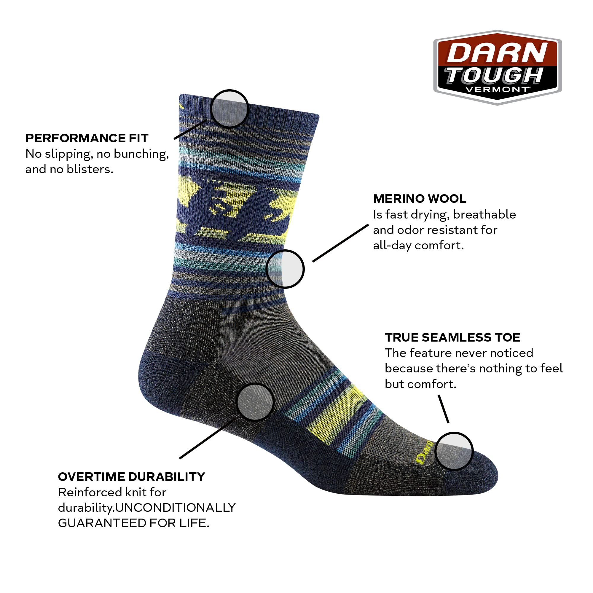 Guaranteed for Life - If these socks wear, tear, or develop holes, Darn Tough will replace them. No strings. No conditions.