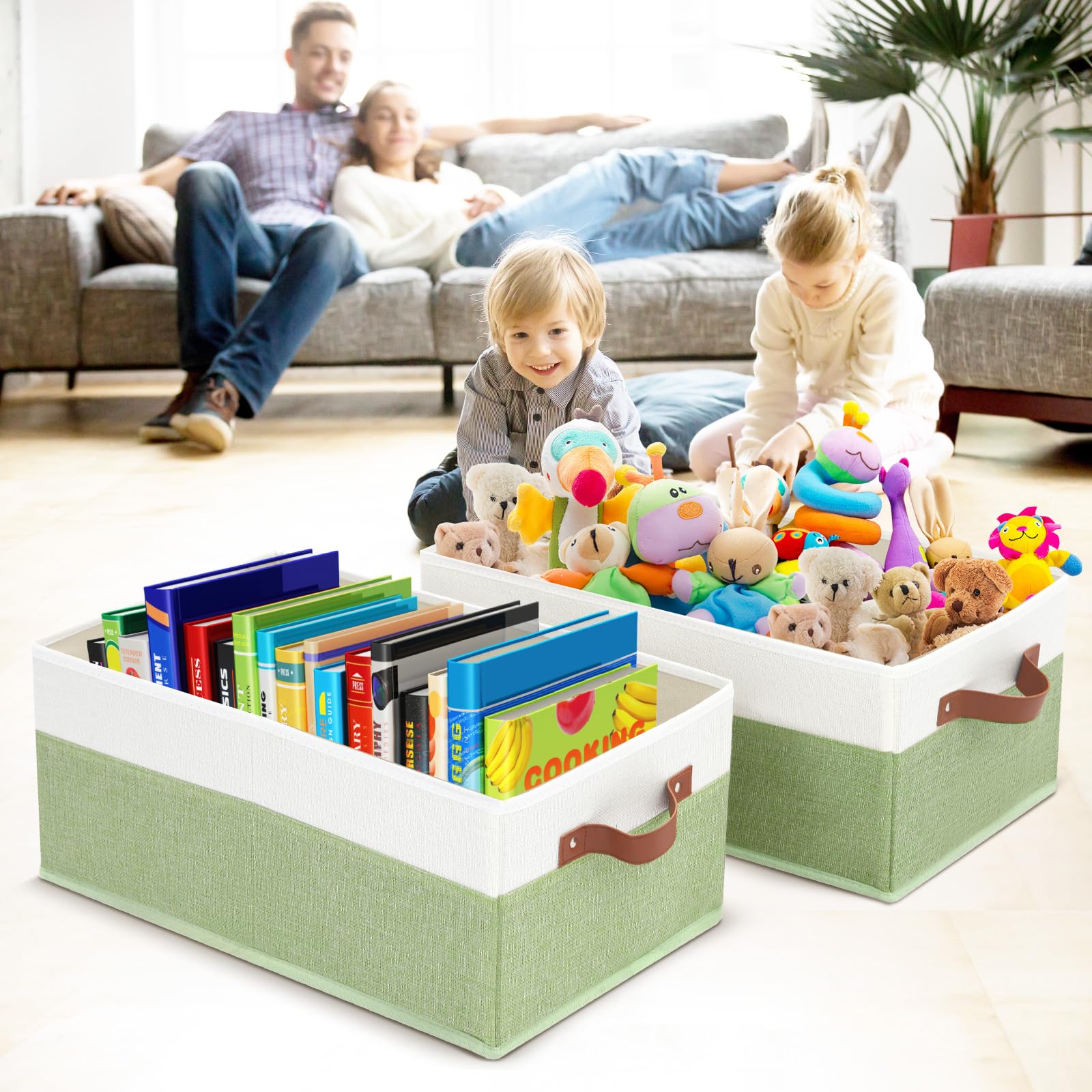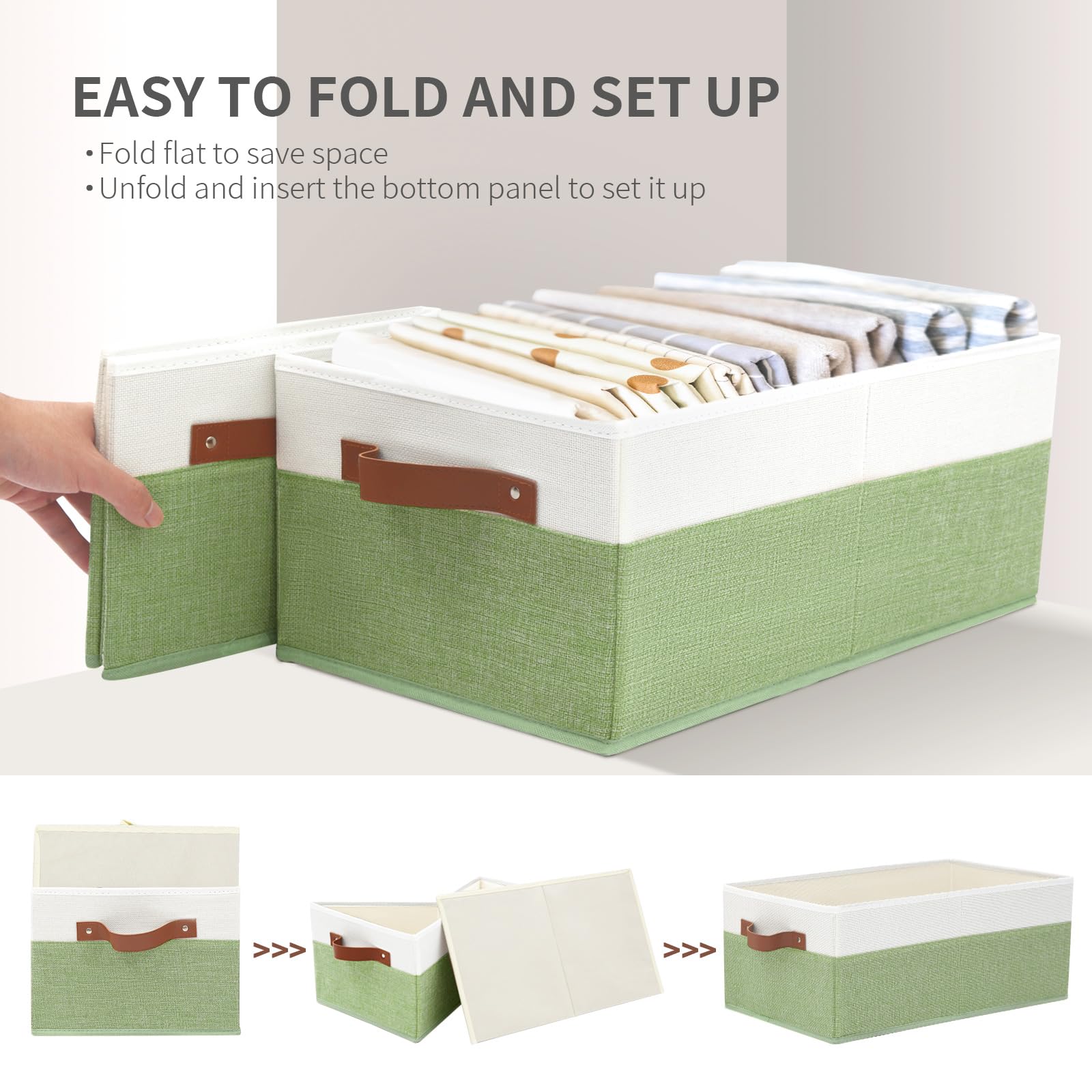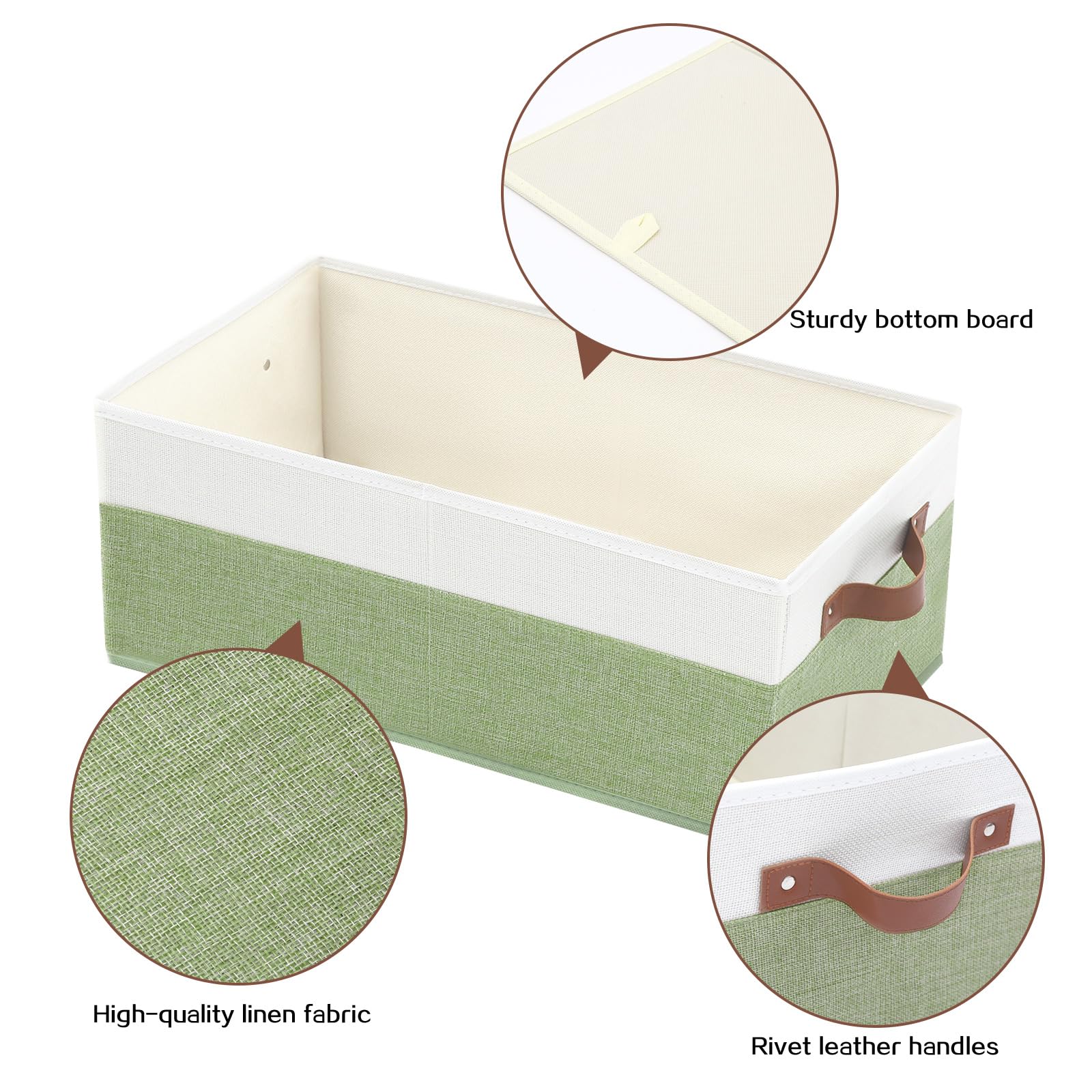 Product Specification Color: Green Package Quantity: 3 Pack External material: Polyester linen Upholstery Material: Non-woven fabric Construction Material: Environmentally cardboard Size:18.9 x 11.02 x 7.87 inches / 48 x 28 x 20 cm. Highlights Rivets Reinforcement Soft Leather Handles : These sewn-in leather handles have a smooth, comfortable feel, It is easy to grab, making the storage bins easy to carry. High-Quality Material : Made of heavy-duty cardboard side panels and the inserted bottom plate, durable, breathable and Eco-friendly Collapsible : You only need to insert or remove the bottom boards to fold or unfold those storage bins Multi-Purposes : Bedroom : Jeans, pants, shorts, underwear, socks, scarves Kitchen : Snacks, dry foods storage Living room: magazines, books, holiday decorstorage Nursery : Diapers, baby clothes, bottles storage Kids Room : Toys, plushes, games, arts and craft supplies storage Bathroom : Hand towels, beauty and hair care essentials storage Laundry room: Cleaning supplies, detergent, cloths storage Office : Document storage General Sundries Storage 3 pack closet organizer bins can help you divide the sundries in your life into several categories so that you can easily find various types of items TIPS Please wipe away stains with a damp cloth and air dry for daily maintenance; There may be a smell of "new" when first opening the package; please air these closet bins out in a well-ventilated place for a few hours. If you have any problem or advice concerning our products, please do not hesitate to get in touch with us through Amazon.