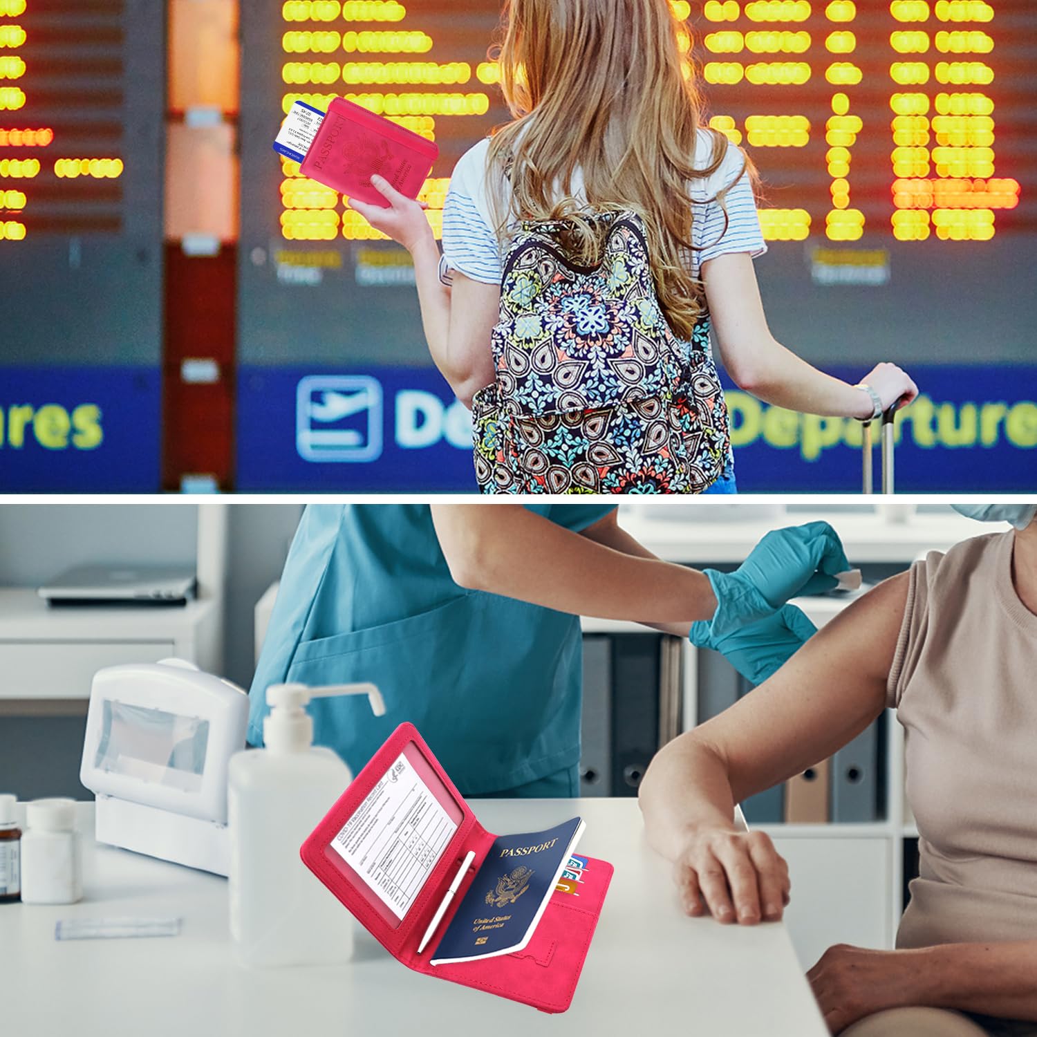 Description OUTSTANDING QUALITY AND GORGEOUS DESIGN Our passport covers are made from high-quality PU leather, perfect for all your travel needs. Passport holders are designed with stringent measurements to make sure they will fit your documents precisely. This travel wallet passport holder is complete with your favorite color. Whether it's blue, green, or red you can now show off that vibrant personality of yours every time you board a plane! Our cute passport holder is lightweight and slim. This means a vaccine card wallet can easily fit into a backpack or purse without adding unnecessary weight to your carry-on luggage. ORGANIZE AND PROTECT YOUR DOCUMENTS An RFID passport and vaccine card holder is the most useful thing you can have when traveling abroad. Passport protector holds all your important documents together and is so easy to use, especially if you're in a hurry! The passport book holder has room for a passport, business cards, credit cards, boarding passes, and CDC vaccination card. RFID passport wallet has a smart button closure that will keep passport and vaccination card holder securely shut so you don't have to worry about losing sight of any important papers while traveling or at home! Our RFID passport cover has a unique material engineered specifically to block RFID signals