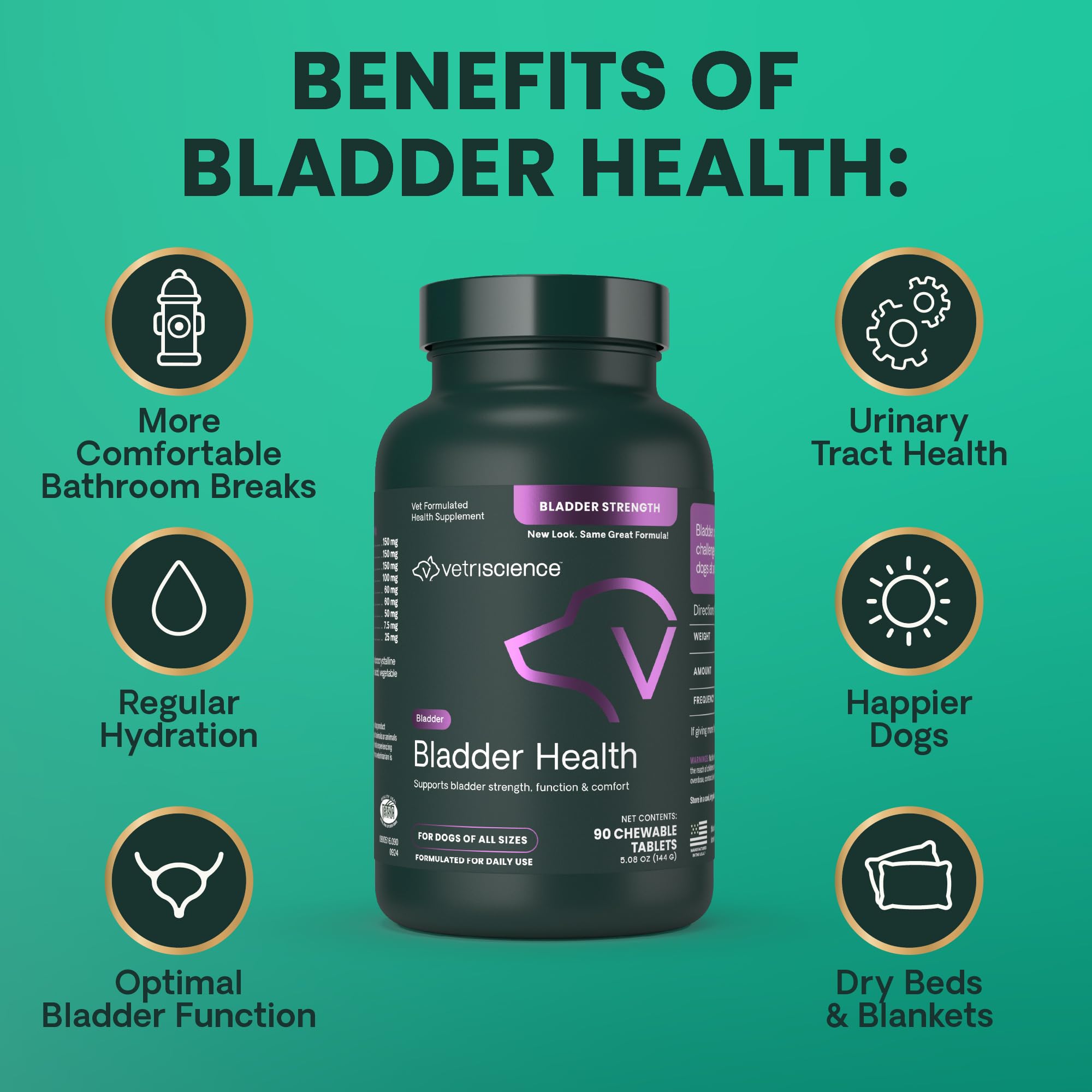 Support your dog’s urinary tract health and comfort with Bladder Health (new name, same great Bladder Strength formula), a vet-formulated, non-hormonal bladder support supplement for dogs that experience incontinence from spaying or normal aging. This powerful blend encourages proper bladder function and reduced leakage, and features pumpkin seed to improve bladder control, saw palmetto for healthy muscle tone of the bladder, and wild yam for balanced urinary control. Isoflavones from soy protein help maintain normal bladder strength, while Rehmannia glutinosa supports healthy kidney function. Olive leaf, corn silk, and Vitamin B6 act as gentle diuretics, encouraging regular hydration and urination to help flush the urinary tract and maintain a healthy bacterial balance. Bladder Health is designed for all life stages but formulated with spayed and senior dogs in mind. This bladder control supplement for dogs targets key areas of the urinary system to promote comfort and control to help reduce leakage in dogs who experience incontinence or overactive bladders. Trust Bladder Health for comprehensive bladder control, backed by veterinary science for long-term urinary health. Our dog and cat supplements are certified by the National Animal Supplement Council (NASC), routinely undergo third-party testing, and contain no hidden ingredients, artificial flavors, synthetic colors or preservatives.