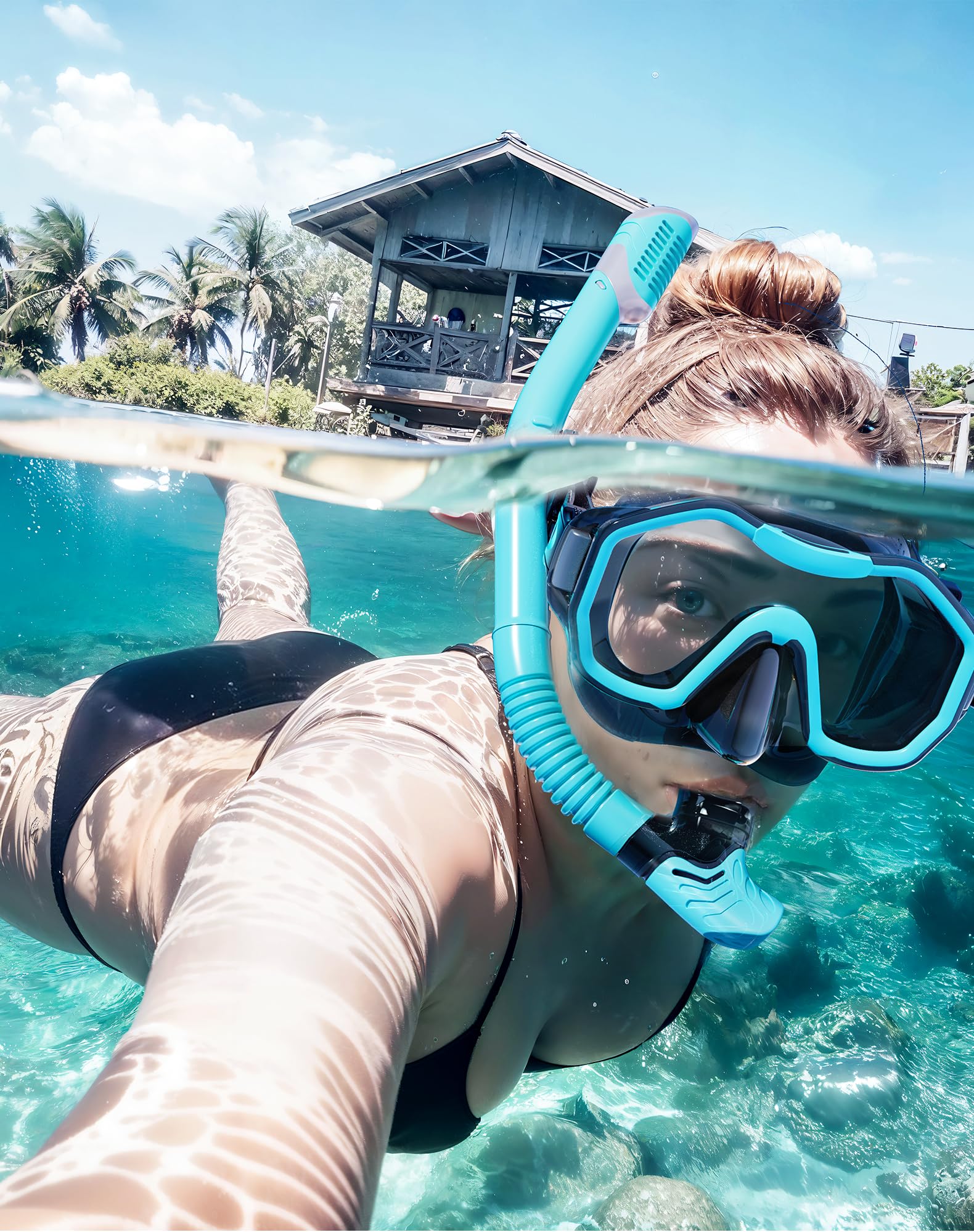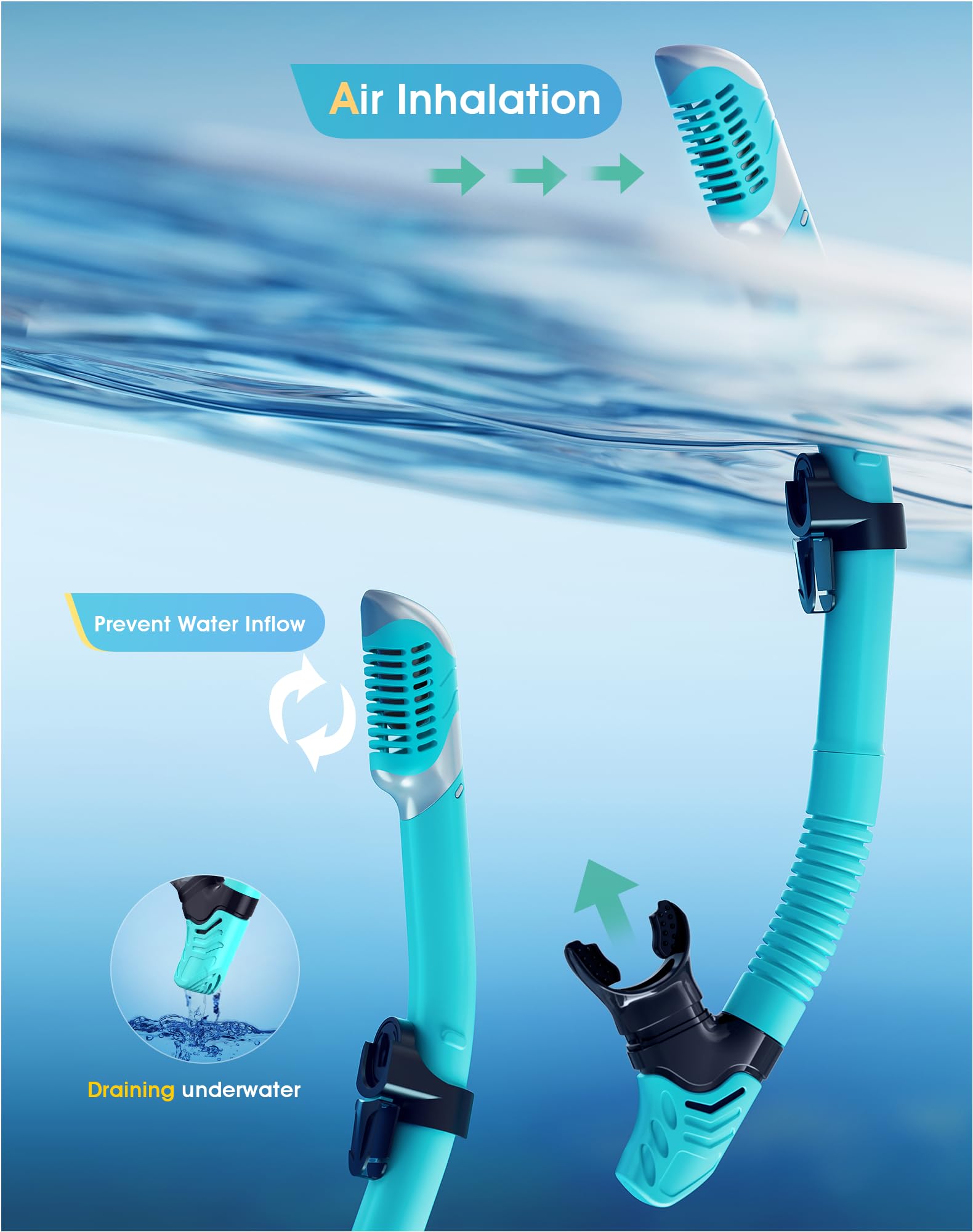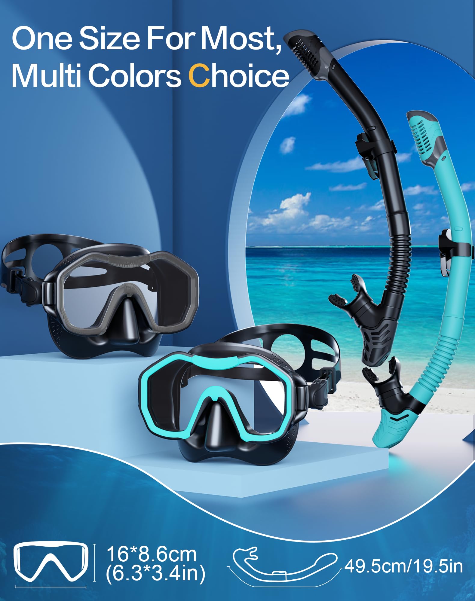 【Dry Top Anti-Splash Design】Snorkel set adult installs an one-way inhalation valve and has a mobile floating ball on the top of it. Once the tube is underwater, the tube entrance will be closed by the floating ball,Whether you are swimming or diving, you can easily handle it.
