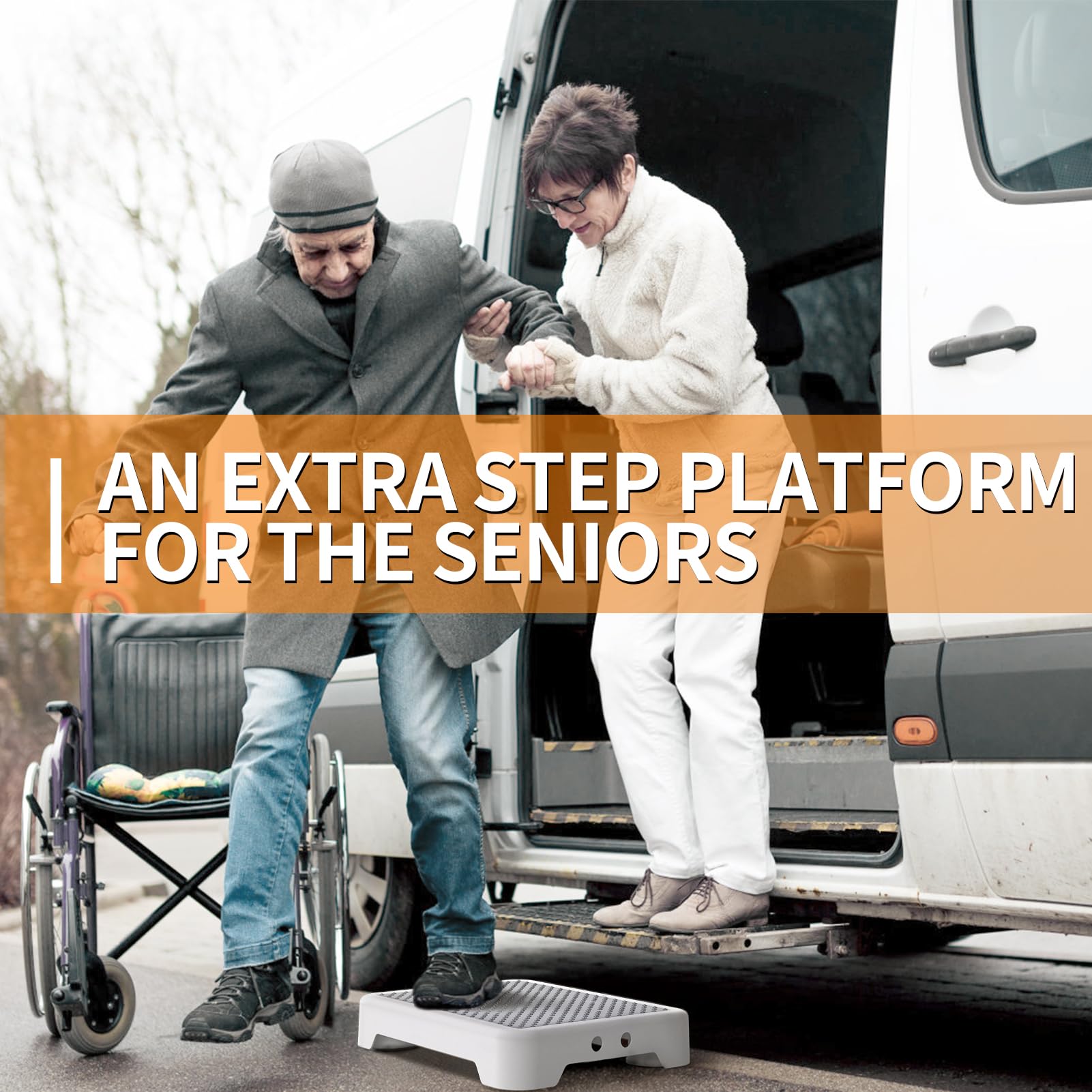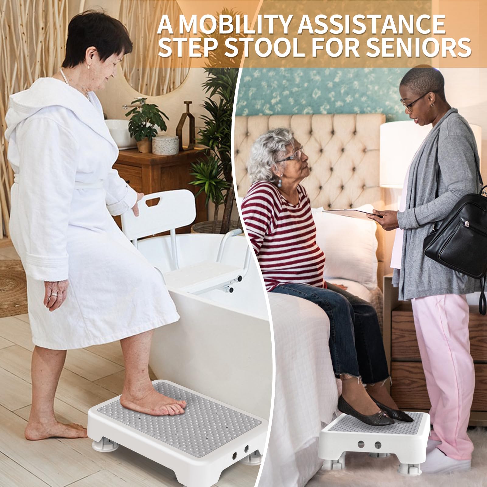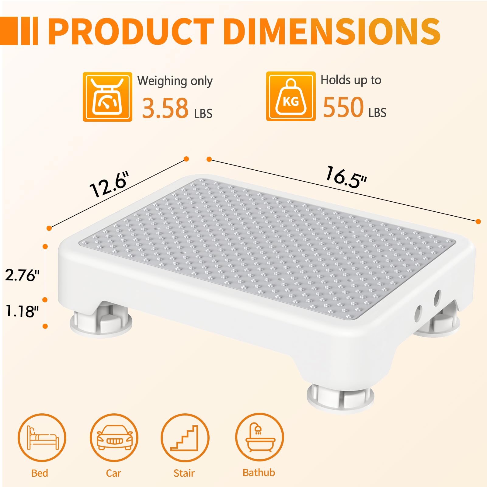 【Durable & Heavy-Duty Construction】: Made from high-quality polypropylene, this wide step stools for seniors supports up to 550 pounds, making it a reliable choice as a bedside step stool for high beds, car step stool for elderly or shower step stool for adults. Its reinforced frame resists cracking and ensures long-lasting use in most environment