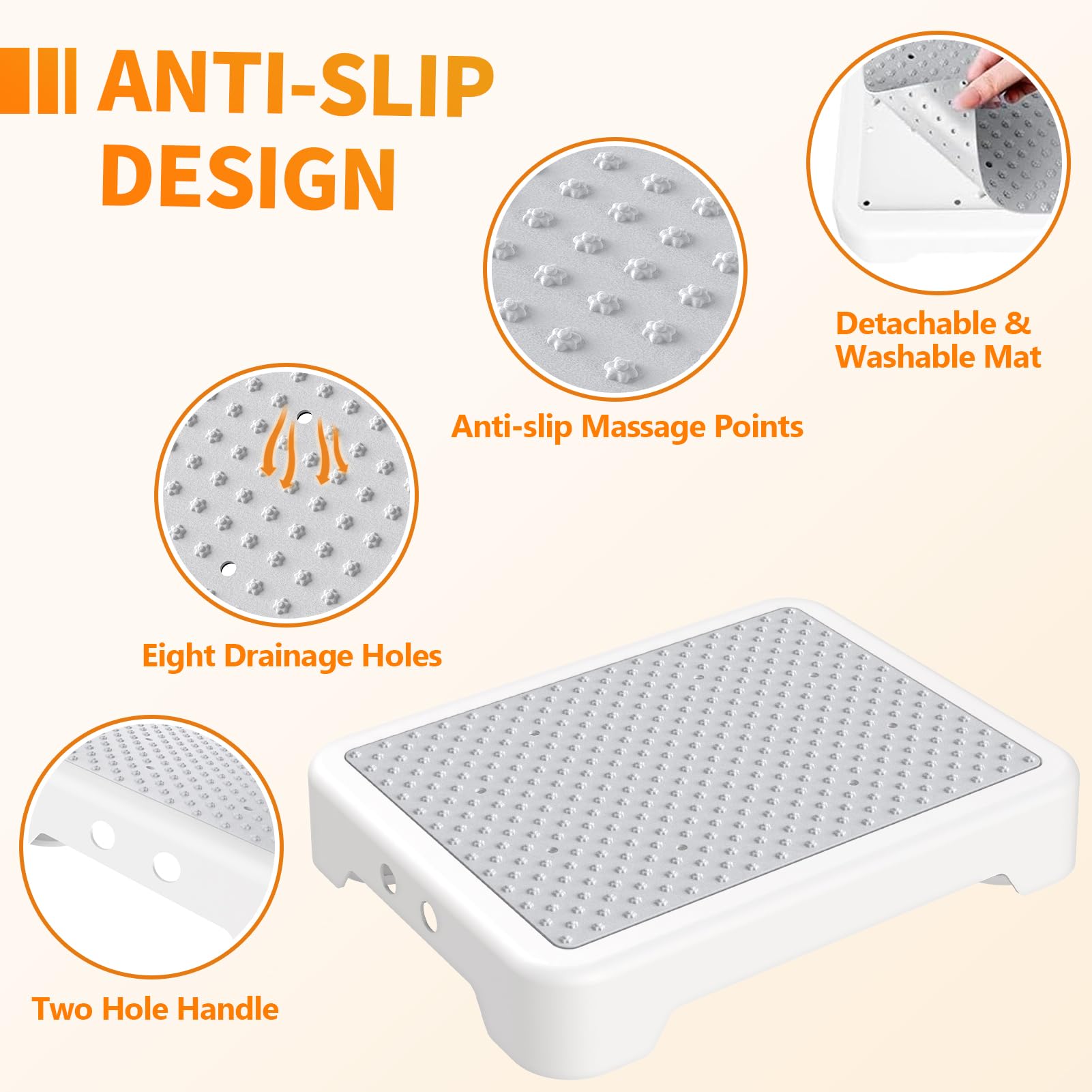 【Anti-Slip & Safety-Focused Design】: This one step stool for adults features an anti-slip rubber mat with massage points and drainage holes, ensuring safety in wet areas like bathrooms. The bottom includes 5 anti-slip feet—4 corner supports for perimeter stability and 1 central foot for added strength. This design enhances balance, prevents cracking, and provides a secure surface for adults, seniors, and more