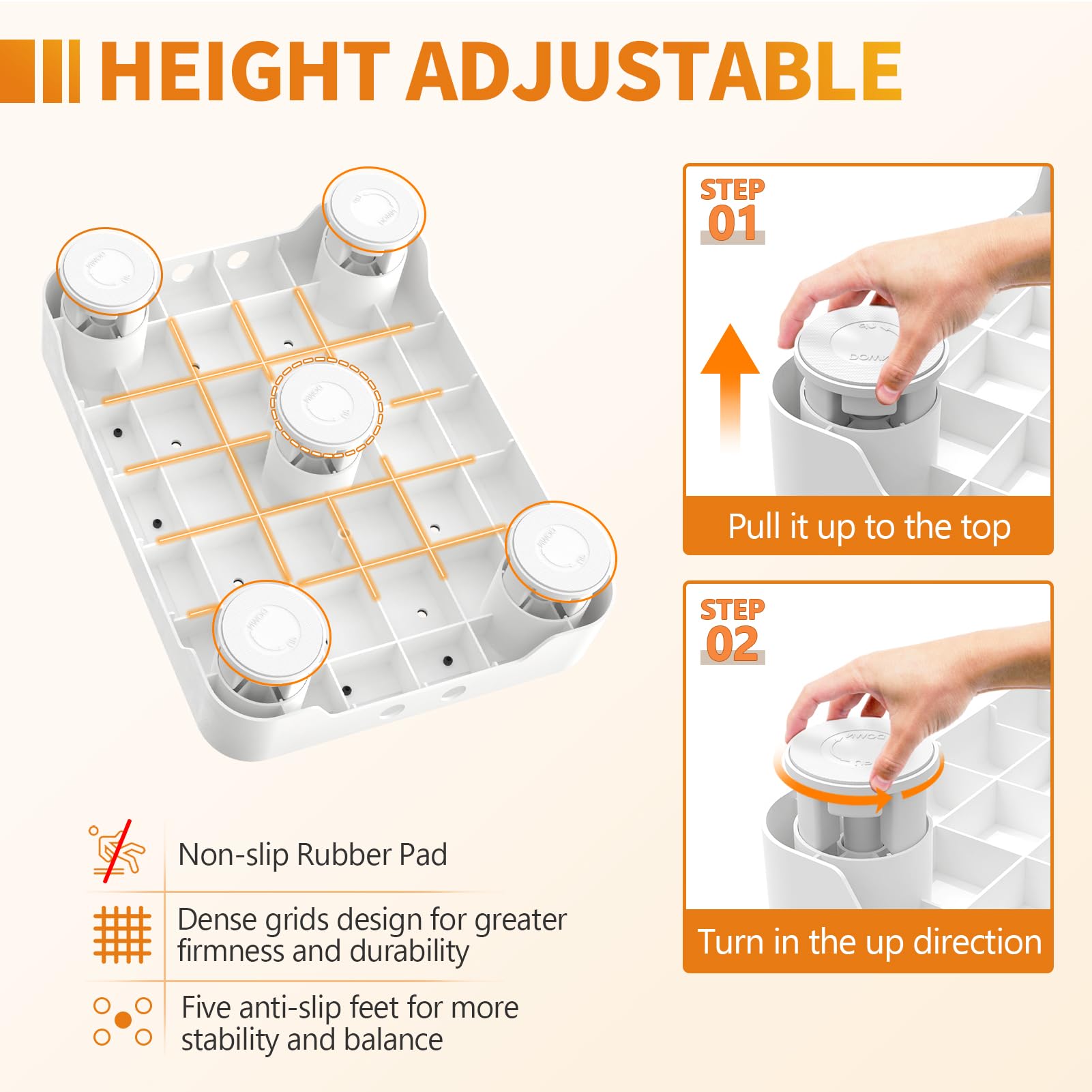 【Adjustable Height for Custom Comfort】: This short step stool features 5 adjustable feet, allowing you to increase the height by 1.18 inches. Simply pull the foot upward, turn it in the direction marked “UP” and snap into place
