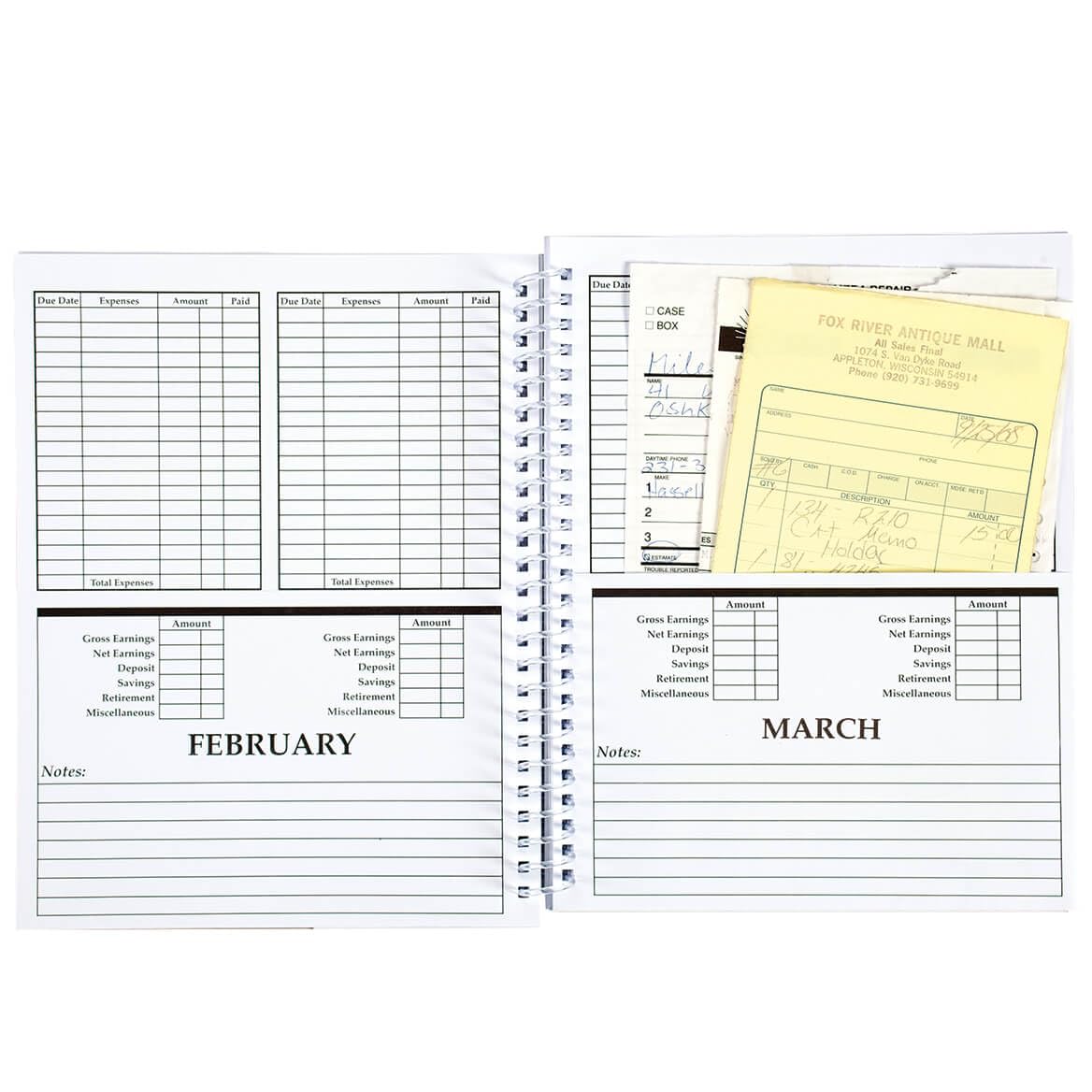 Includes pocketed pages to file receipts, bills even tax information.