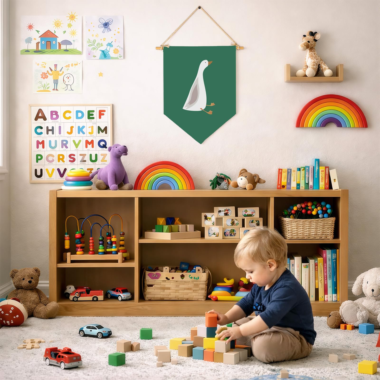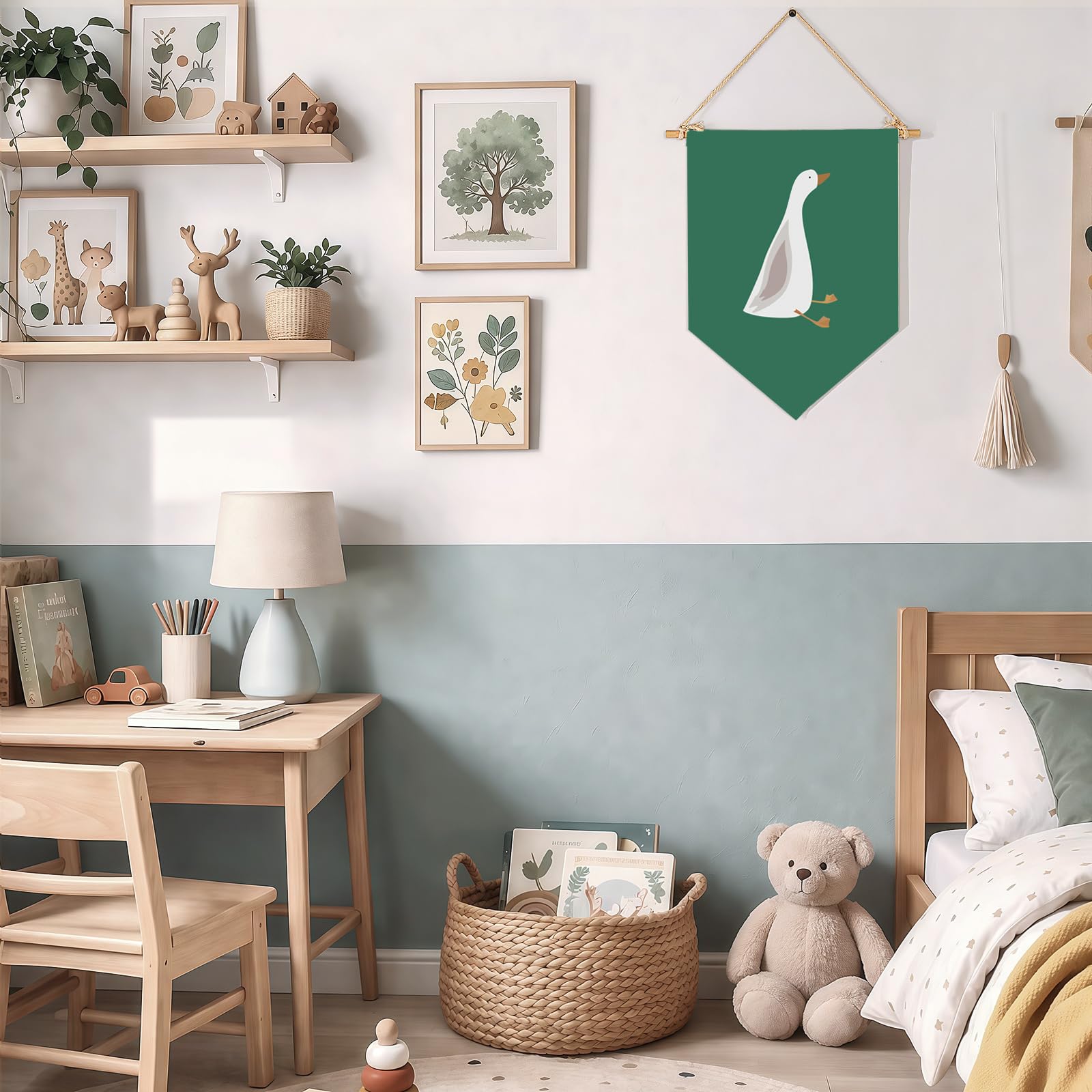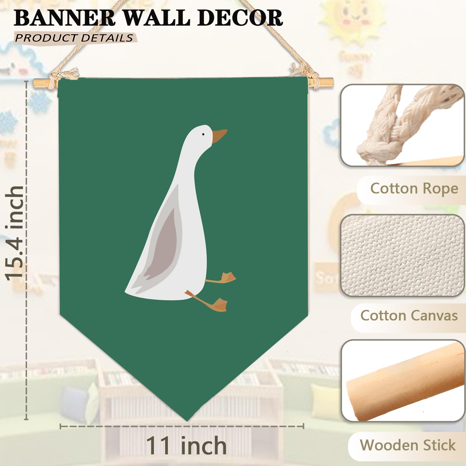 Crafted from natural cotton canvas, this 15.4 x 11 inch nursery wall banner brings a soft and calming touch to baby room, toddler space. The durable fabric keeps its shape with a natural texture, while the clear print stays bright with everyday use. Lightweight and easy to hang, it comes with a wooden dowel and pre-tied twine for quick setup on walls, doors or shelves. The versatile size fits small spaces without feeling crowded, making it perfect for creating a cozy nursery atmosphere. A thoughtful gift for baby showers, newborn arrival or first birthday.