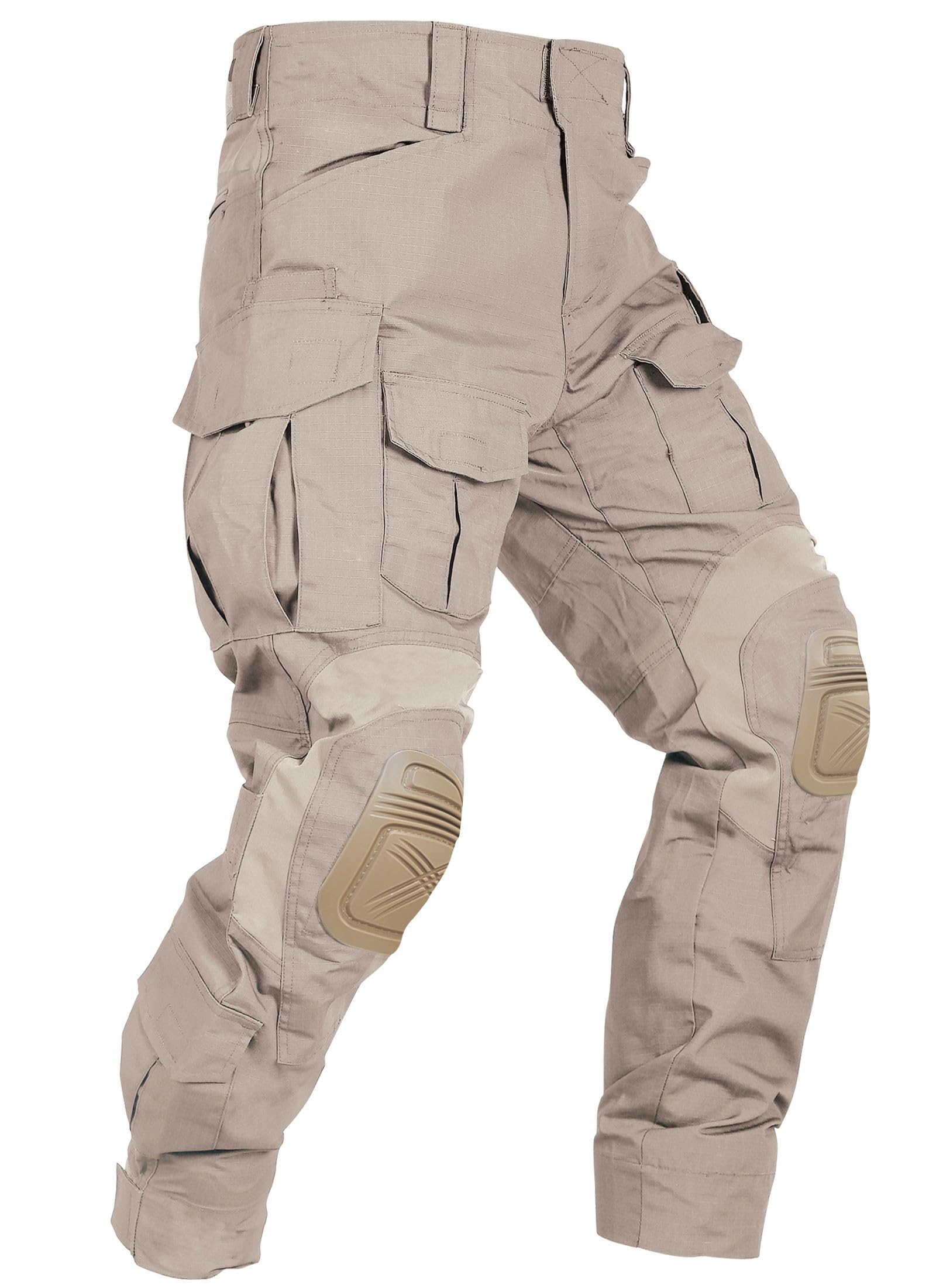 Multi pocket cargo pants for men: The camo pants men are with 10 pockets for tactical tools and self items. Including 2 front slant pockets; 2 thigh pockets; 2 side leg pockets; 2 side calf pockets; 2 zipper rear pockets.There are three hook and loop panels sewn onto the knee pad pockets top and sides which attach to the hook and loop material inside to pant legs which drastically helps prevent the knee pad blowing out
