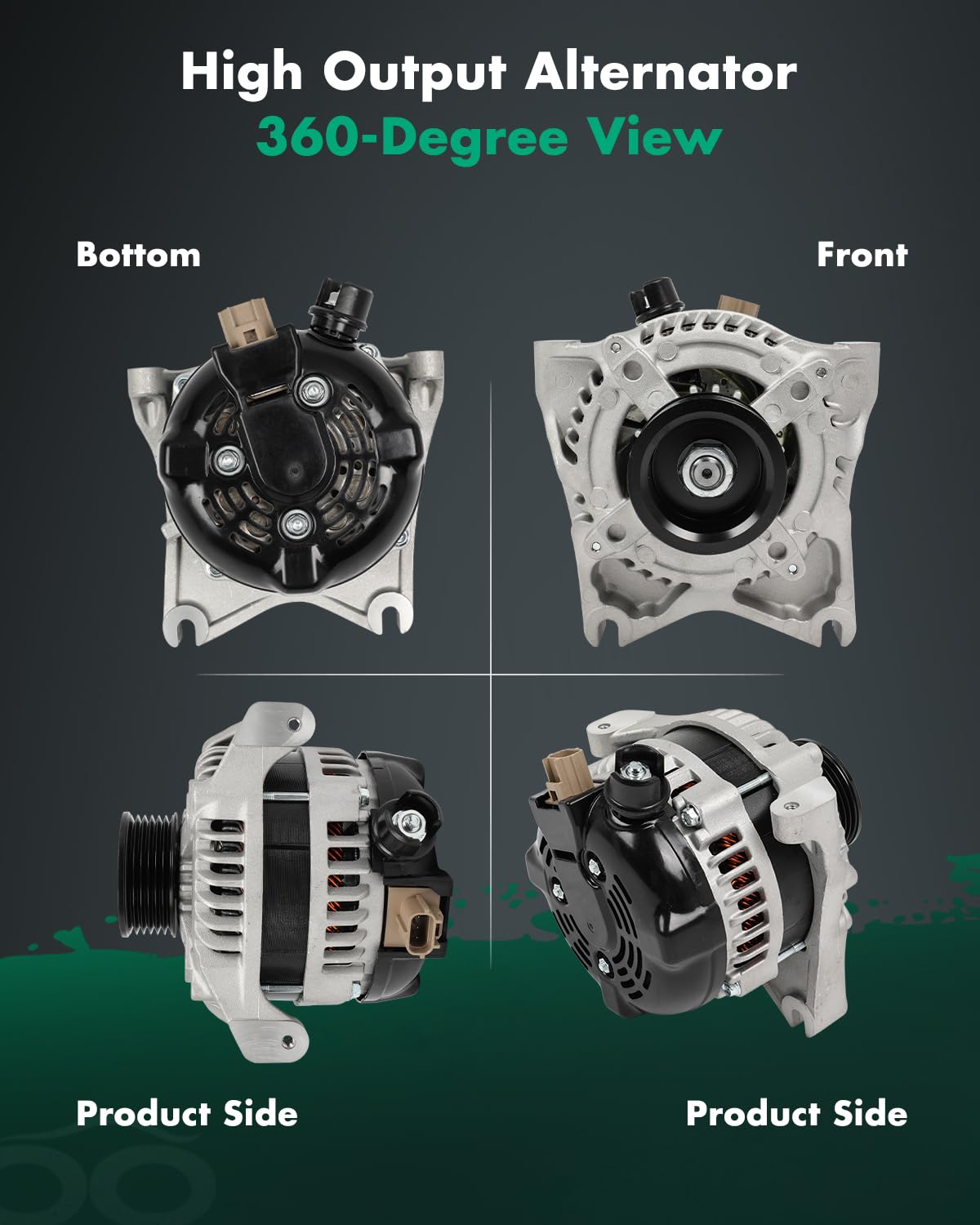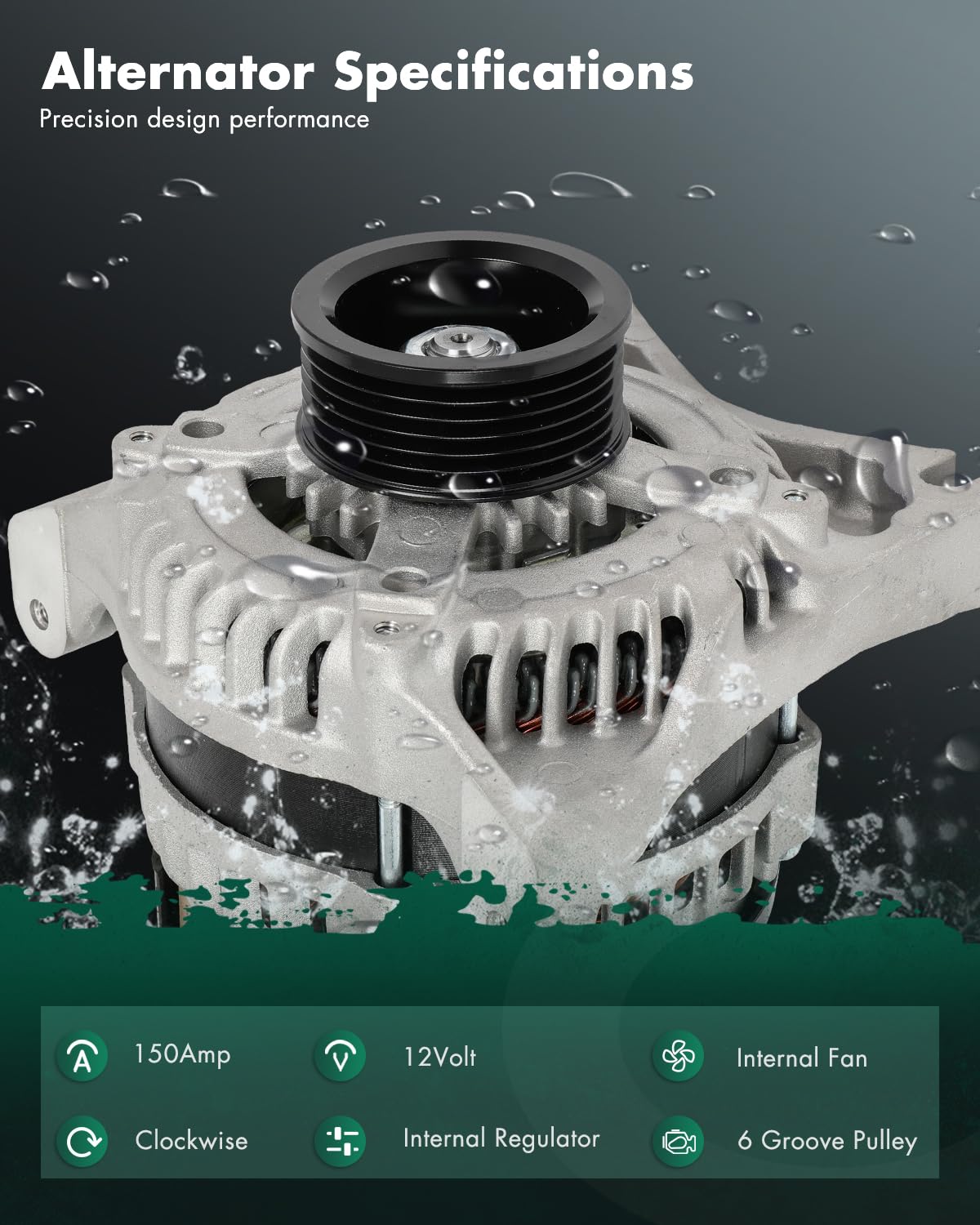 【Alternators Specifications】- Voltage: 12V; Amperage: 150Amp; Rotation: CW (Clockwise); Regulator: IR (Internal Regulator) ; Fan: IF (Internal Fan); Grooves: 6 Groove Pulley; Condition: New, high output alternator is compact and lightweight, fully compatible with the electronic system of your vehicle