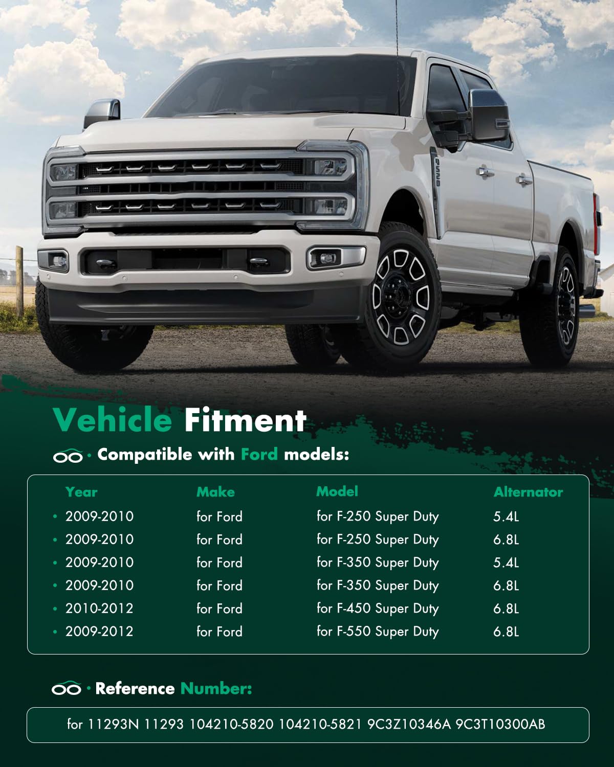 【Alternator Fitment】- Automotive new alternator replacement for Ford for F-250 Super Duty 5.4L 2009-2010,for Ford for F-250 Super Duty 6.8L 2009-2010,for Ford for F-350 Super Duty 5.4L 2009-2010,for Ford for F-350 Super Duty 6.8L 2009-2010,for Ford for F-450 Super Duty 6.8L 2010-2012,for Ford for F-550 Super Duty 6.8L 2009-2012