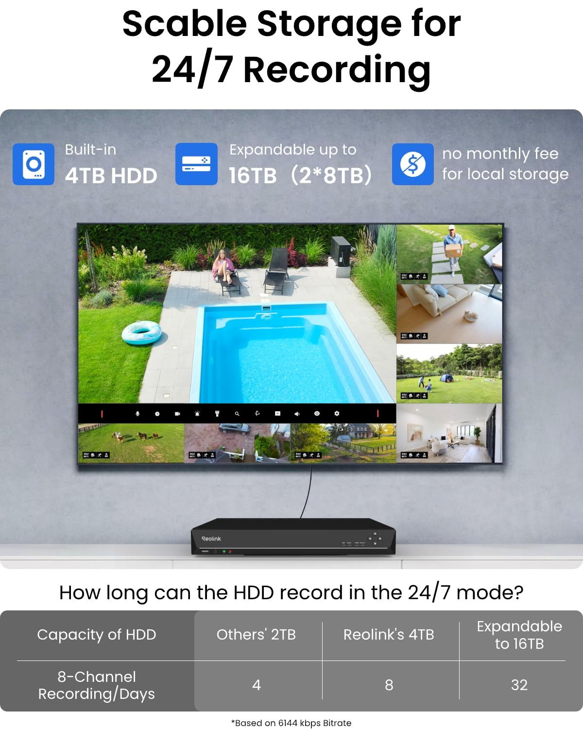 Reliable 24/7 Recording & Massive Storage - Comes with a pre-installed 4TB HDD for nonstop 24/7 or motion-triggered recording. Easily expand storage with an additional HDD (up to 8TB), supporting a total capacity of up to 16TB.