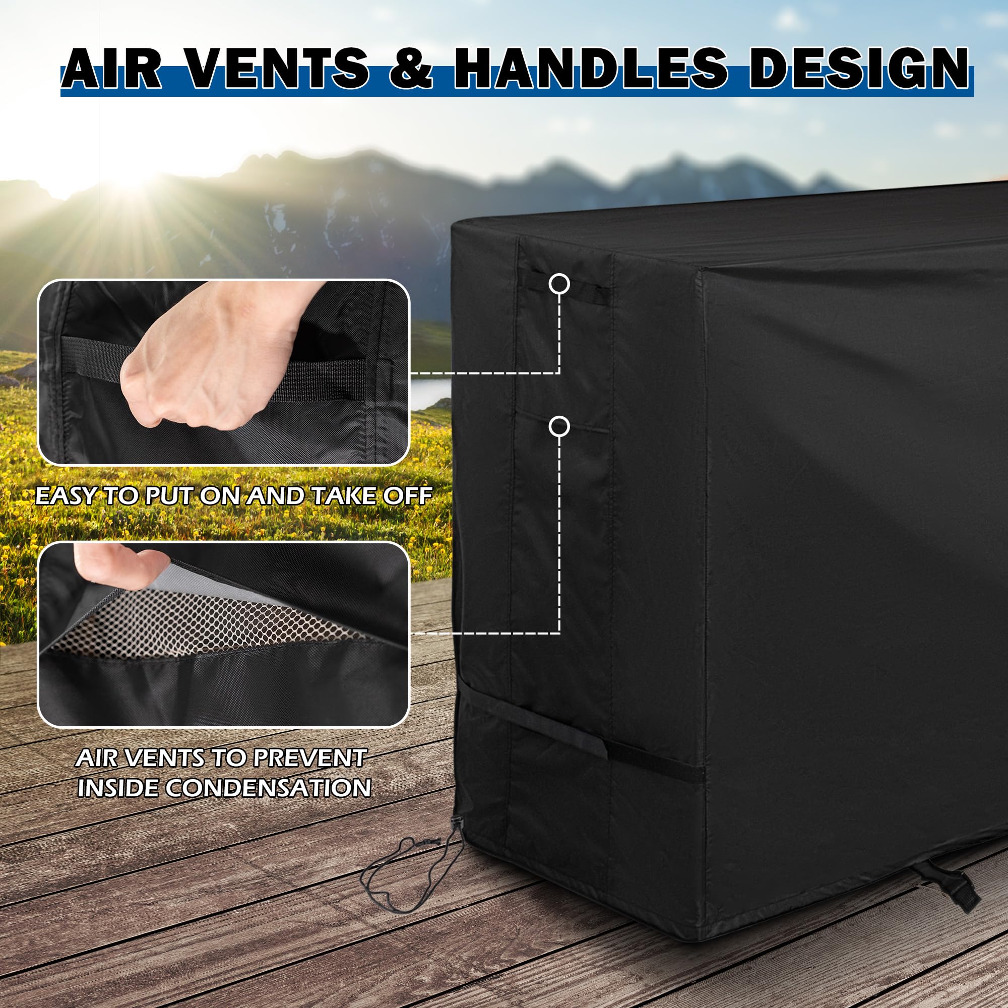 AIR VENT & HANDLES – The design of the air vents can improve the air flow to prevent inside condensation, keeping your outdoor grill dry and clean. Two reinforced handles make the grill cover easy to put on and take off