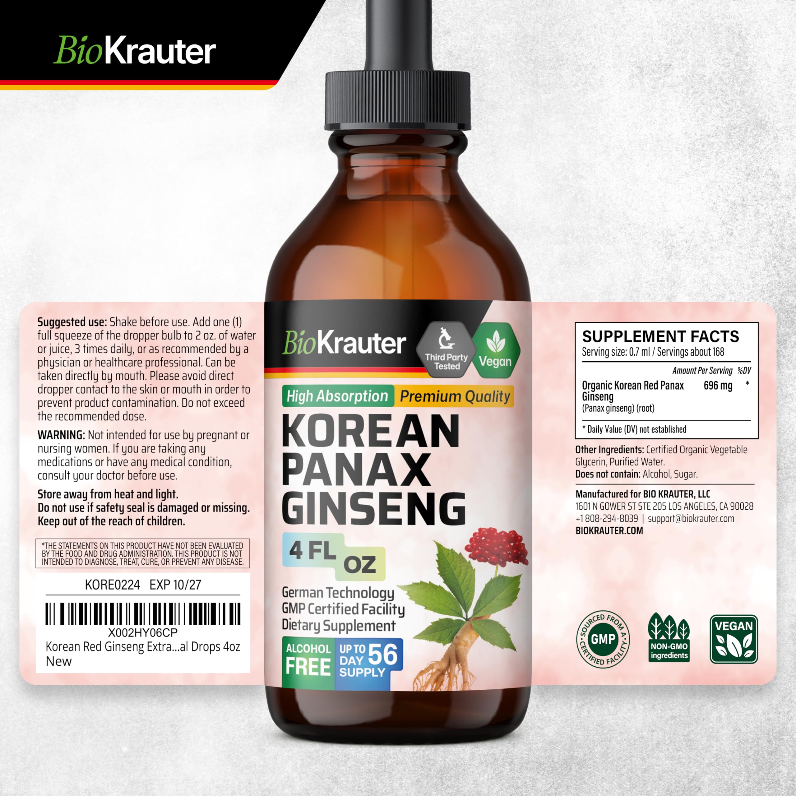 No Bitter Taste: Ginseng drops by BioKrauter are crafted with glycerin, which naturally eliminates bitterness, ensuring a smooth and pleasant flavor without the need for any added sugars.